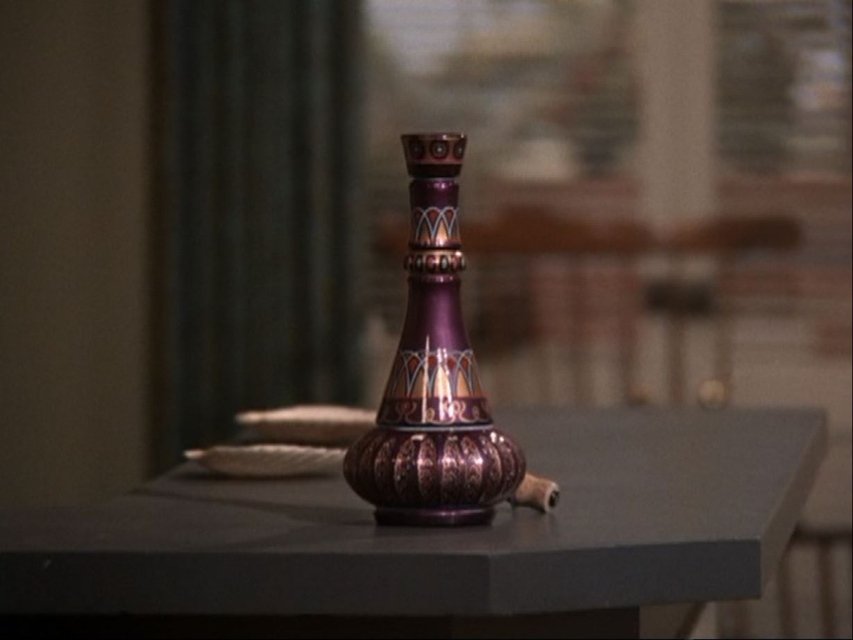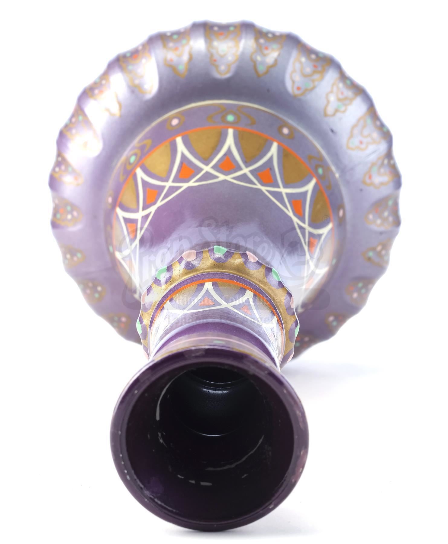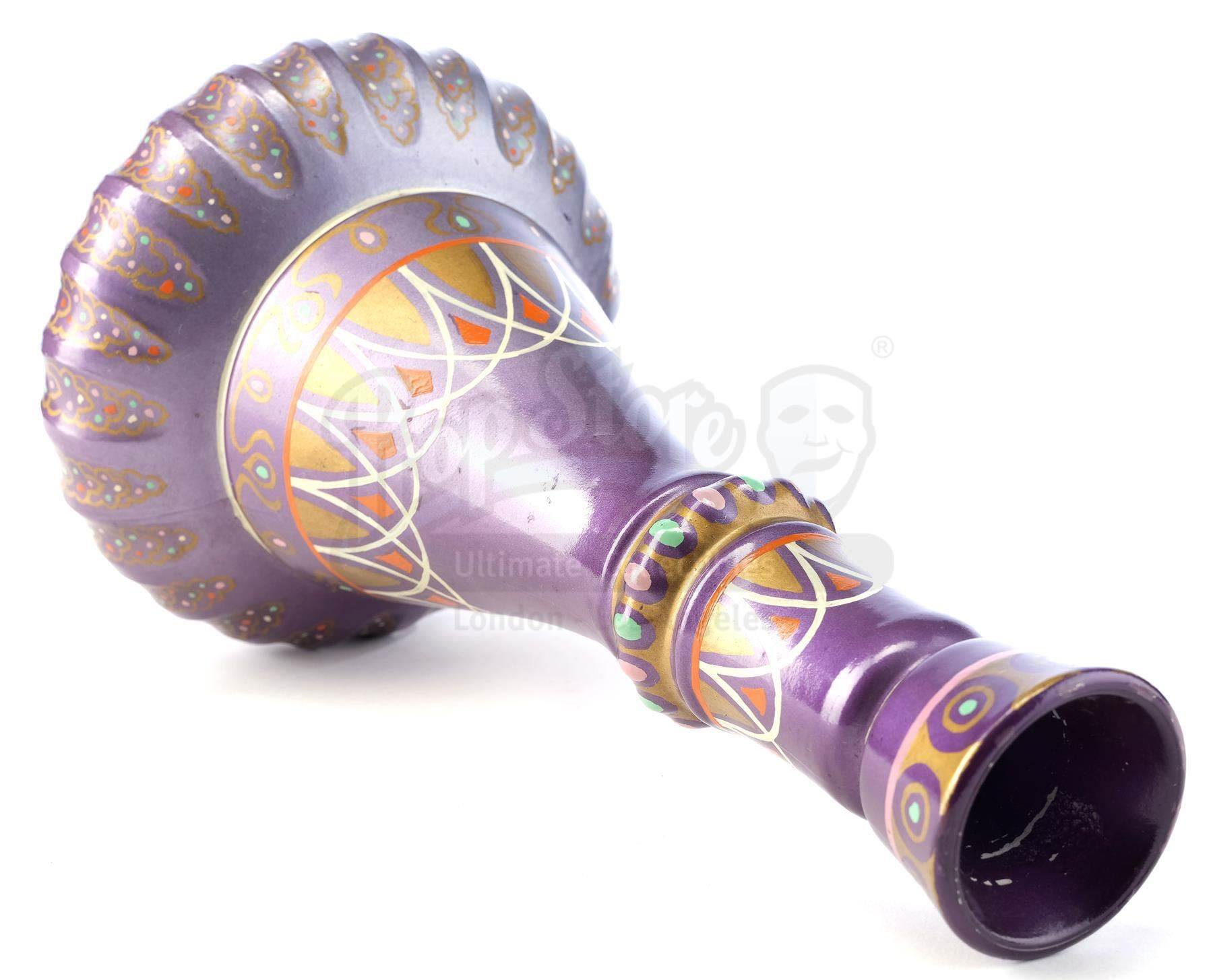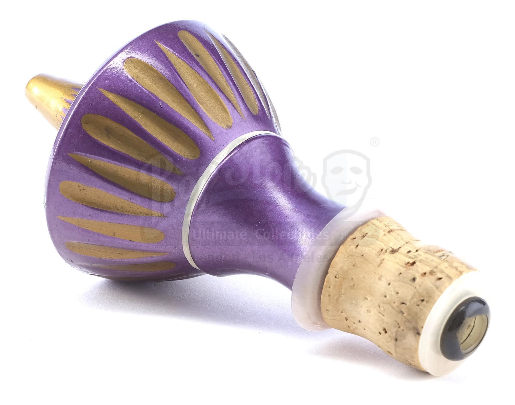 This lot will be auctioned on Tuesday, June 29th. The auction will begin at 9:00am PDT and lots are sold sequentially via live auctioneer; tune in to the live streaming broadcast on auction day to follow the pace. Note other lots in the auction may close on June 30th or July 1st. Jeannie's bottle from Seasons 2 through 5 of Sidney Sheldon's fantasy sitcom I Dream of Jeannie. Jeannie (Barbara Eden) is released from 2,000 years of imprisonment when her bottle is uncorked by astronaut Anthony Nelson (Larry Hagman) when his space capsule strays off course and he is marooned on a desert island. This bottle comes directly from the family of Clarence Peet, a 36-year prop master for Columbia Pictures, the parent company of Screen Gems, the television production subsidiary that produced I Dream of Jeannie. It includes a Letter of Authenticity from Peet's granddaughter. The lot consists of a glass 1964 Beam's Choice bourbon Christmas Decanter/bottle hand-finished in high-gloss enamel paint and with a hole cut in its base. The bottle has been intricately hand-painted with a purple base coat with white, orange, and gold-color details throughout, as well as multicolored specks and a cork and plastic top. The technique and style of the paintwork are consistent with other documented examples of original Jeannie bottles; there are subtle differences in the paint detailing to these other examples and the specific use of this bottle is unknown. While Jeannie bottles were made from modified real-world artifacts and many copies exist, this bottle's authenticity is established through the provenance attribution with Clarence Peet and the similarities to the other existing bottles. A prior version of this description cited that the bottle was used for SFX smoke effects and specifically attributed it to episode 2 of season 2; additional examination has determined this cannot be verified. However, the piece has been examined by I Dream of Jeannie historian Patterson Lundquist who agrees it is an original prop produced by the Columbia Prop Department. It exhibits signs of age and wear throughout, including minor paint chipping, but remains in excellent overall condition. Dimensions: 14" x 5" x 5" (37 cm x 12.75 cm x 12.75 cm) Estimate: $30,000 - 50,000
