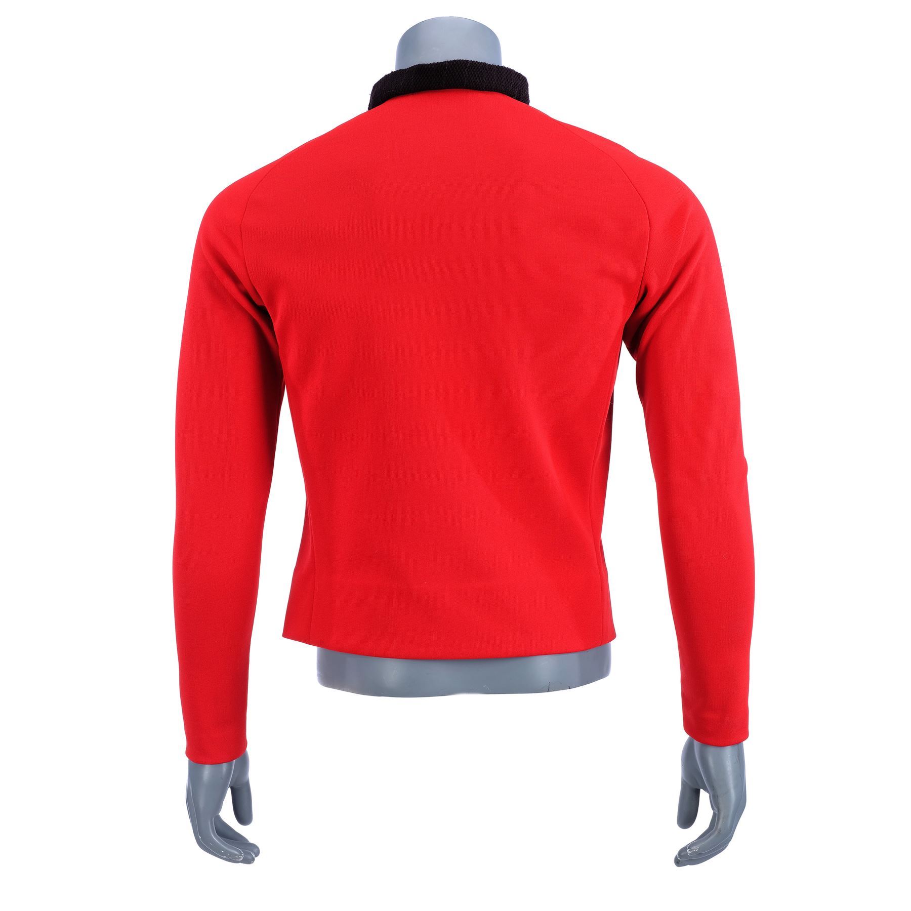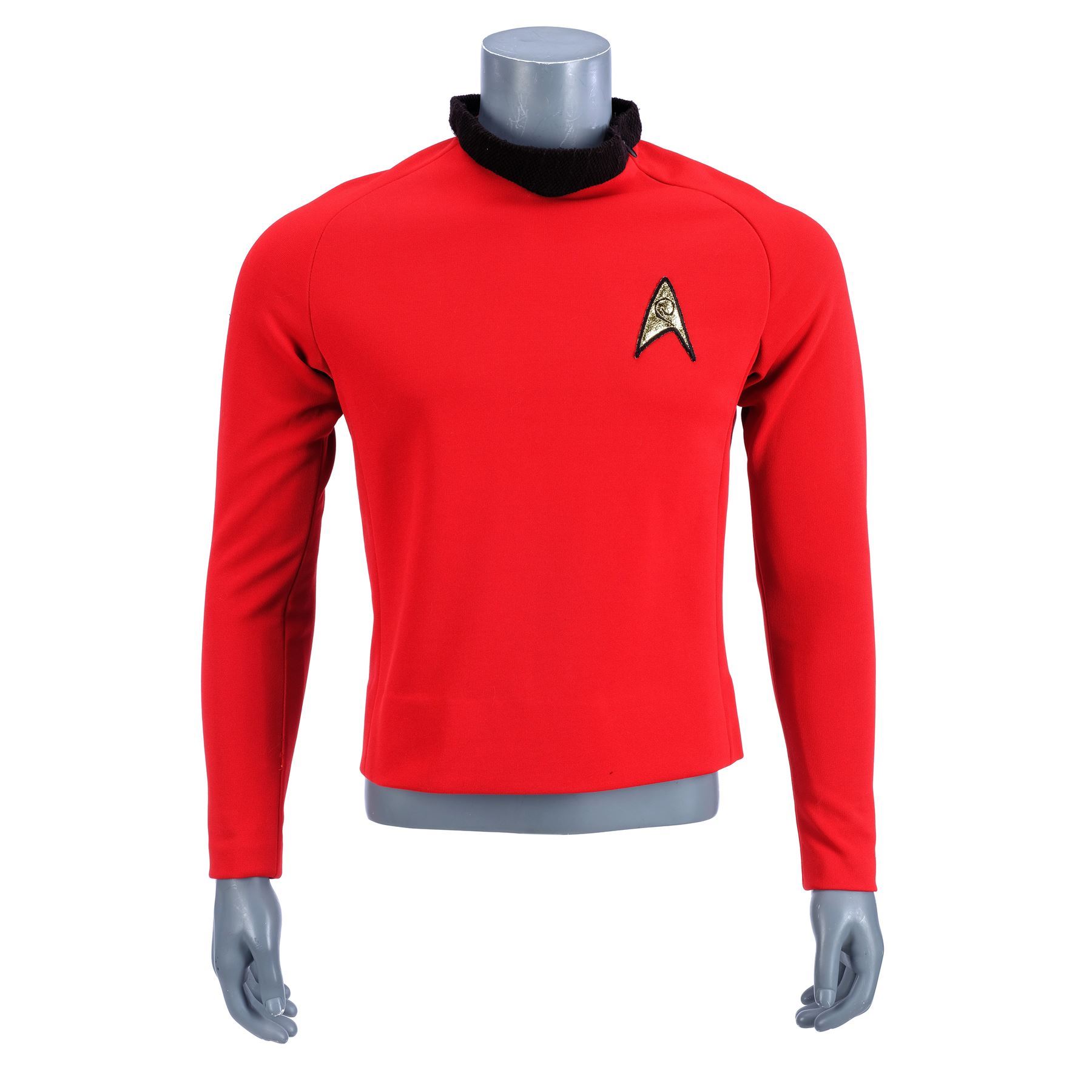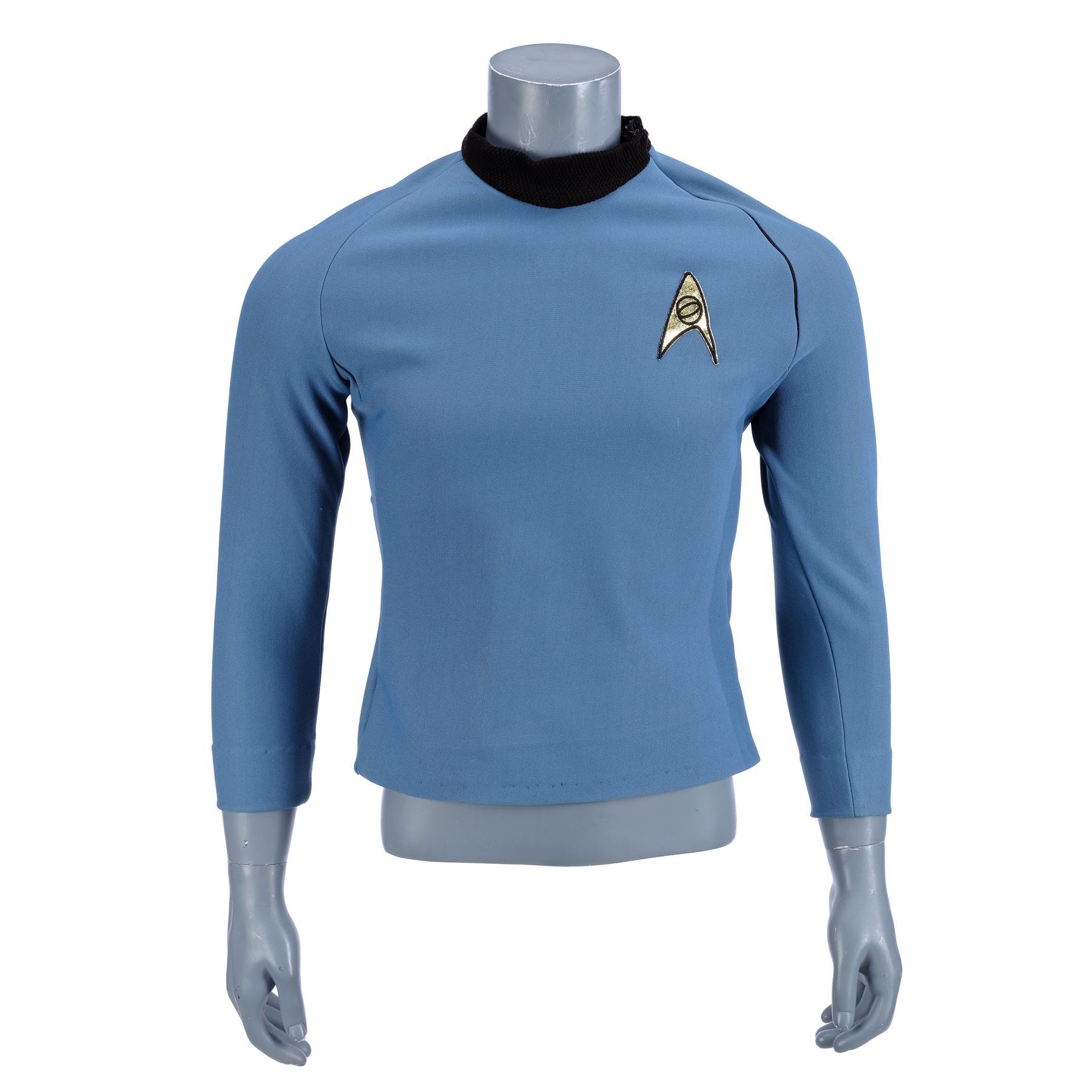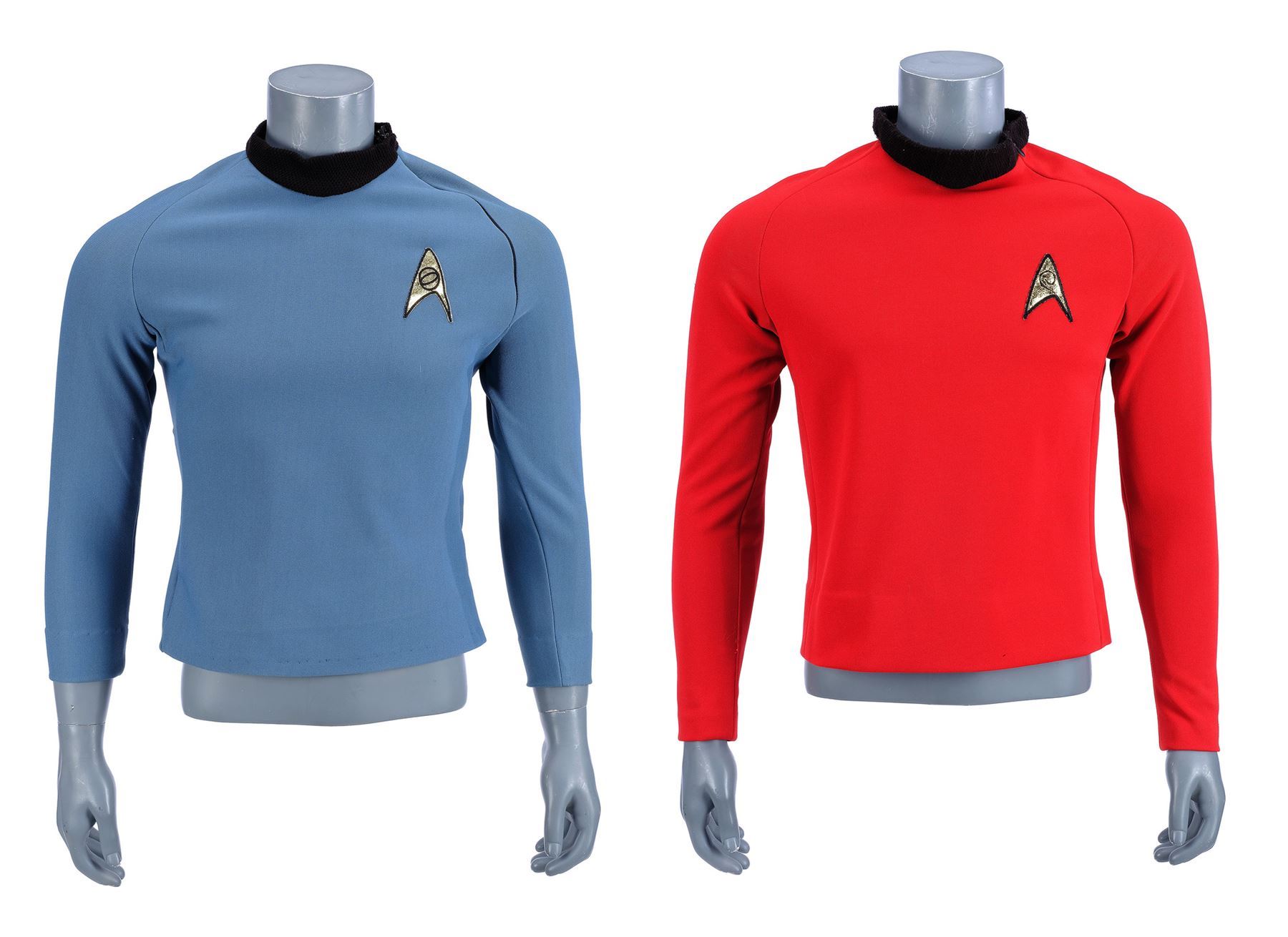 STAR TREK: DEEP SPACE NINE (1993-1999) - Pair of Science and Operations Divisions 23rd Century Starfleet Uniform Tunics - A pair of Science and Operations divisions 23rd Century Starfleet uniform tunics from the sci-fi television series Star Trek: Deep Space Nine. In the Season 5 episode "Trials and Tribble-ations," the Deep Space 9 crew wore 23rd Century uniforms to blend in amongst the crew of the Enterprise when they traveled back in time to the 2200s. This lot consists of two Spandex-blend tunics, one in blue with a gold-color Science division assignment patch and one in red with a gold-color Operations division assignment patch, both with hidden shoulder-seam zippers. The tunics exhibit minimal signs of wear from production, including loose threads in the collars.