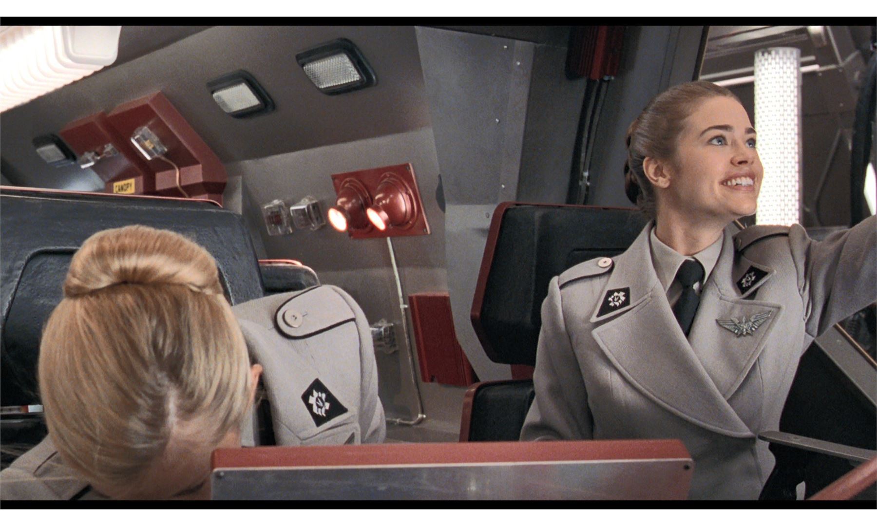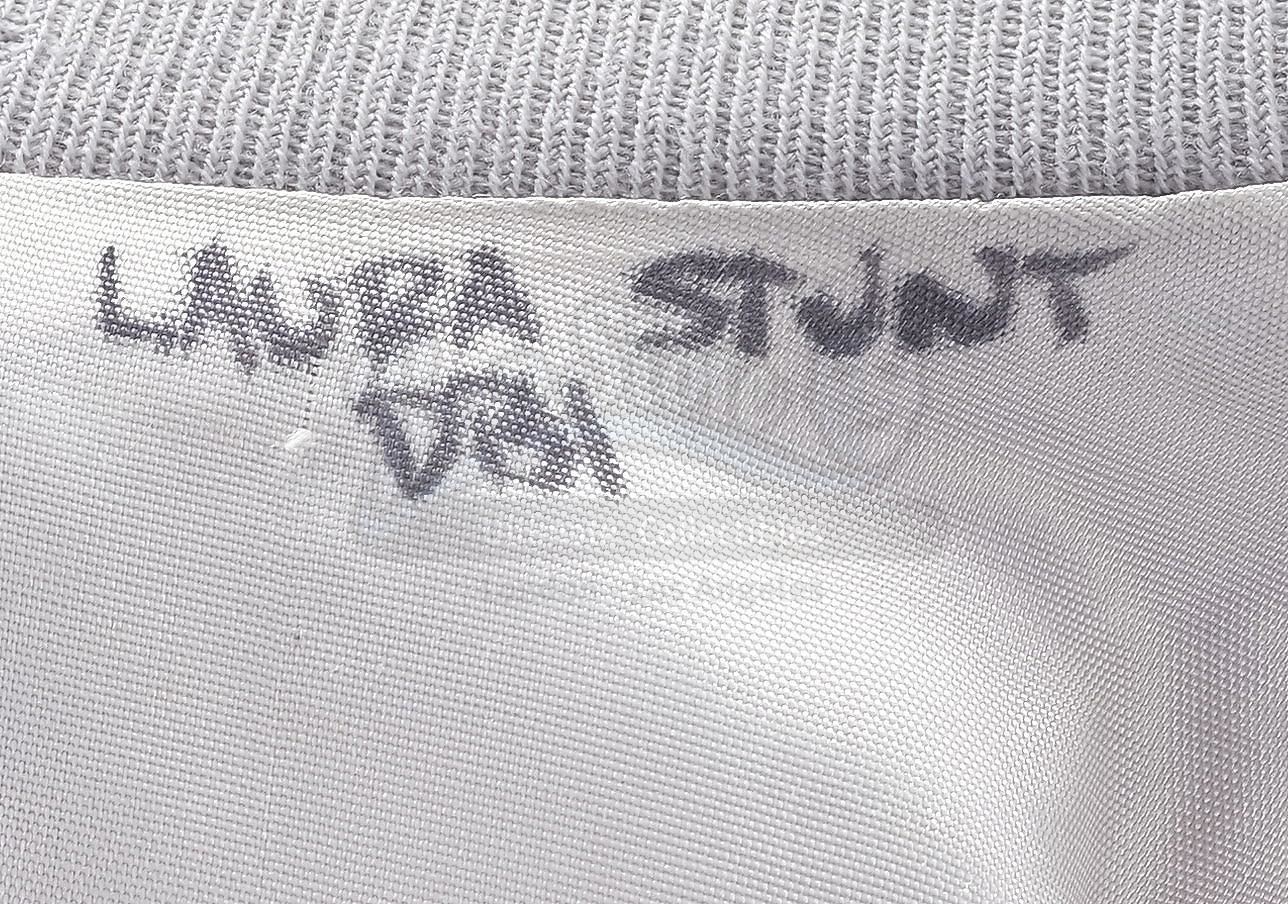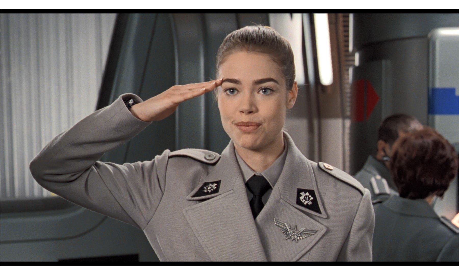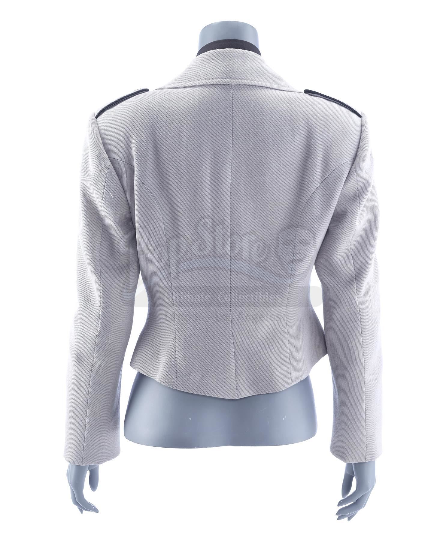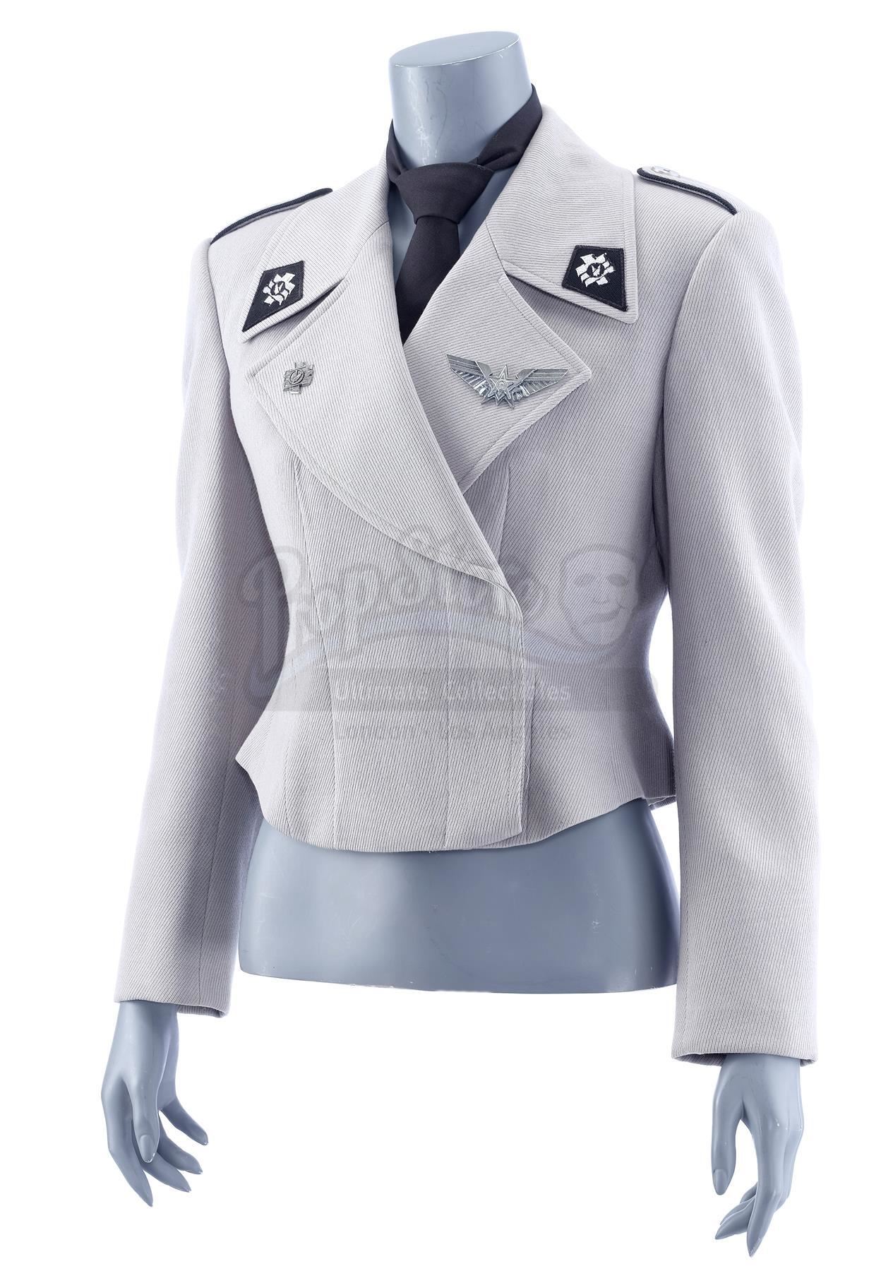 This lot will be auctioned on Thursday, July 1st. The auction will begin at 9:00am PDT and lots are sold sequentially via live auctioneer; tune in to the live streaming broadcast on auction day to follow the pace. Note other lots in the auction may close on June 29th or June 30th. A stunt Carmen Ibanez (Denise Richards) UCF fleet jacket and tie from Paul Verhoeven's sci-fi satire Starship Troopers. Federation Fleet pilot Ibanez wore her standard-issue jacket and tie while engaging in missions for the aerospace warfare service division. This lot consists of a gray button-up polyester and wool blend jacket marked "Laura Stunt Dbl" with epaulets on the shoulders, emblazoned fleet patches, and a pair of metal pins affixed to the lapels, as well as a black cotton blend tie. It exhibits minor signs of wear from production including some staining on the interior, but remains in excellent overall condition. Estimate: $800 - 1,200
