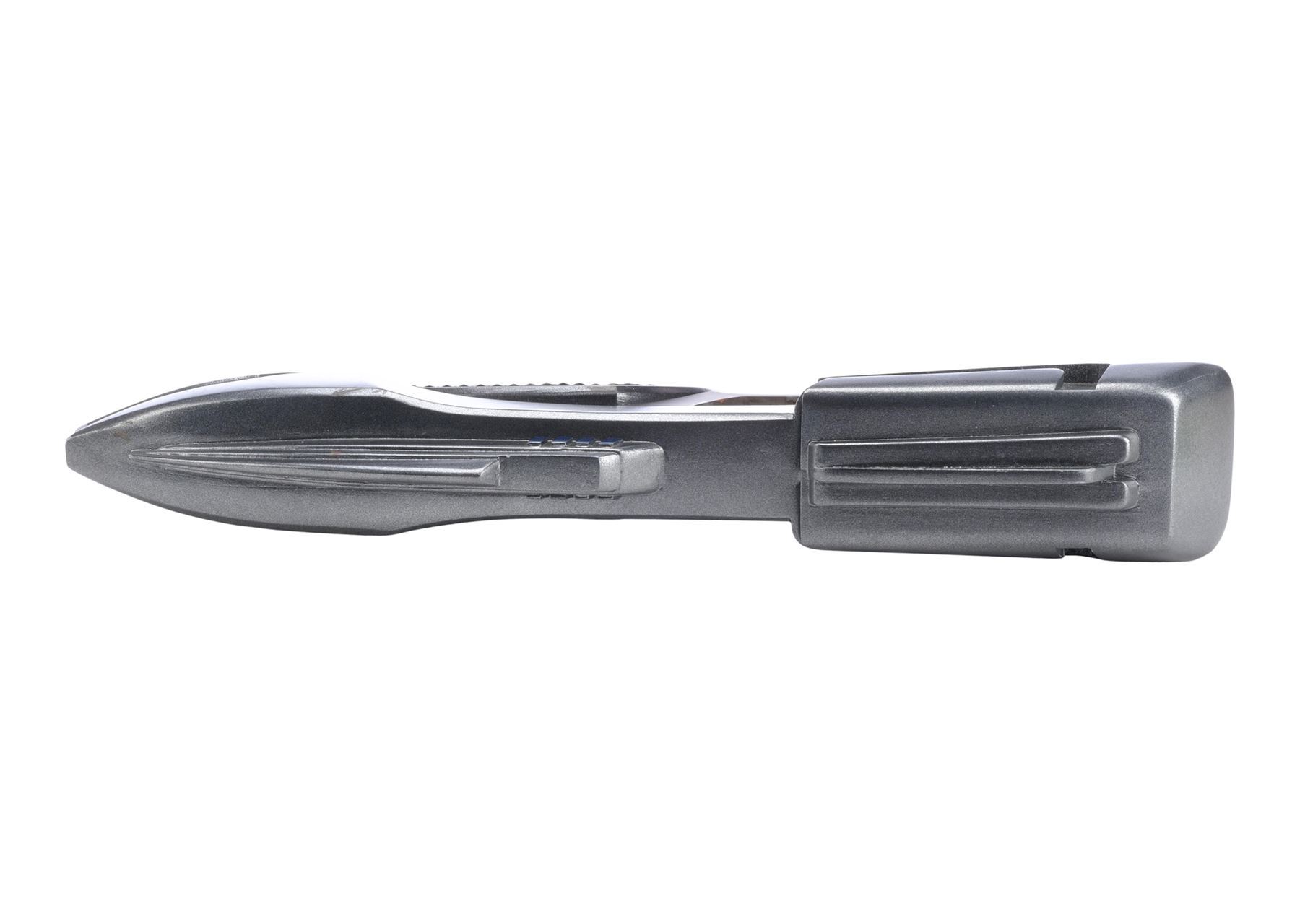 This otherworldly resin rifle is painted metallic gray with a matte black textured grip, static blue paneling, and copper-color detailing on the body and barrel. It exhibits adhesive residue on the left side and various minor chips to the paint from production use, exposing the resin throughout. Dimensions: 19" x 9" x 3" (48.25 cm x 23 cm x 7.75 cm)