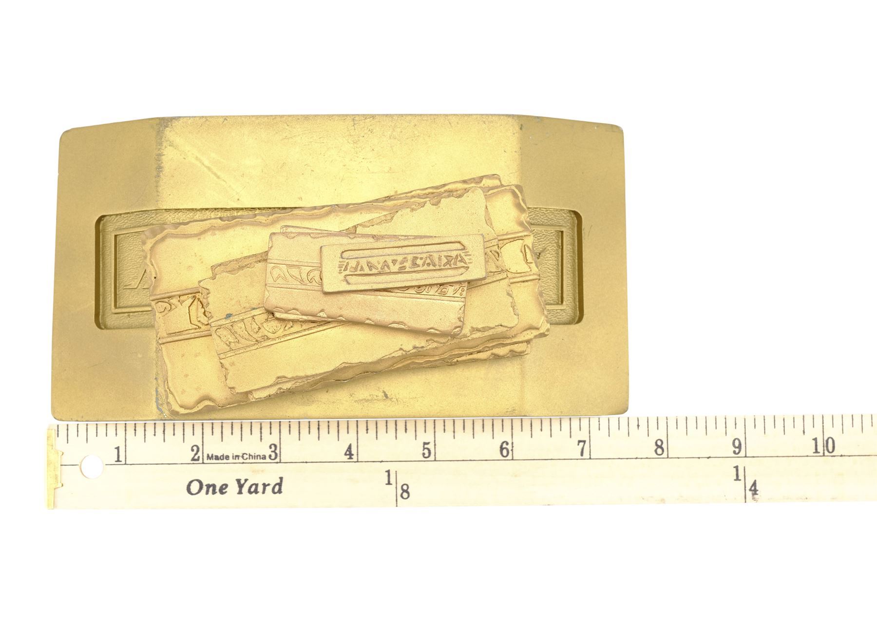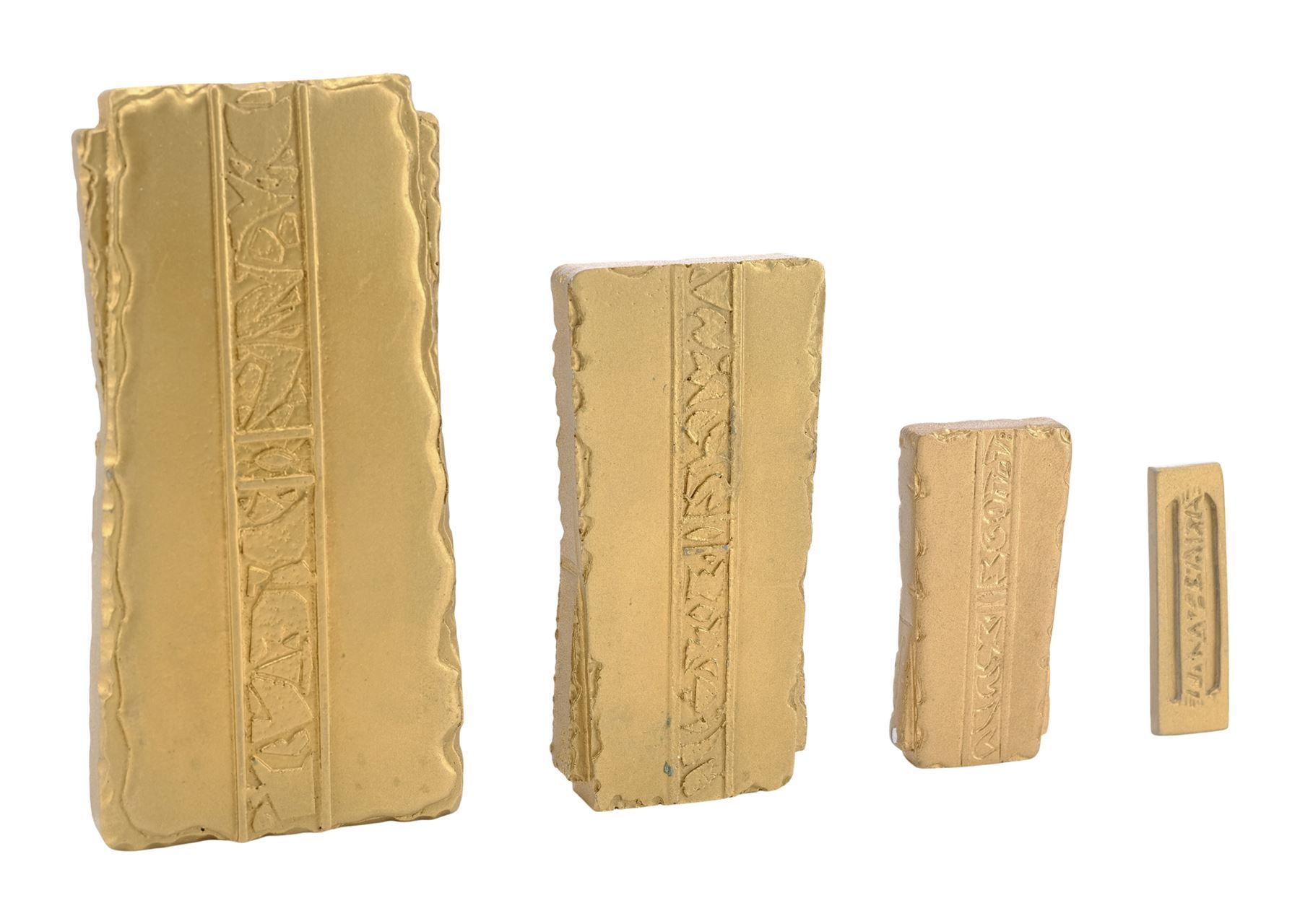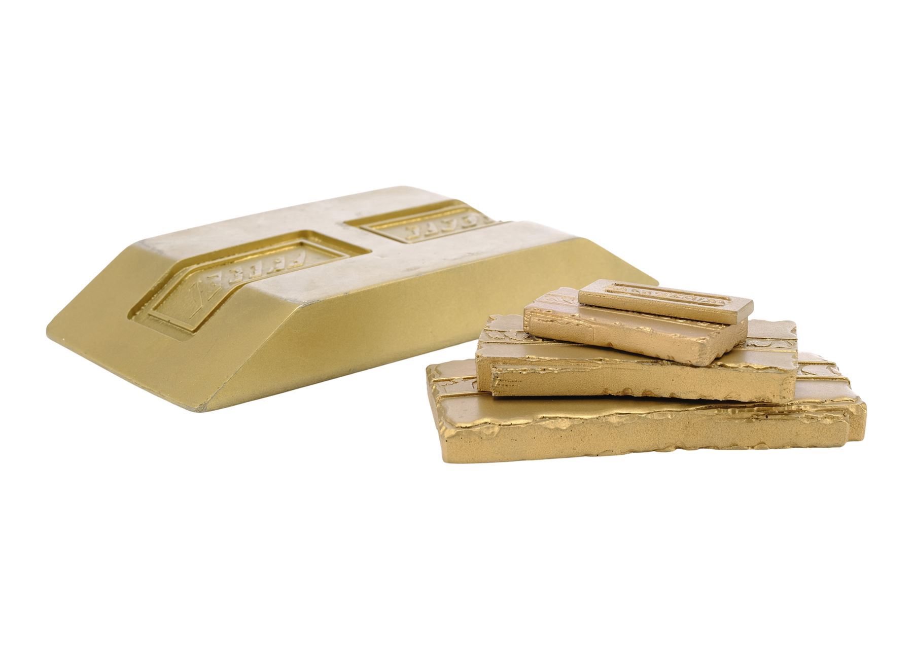 This assortment consists of five pieces, exemplifying the different denominations used in the series: a slip, a strip, two bars of different sizes, and a brick. Each set is painted varying shades of gold-color and cast in resin, with unique engravings in the center. They exhibit minimal scuffs, scratching, chipping, pitting and edge wear. Dimensions: (packaged) 8" x 4" x 4" (20.5 cm x 10.25 cm x 10.25 cm)