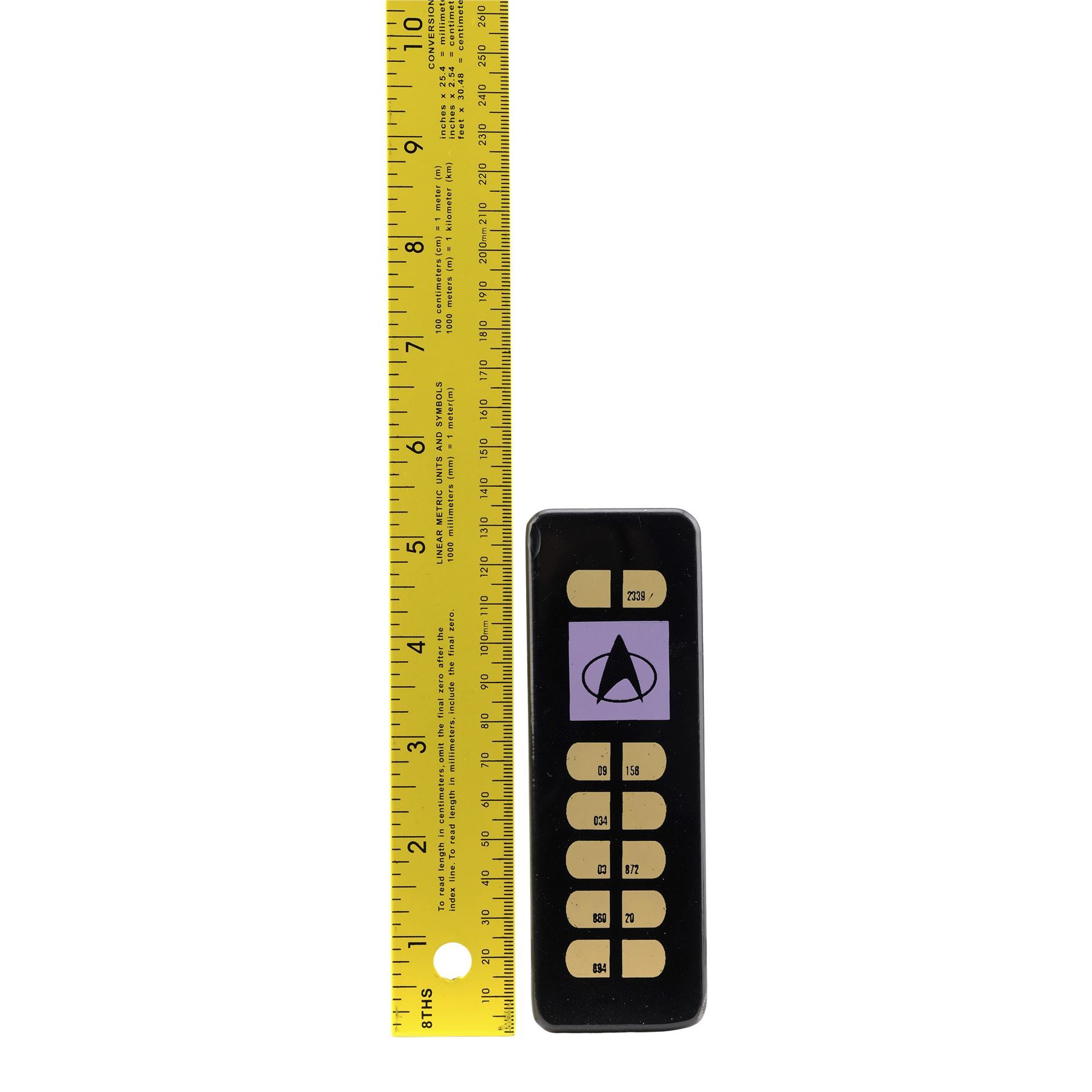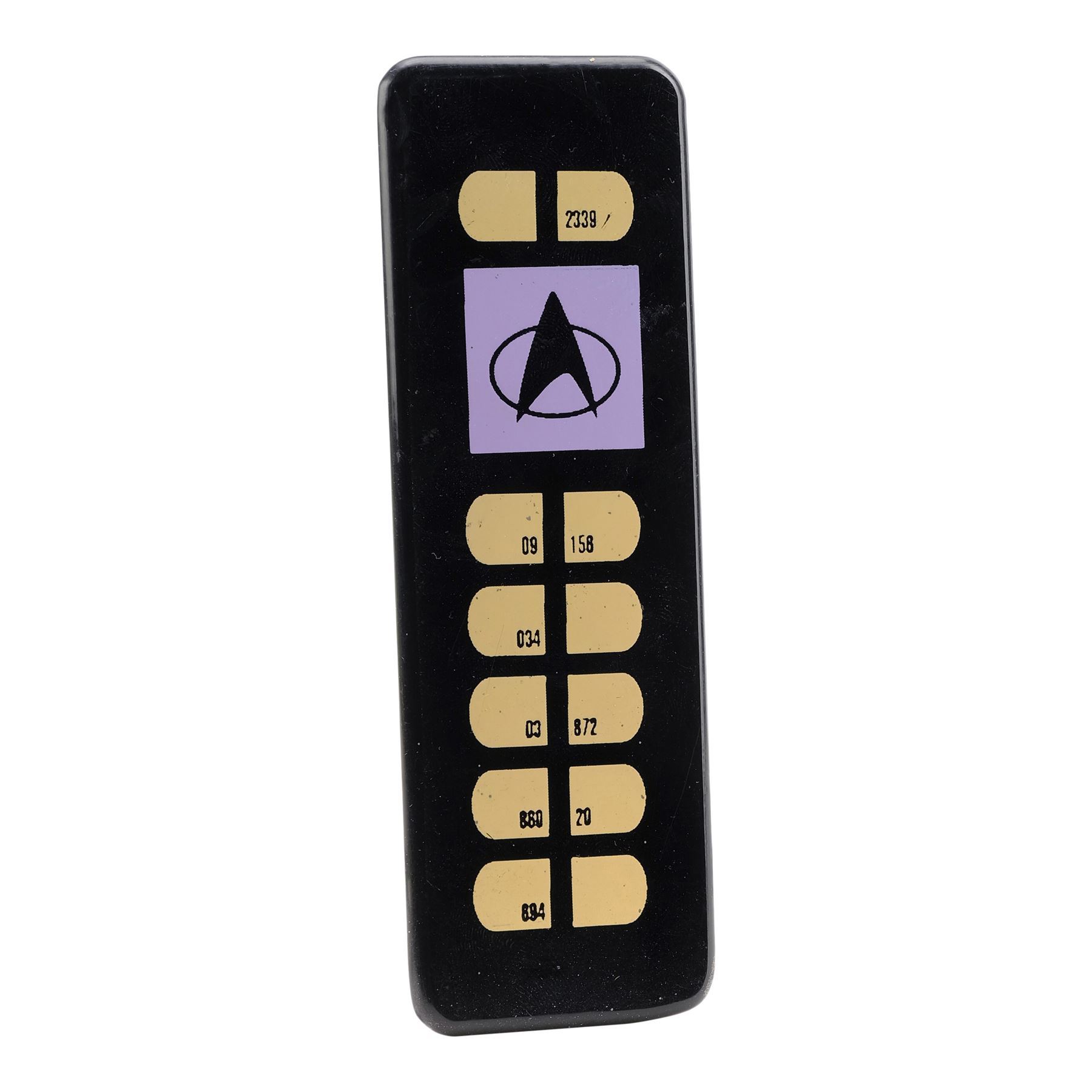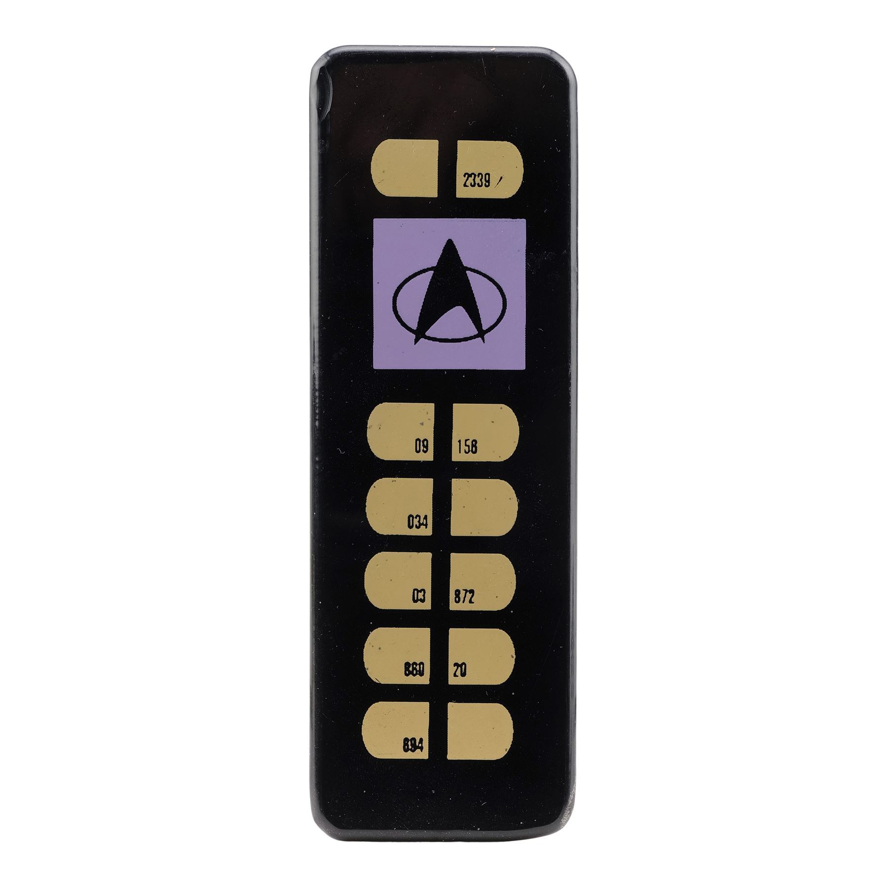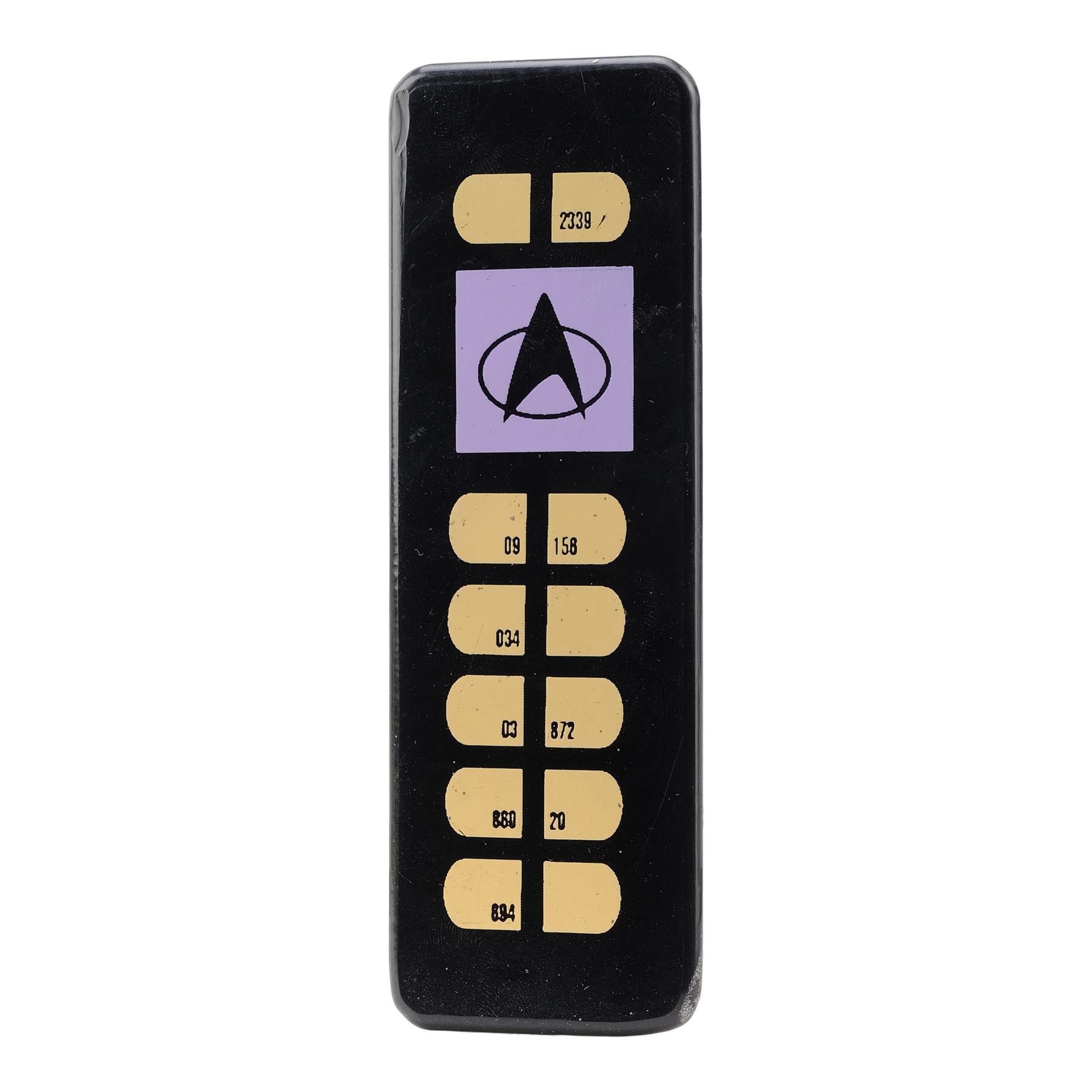 This lot consists of a black acrylic rectangular panel with numbered yellow button graphics and a purple Starfleet logo graphic. It exhibits scuffing and scratching from use and age, including some through the buttons. Dimensions: 1.75" x 5.25" x 0.25" (4.5 cm x 13.5 cm x 0.75 cm)
