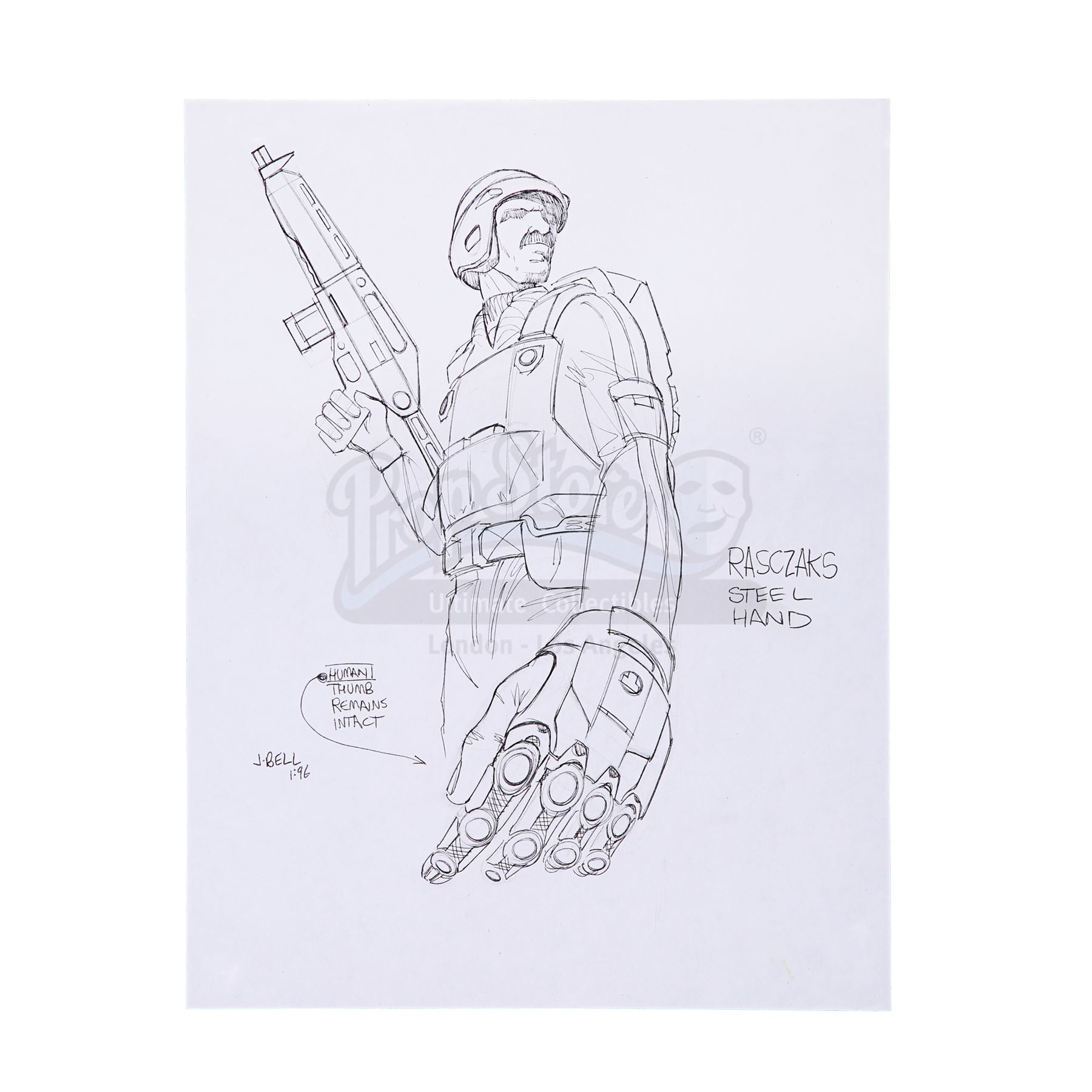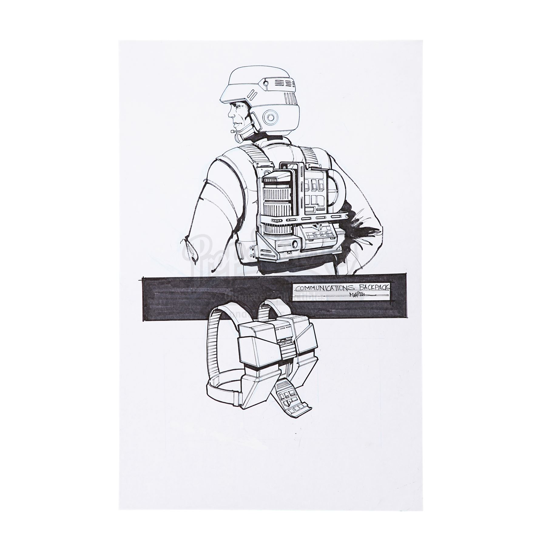 This lot will be auctioned on Thursday, July 1st. The auction will begin at 9:00am PDT and lots are sold sequentially via live auctioneer; tune in to the live streaming broadcast on auction day to follow the pace. Note other lots in the auction may close on June 29th or June 30th. A collection of five hand-drawn pieces of concept art from Paul Verhoeven's sci-fi action film Starship Troopers. This set consists of five pieces of concept art depicting soldiers, including Lt. Rasczak (Michael Ironside). Four of the pieces are printed with hand-drawn additions and corrections by Jim Martin, while the Rasczak illustration is entirely hand-drawn by John Bell. The artwork has some wear from production use and age, including some light smudging and wear to the corners, but remain overall in excellent overall condition. Dimensions (largest) 11" x 17" (28 cm x 43 cm) Sold without copyright; see copyright notice in the Buyer's Guide. Estimate: $600 - 800