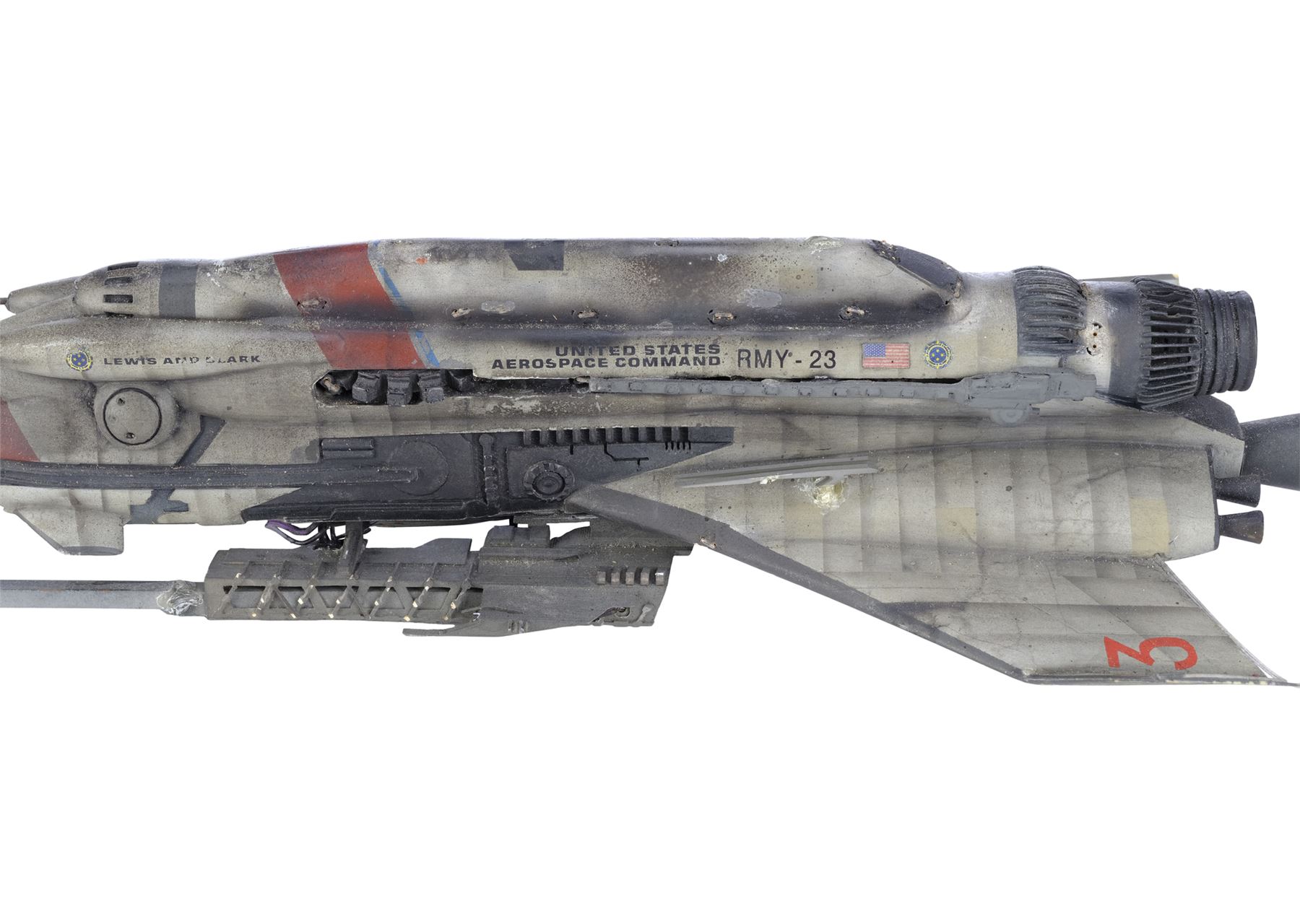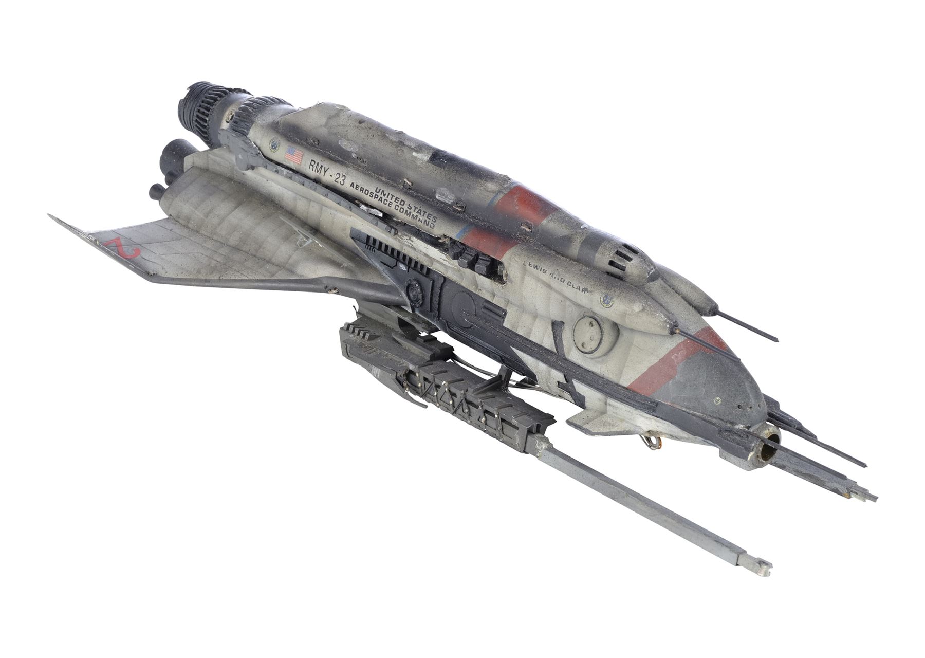 Created for use in shooting the Lewis and Clark and Event Horizon spacecrafts in the same set up, this small-scale black and grey painted plastic model miniature jet features metal blaster prongs, "23" in red vinyl on the wings, "Lewis and Clark" and "United States Aerospace Command RMY 23" in black vinyl along the sides, as well as a black vinyl "USAC" on the underside. This model miniature is wired for electronics, including lighting elements built into the nose, engines, and body, with wires running out the underside and a bottom plate that would be removed to access interior electronics. It features a mounting point with a metal tube at the front of the ship and holes throughout the underside where it may have been hung on wires. This lot exhibits intentional distressing from production, sympathetic repairs to the underside panels and fins, and the electronics remain untested. Dimensions: 37 cm x 16 cm x 10.25 cm (14.5" x 6.25" x 4")