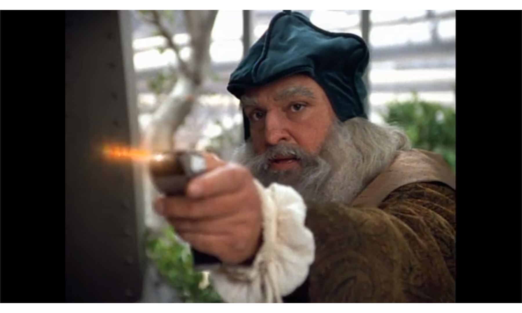 This stunt phaser is constructed from soft foam rubber molded and painted to appear concealed inside a textured black leather holster. It features three static buttons on top painted white and silver-color to match the body and a fastening strip for securing to a costume glued onto the bottom. The phaser exhibits visible cracking and adhesive residue from production. Dimensions: 8" x 2" x 2" (20.5 cm x 5 cm x 5 cm)