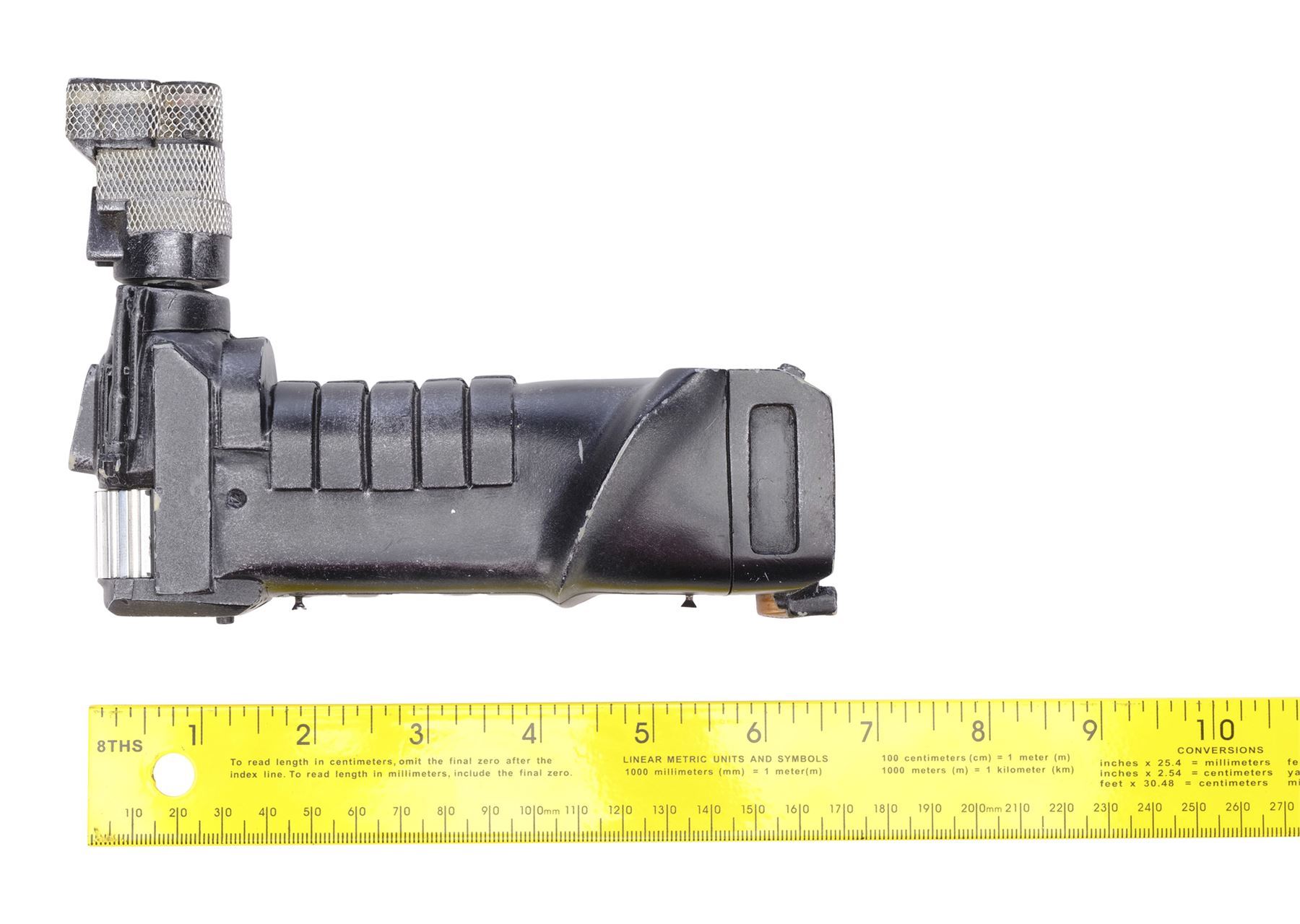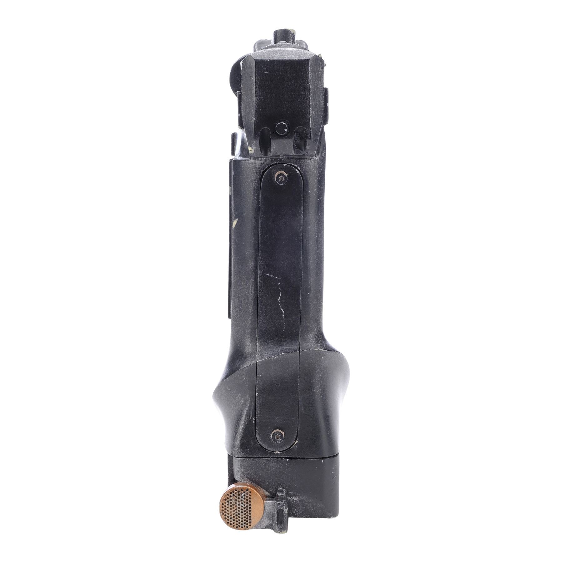 This lot consists of a cast resin textured handle painted black with a copper-color circle on the bottom and metal embellishments. Frontal lights are powered by two N-size 1.5 volt batteries inserted beneath a battery cover. It exhibits scuffing to the painted finish from use and age, and current electronic functionality remains untested . Dimensions: 7" x 4.75" x 2" (18 cm x 12.25 cm x 5.25 cm)