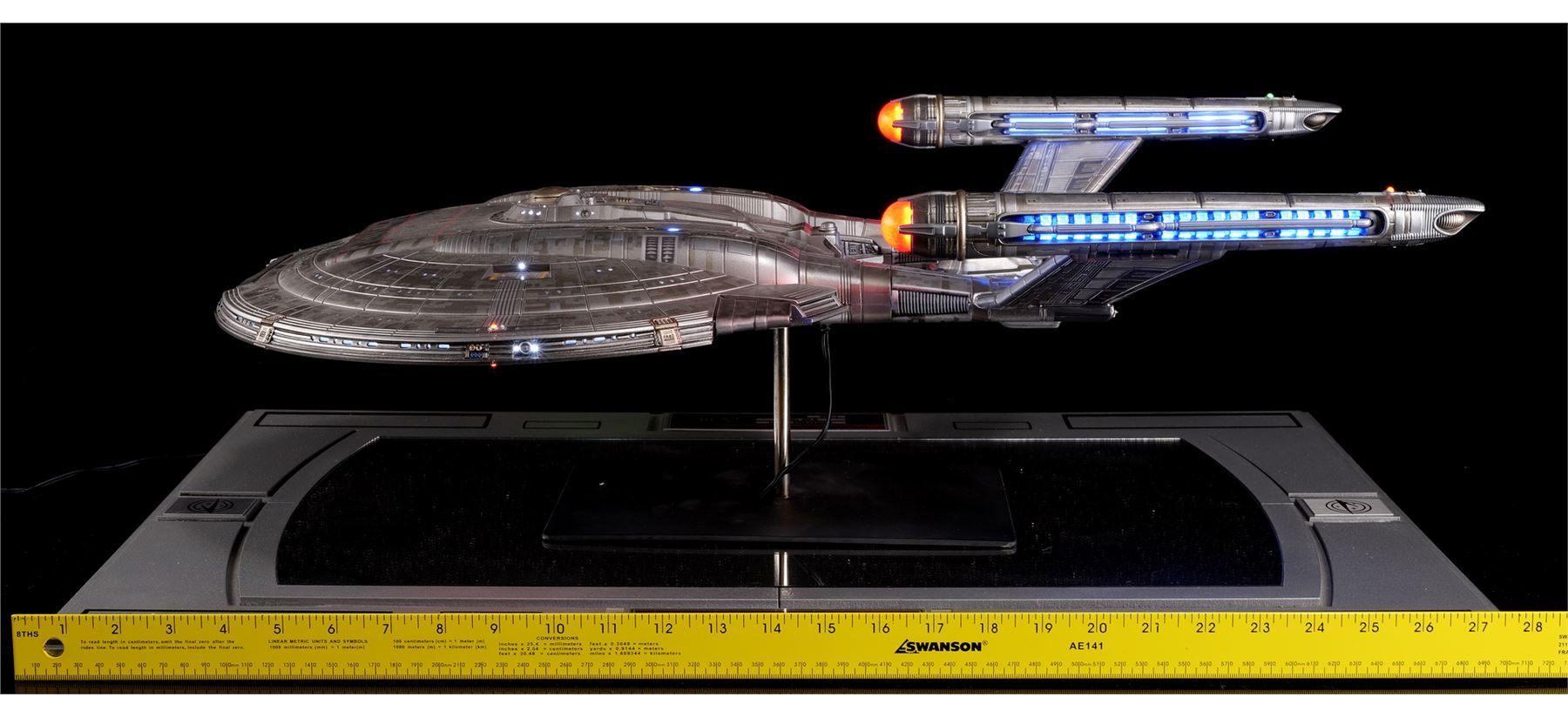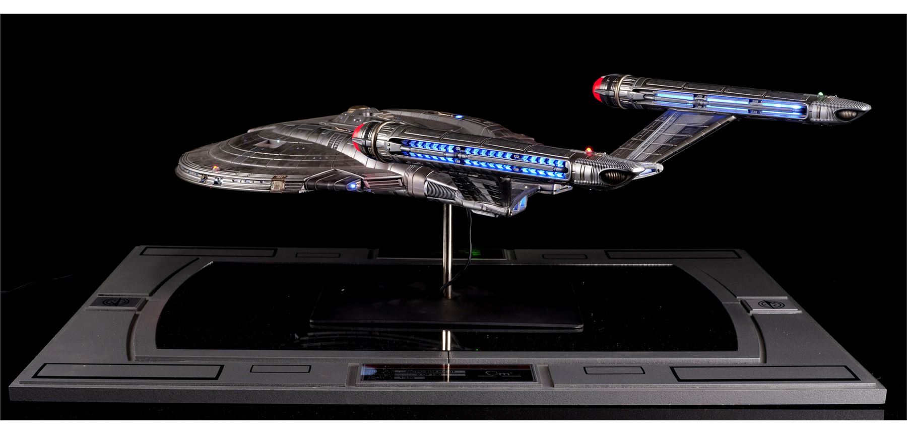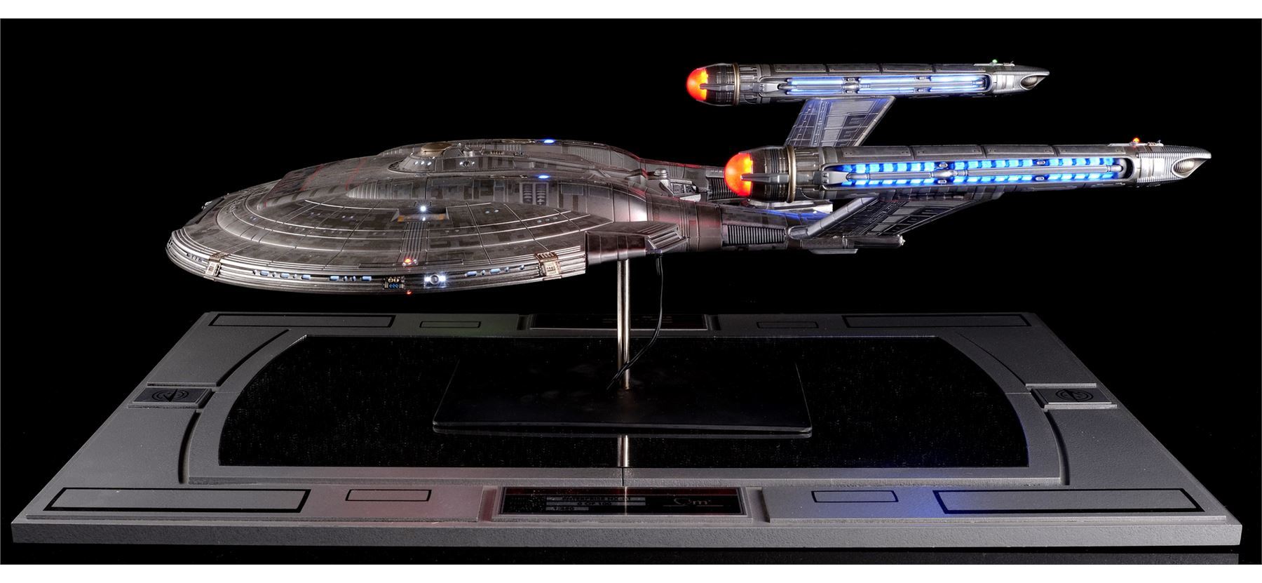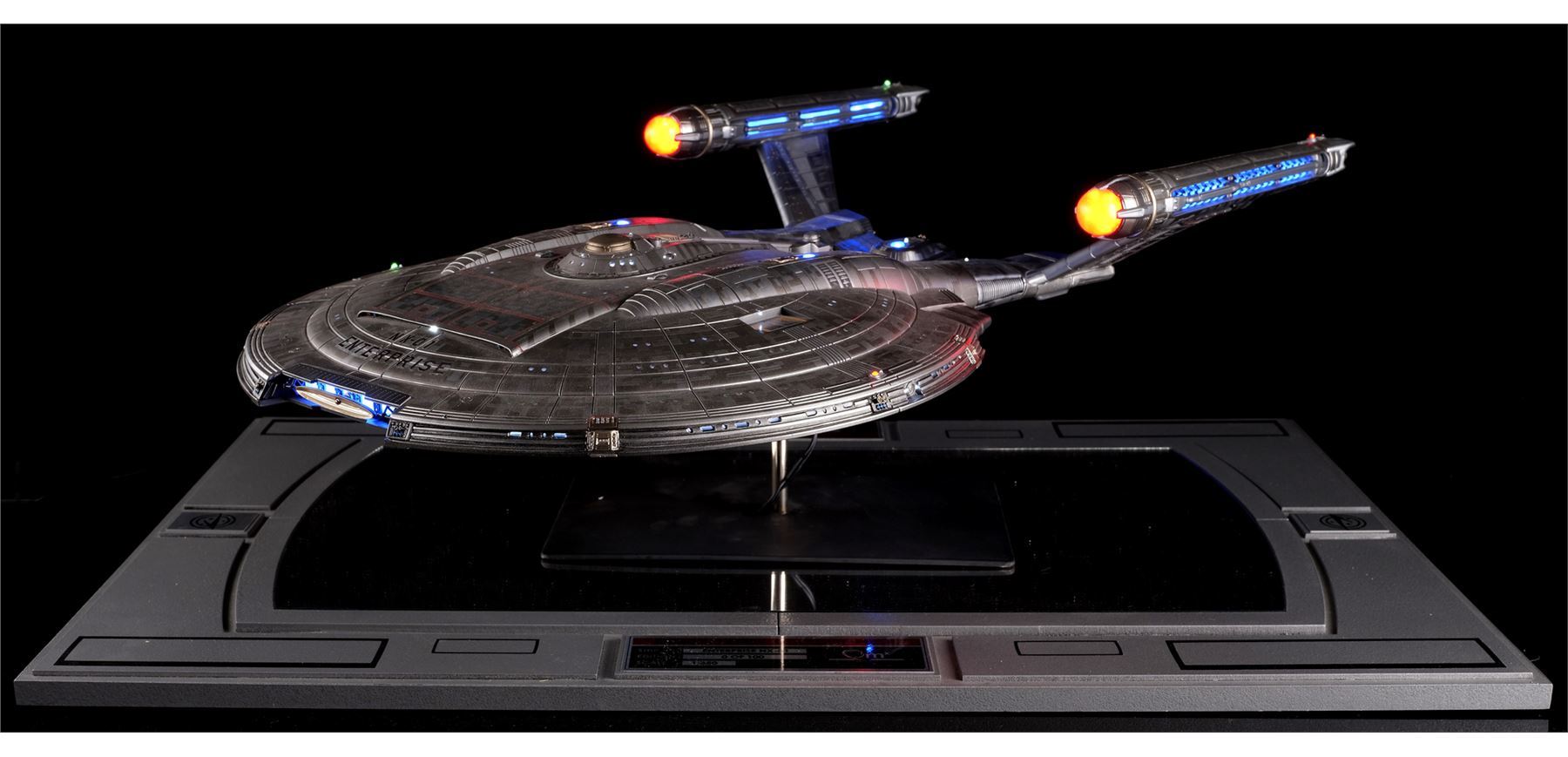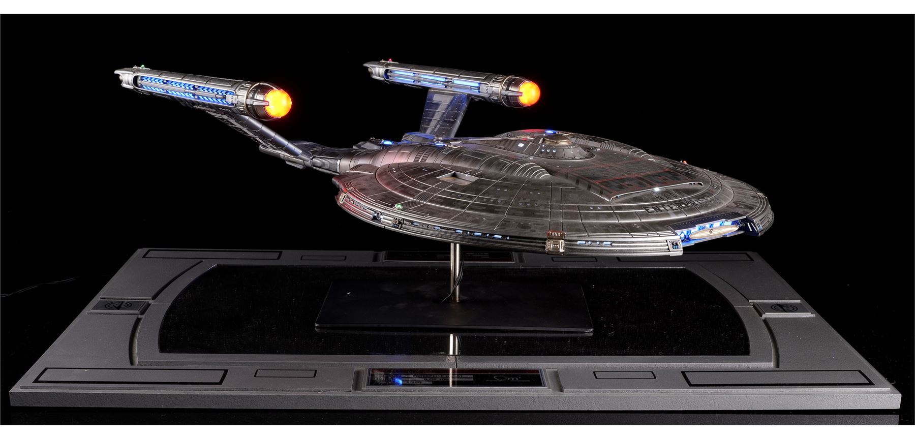 This lot consists of the 1:350 scale model Quantum Mechanix (QMx) convention display and sales page photography model constructed of polystyrene, acrylic, and polyresin. It features a metallic enamel painted exterior. 150 LED lights emulate functioning engines, formation signals, and windows; backed by sound features for phasers and torpedoes, controlled via a keyless fob attached to a clear acrylic "Starfleet" logo. The miniature mounts via metal pole to an MDF base featuring two aluminum Starfleet logo plaques, one unsigned, the other featuring "QMx FX Cinema Arts" and "0 of 100." An egg crate-padded wood shipping crate is included. The lot exhibits scuffing, scratching, and edge wear. Dimensions: (on base) 28" x 18" x 9" (71.25 x 45.75 cm x 23 cm)