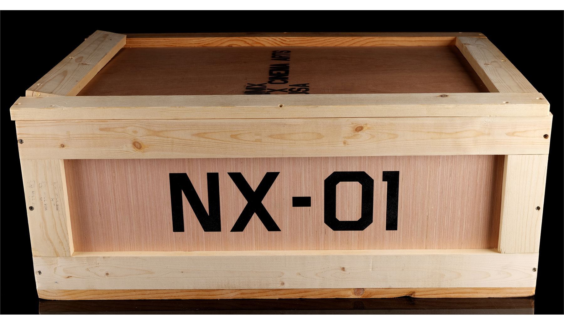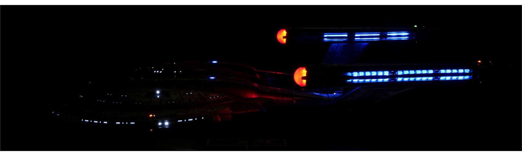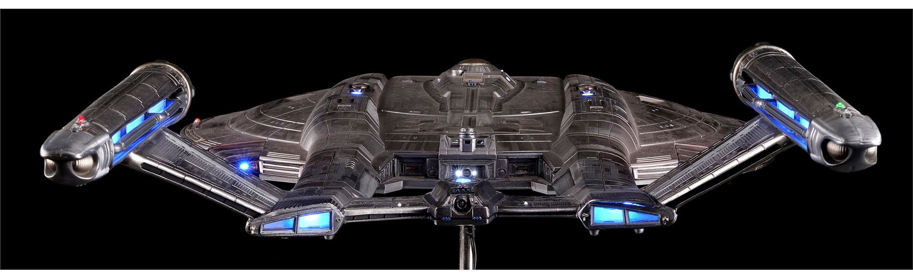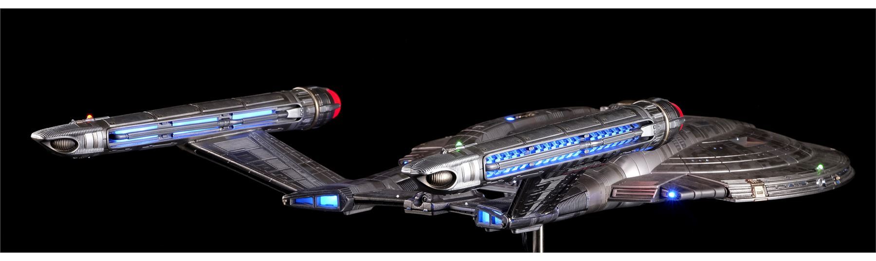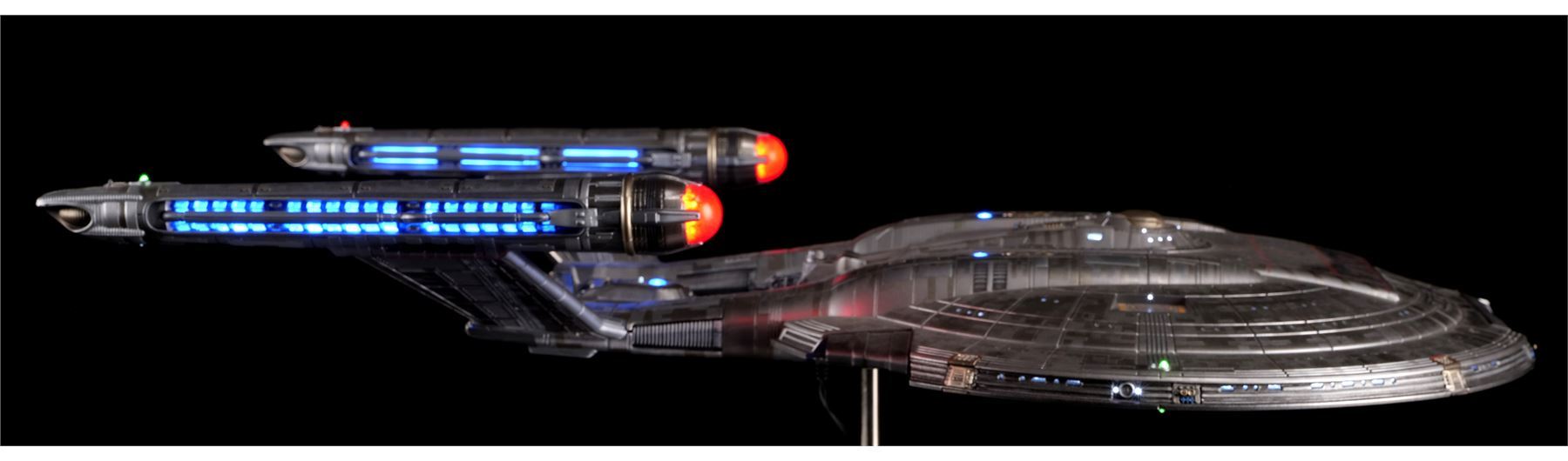 This lot consists of the 1:350 scale model Quantum Mechanix (QMx) convention display and sales page photography model constructed of polystyrene, acrylic, and polyresin. It features a metallic enamel painted exterior. 150 LED lights emulate functioning engines, formation signals, and windows; backed by sound features for phasers and torpedoes, controlled via a keyless fob attached to a clear acrylic "Starfleet" logo. The miniature mounts via metal pole to an MDF base featuring two aluminum Starfleet logo plaques, one unsigned, the other featuring "QMx FX Cinema Arts" and "0 of 100." An egg crate-padded wood shipping crate is included. The lot exhibits scuffing, scratching, and edge wear. Dimensions: (on base) 28" x 18" x 9" (71.25 x 45.75 cm x 23 cm)