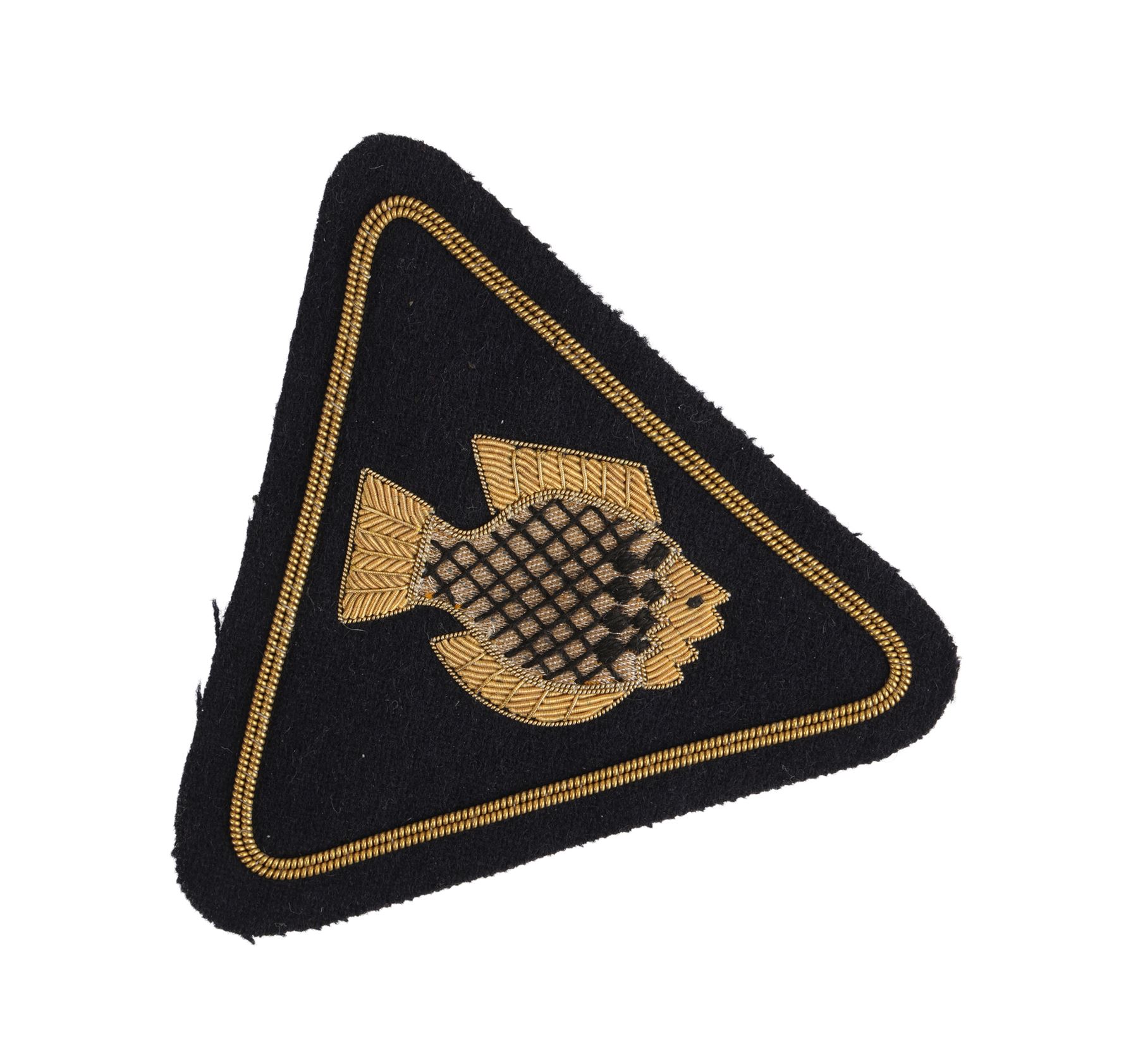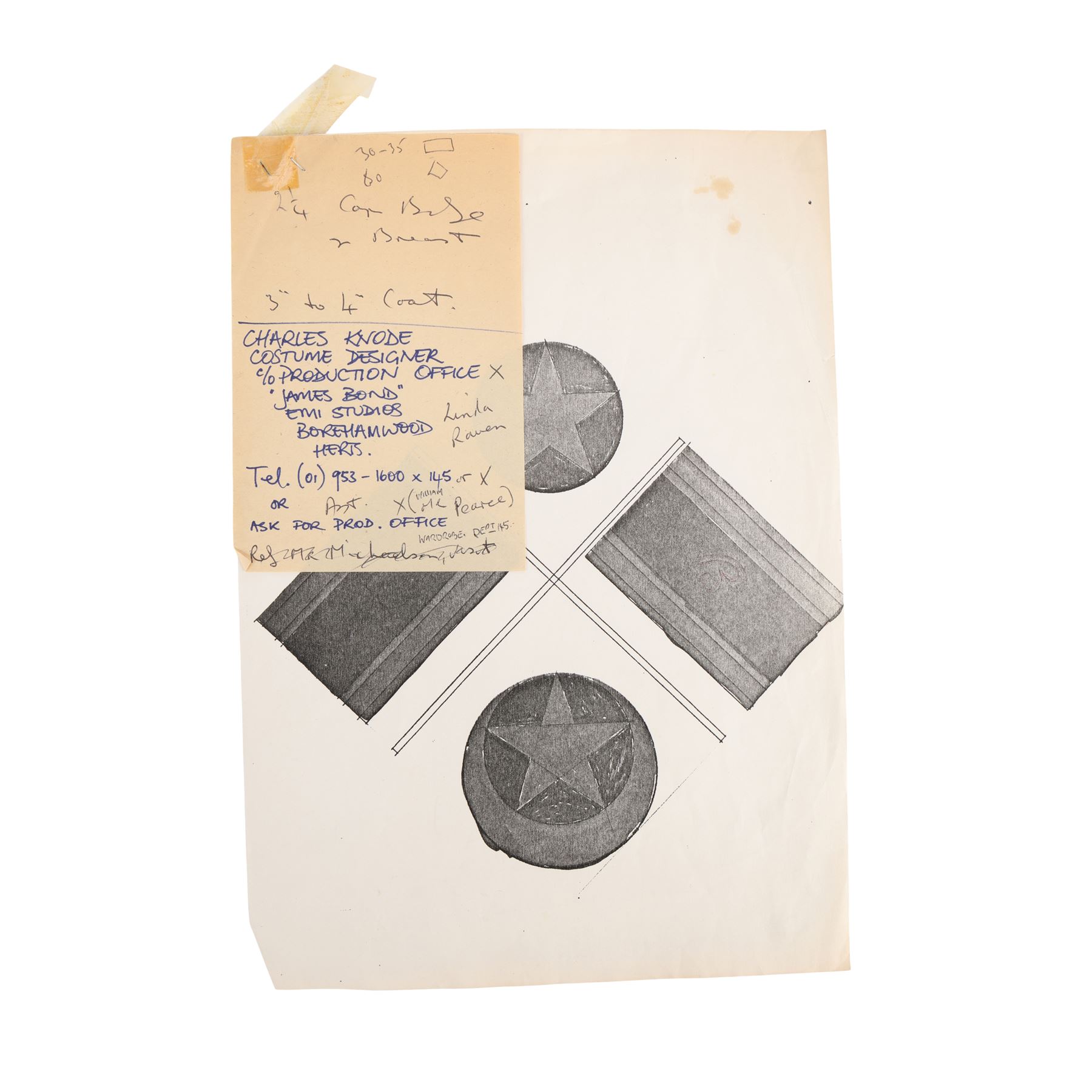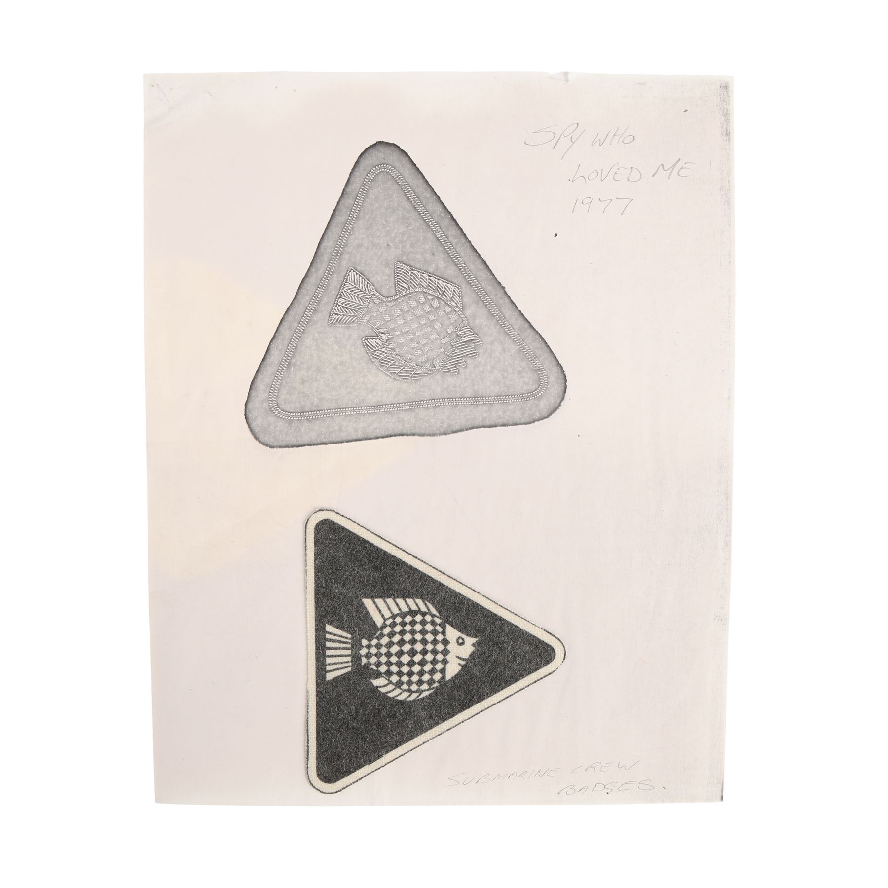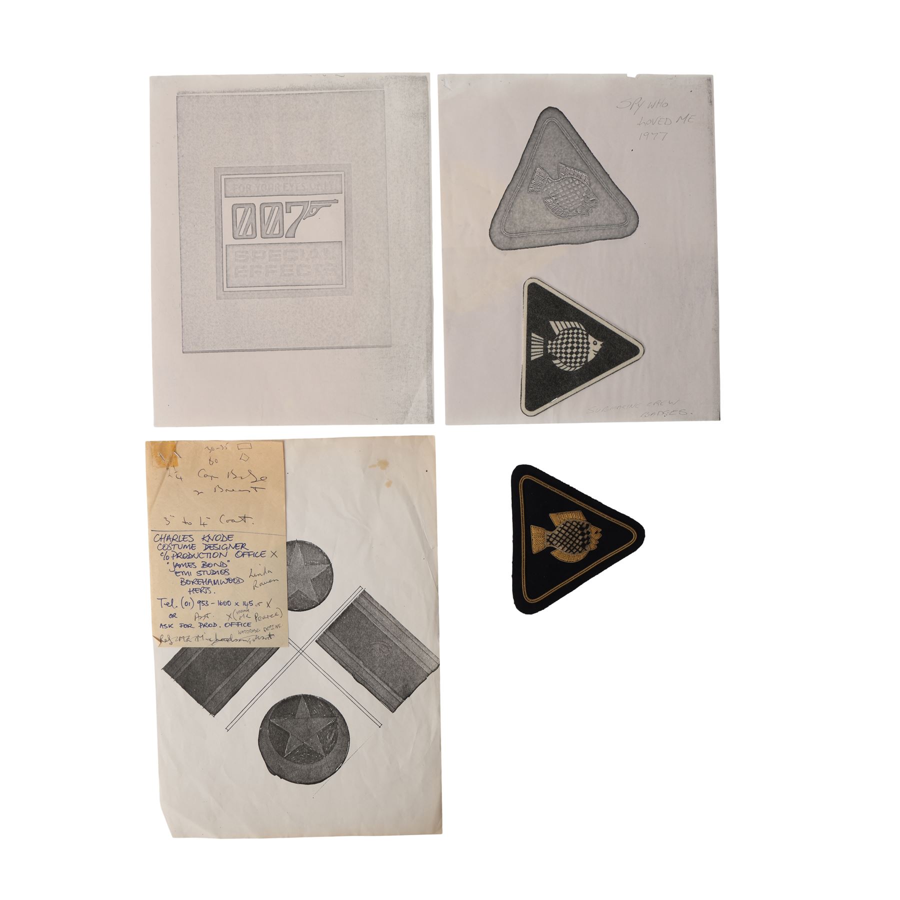 A production-made Stromberg patch, prototype patch and printed concept designs from the production of Lewis Gilbert's Bond film The Spy Who Loved Me. This lot originated from the private collection of the late John Fabb of A R Fabb, the film's patch maker, and features patches made for the Captain of the Liparus (Sydney Tafler). One is a less detailed prototype and they are accompanied by three pages of printed patch designs and a handwritten note featuring costume designer Charles Knode's name. Dimensions (patch): 10 cm x 10 cm (4" x 4")