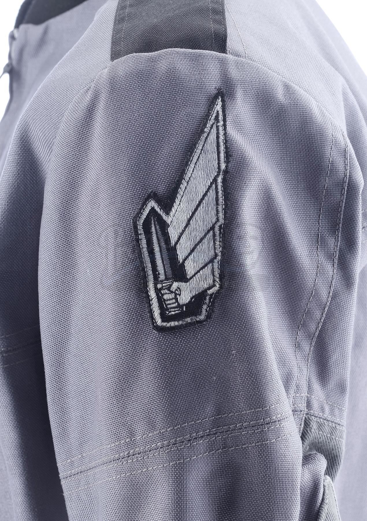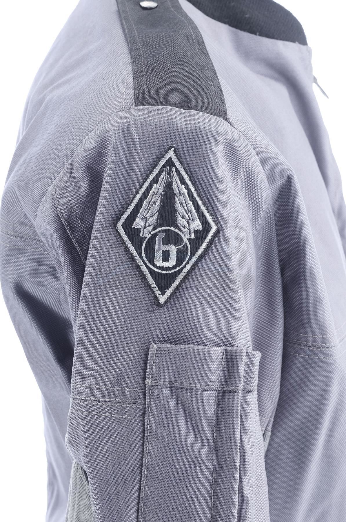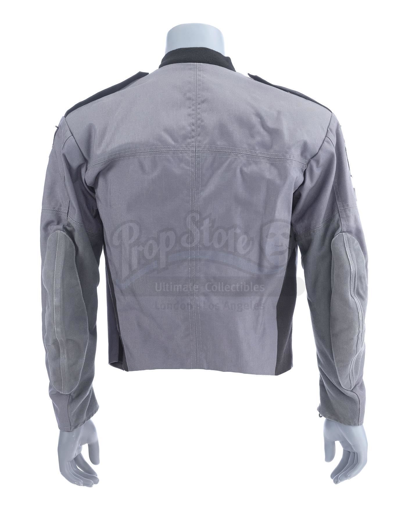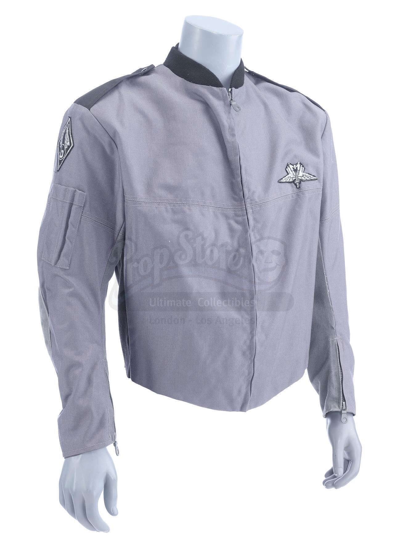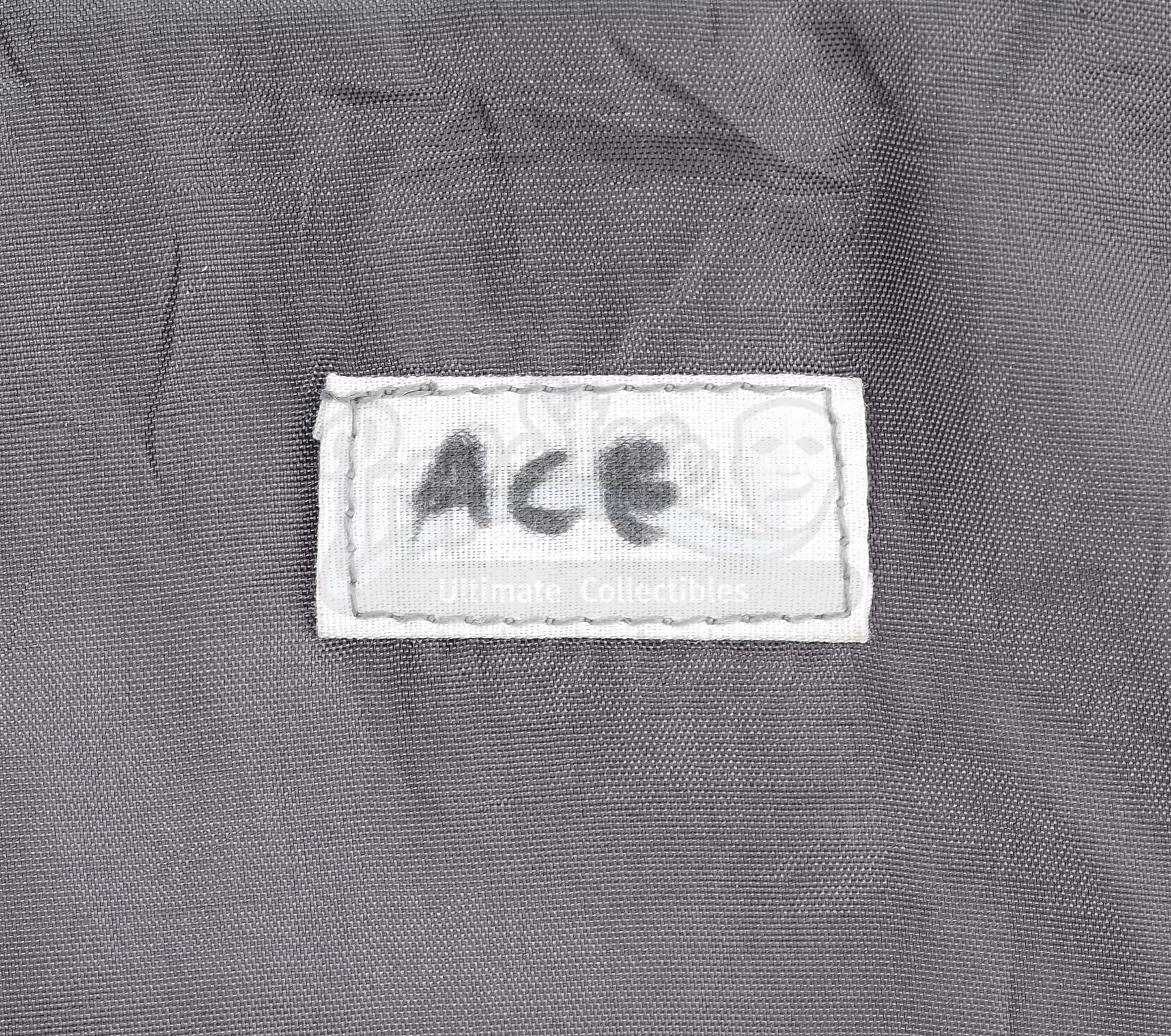 This lot will be auctioned on Thursday, July 1st. The auction will begin at 9:00am PDT and lots are sold sequentially via live auctioneer; tune in to the live streaming broadcast on auction day to follow the pace. Note other lots in the auction may close on June 29th or June 30th. Ace Levy's (Jake Busey) Mobile Infantry jacket from Paul Verhoeven's sci-fi satire Starship Troopers. Levy and other cadets wore Mobile Infantry uniforms while in boot camp, including while they watched Johnny Rico (Casper Van Dien) flogged as punishment. This gray, cotton blend zip-up jacket with a black collar features a pair of zippers on the wrists. It is marked "ACE" on the interior and is affixed with black epaulets on the shoulders and a pair of mobile infantry patches on the upper sleeves and one on the front breast. It exhibits signs of wear from age and use, but remains in excellent overall condition. Estimate: $600 - 800