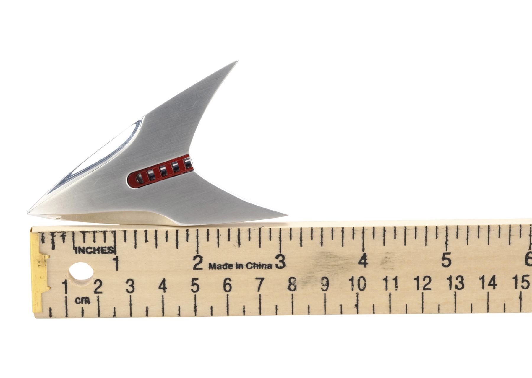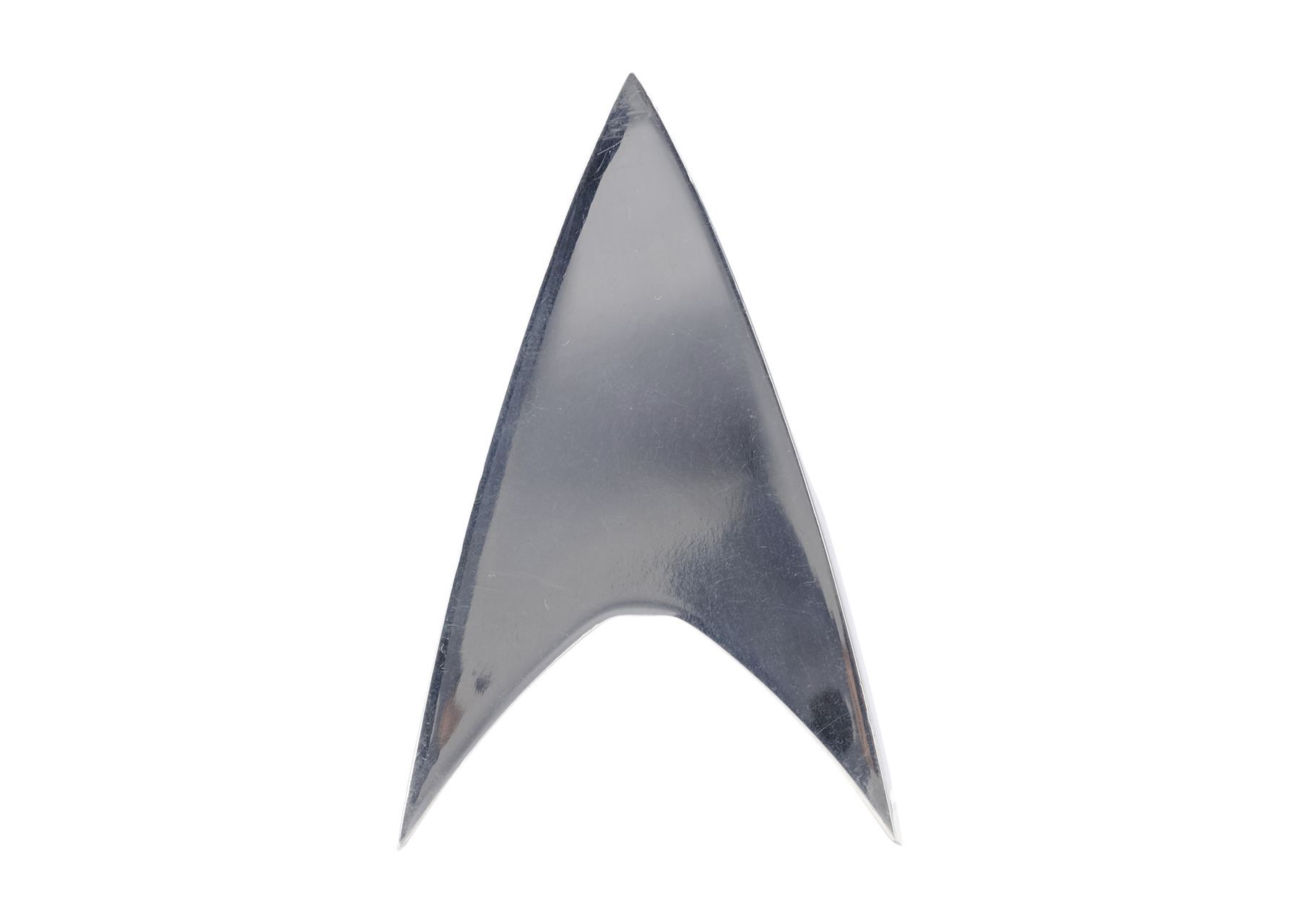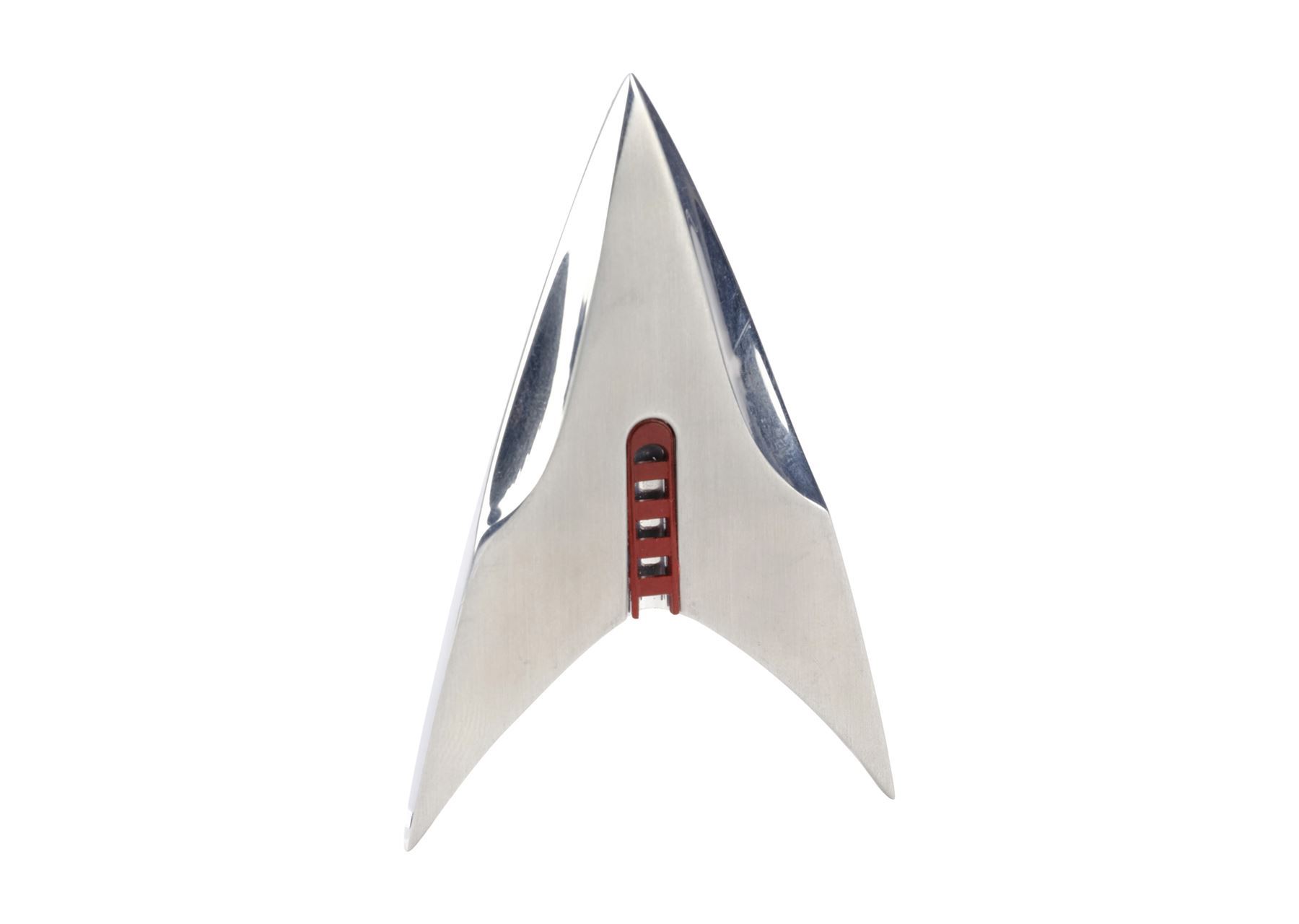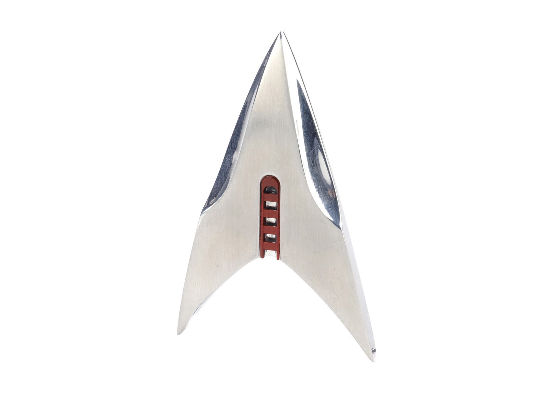 Designed by property master Jeffrey Lombardi, this metal combadge features curved edges and a red and silver-color rank column at center. It exhibits scuffs and scratching from production wear.