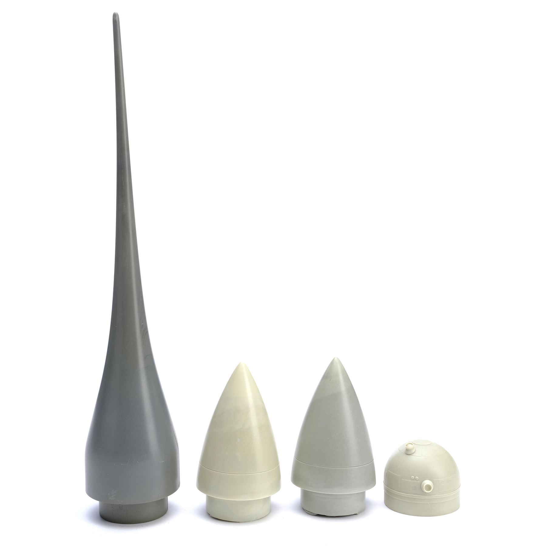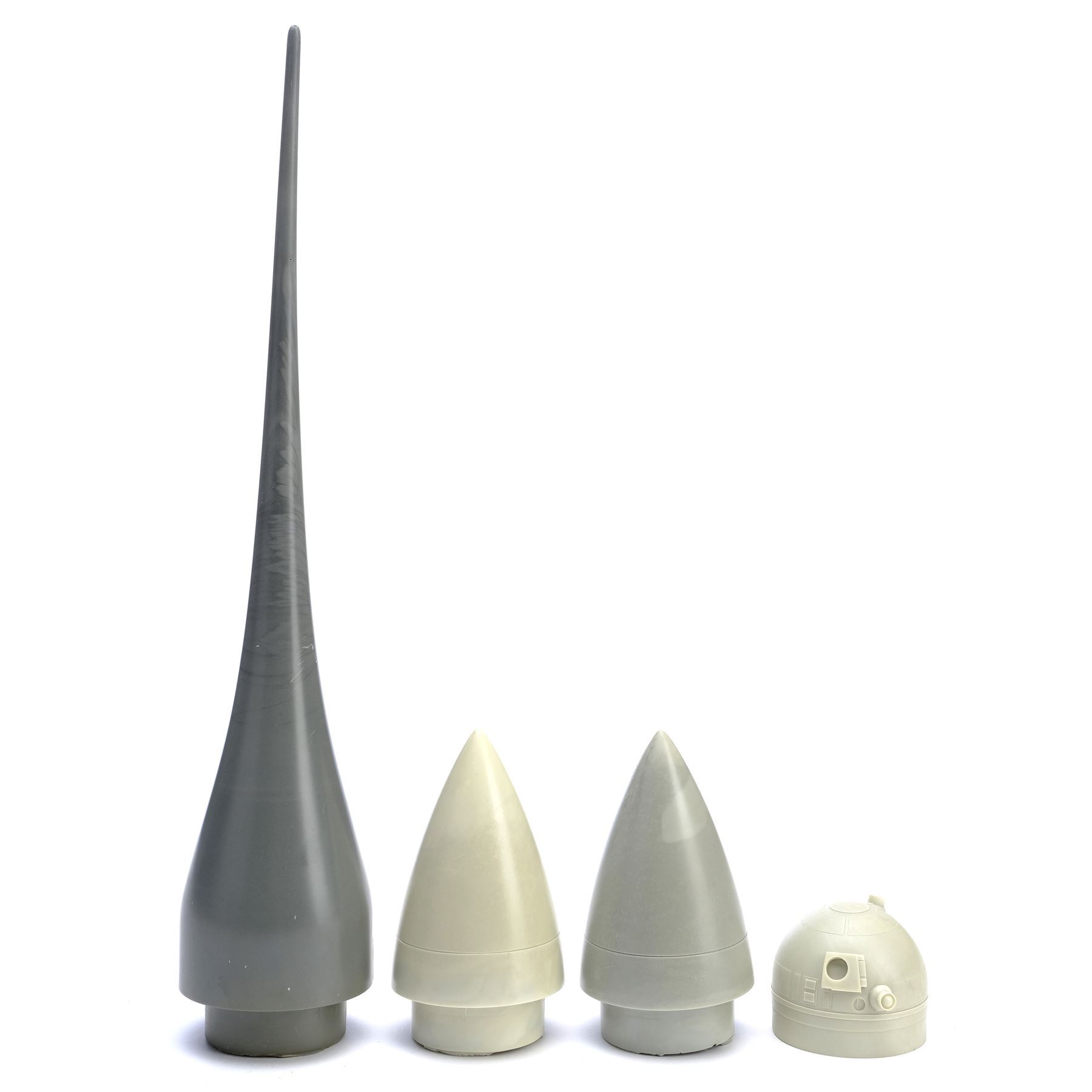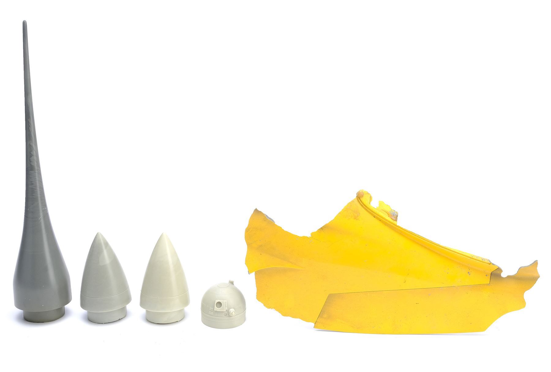 This set comes from the collection of concept model maker John Duncan. It consists of five cast resin model miniature components: two engine nose cones; an R2-D2 head; a foam-filled engine spike; and an exploded pyrotechnics model fragment. The fragment is painted yellow on one side and gray on the other. They exhibit chipped paint, notable seams from the curing process, and mild discoloration from production. Dimensions: 14" x 7" x 3" (35.5 cm x 18 cm x 7.75 cm)