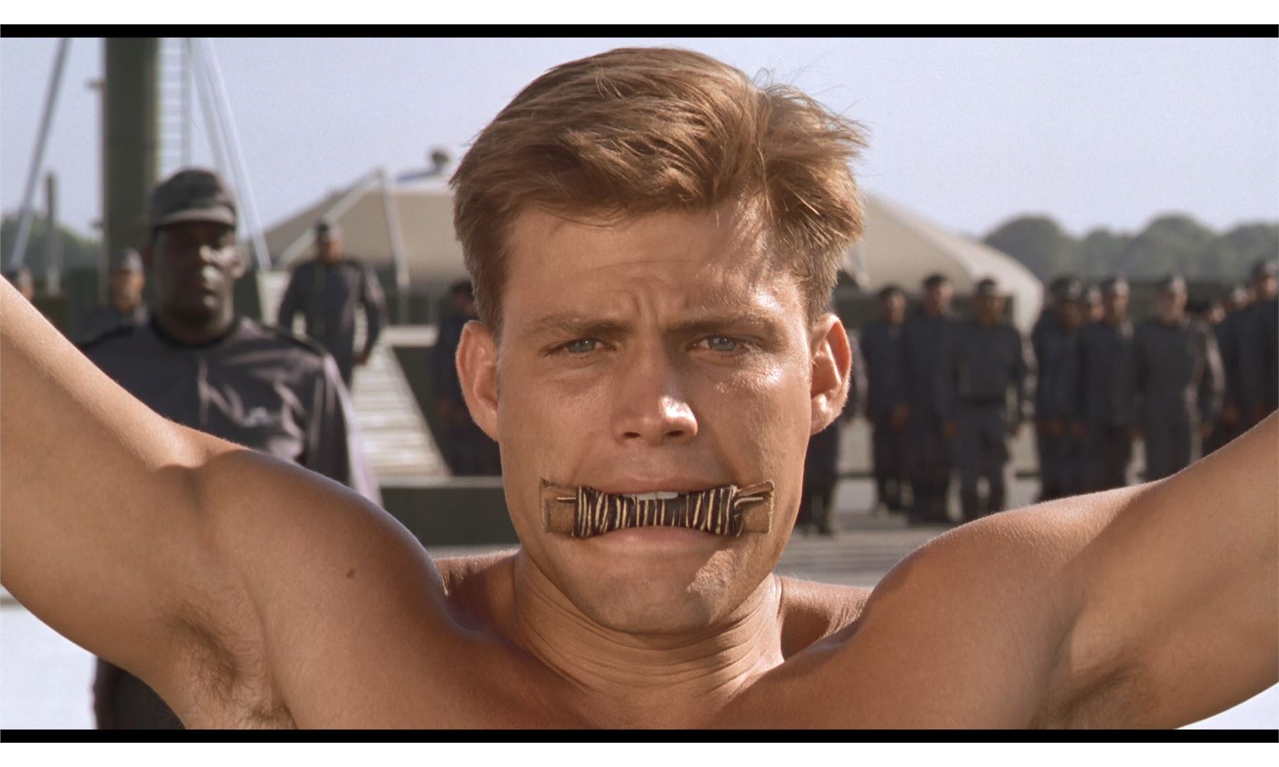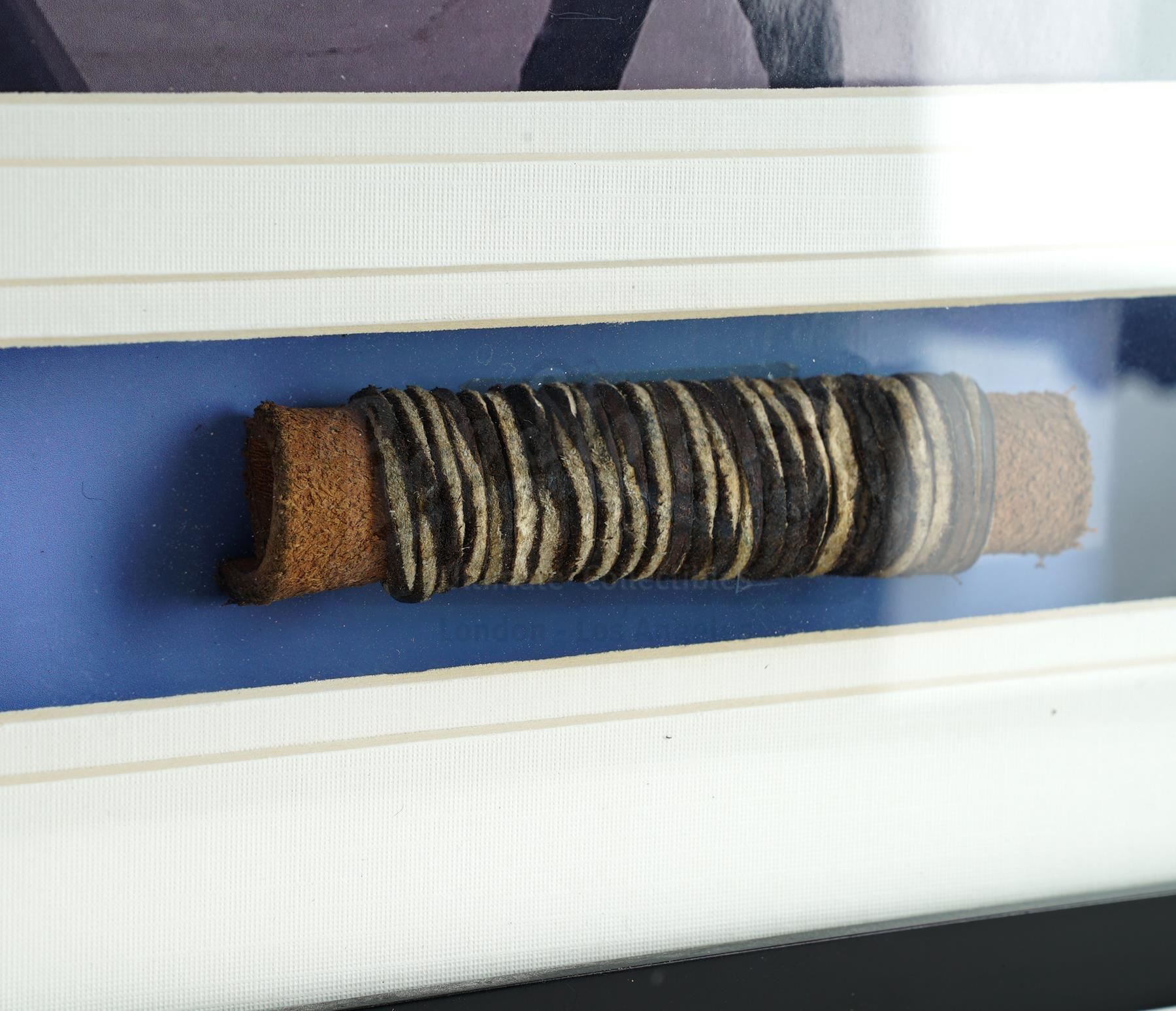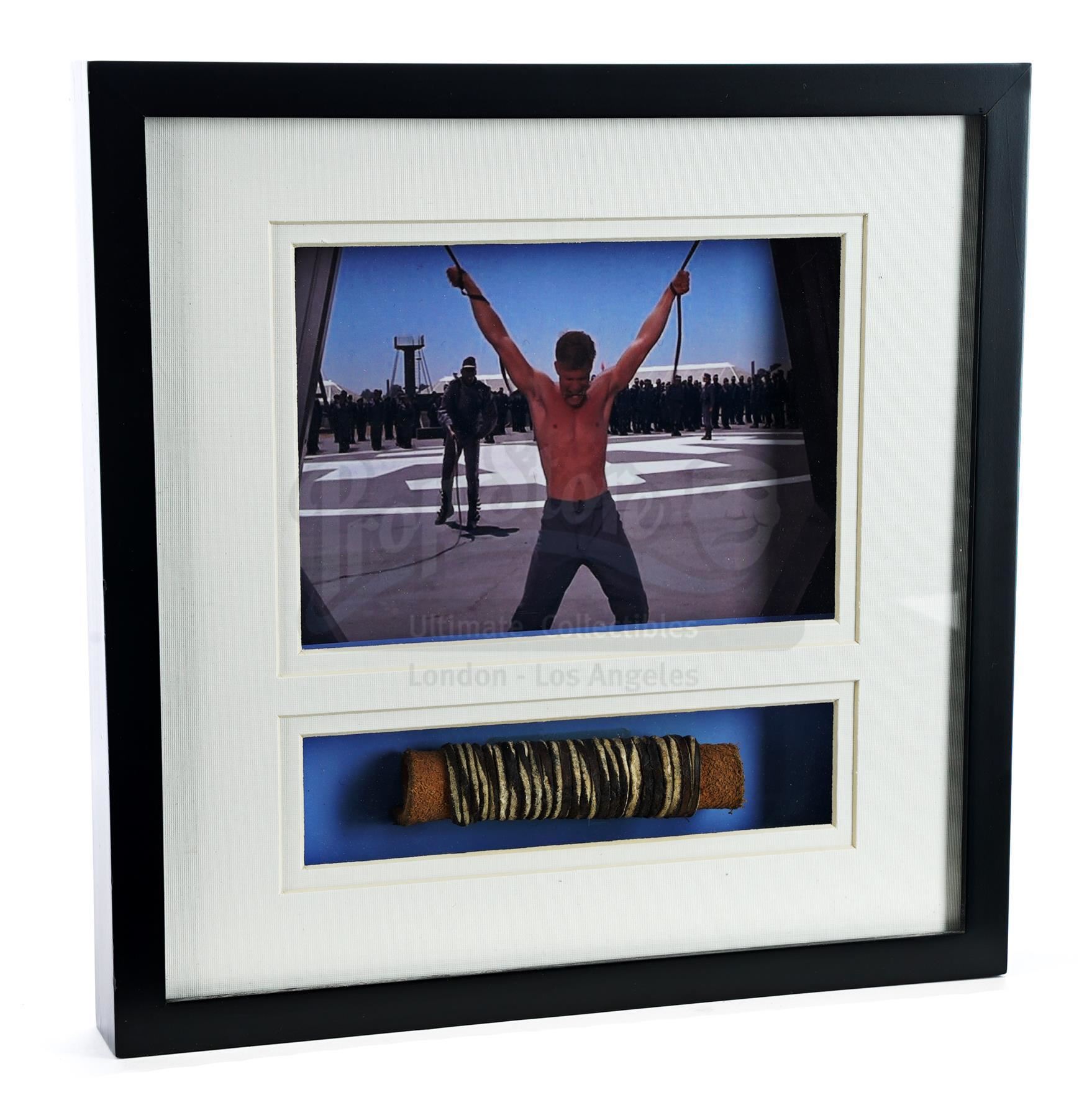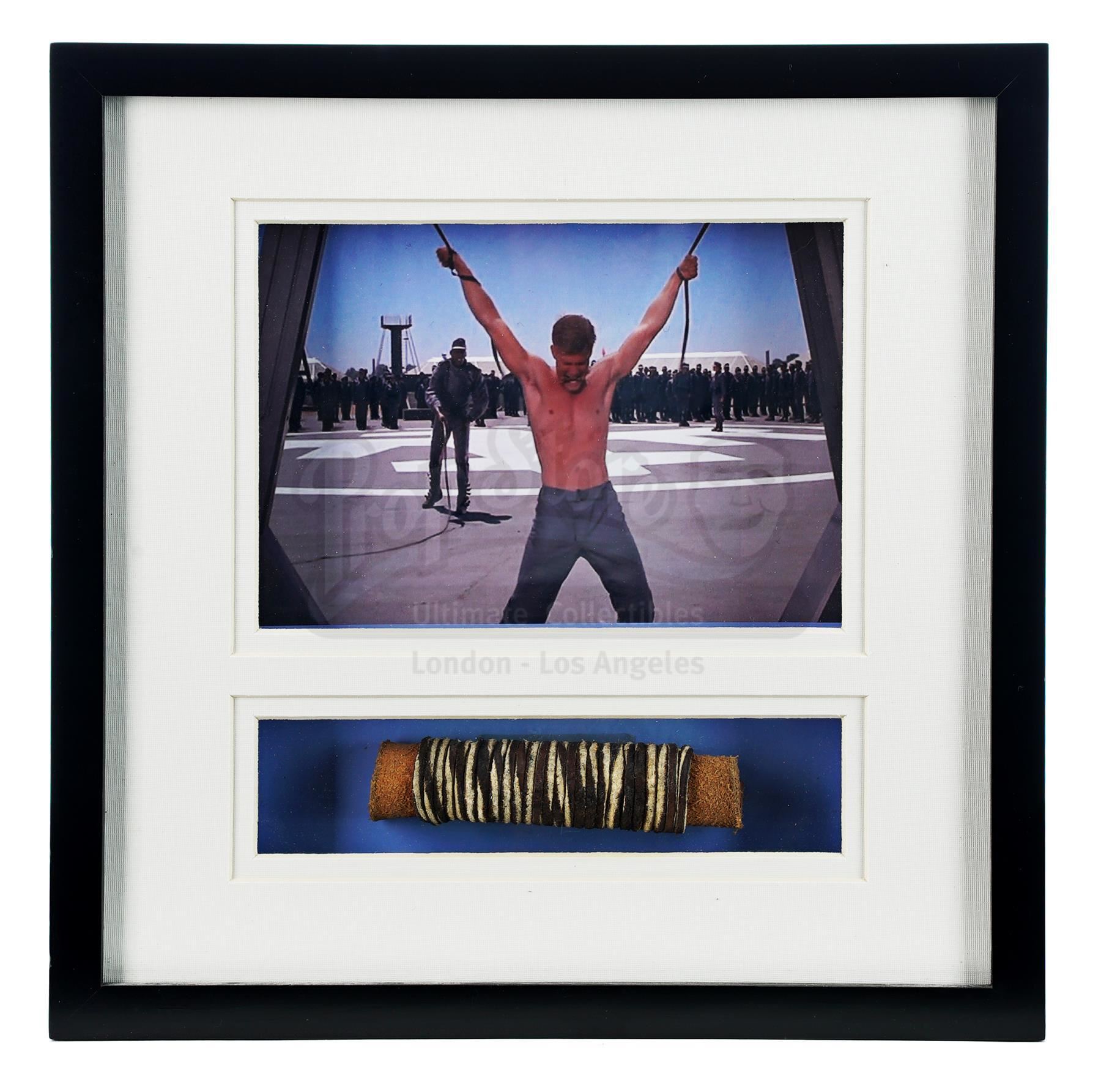 This lot will be auctioned on Thursday, July 1st. The auction will begin at 9:00am PDT and lots are sold sequentially via live auctioneer; tune in to the live streaming broadcast on auction day to follow the pace. Note other lots in the auction may close on June 29th or June 30th. Johnny Rico's (Casper Van Dien) framed leather bit from Paul Verhoeven's sci-fi satire Starship Troopers. As Rico is about to receive corporal punishment for breaking protocol during a training exercise, Sgt. Zim (Clancy Brown) offered him this small bit as a demonstration of his own humanity and compassion. The thick leather, rectangular rawhide bit is curled on itself and held in place with rawhide cording. It is presented in a framed box with a photo from the film in which Rico holds the bit in his teeth. The lot remains in good overall condition with minor scuffs to the frame from handling. Dimensions (framed): 11" x 11" x 1.5" (28 cm x 28 cm x 4 cm) Estimate: $500 - 700
