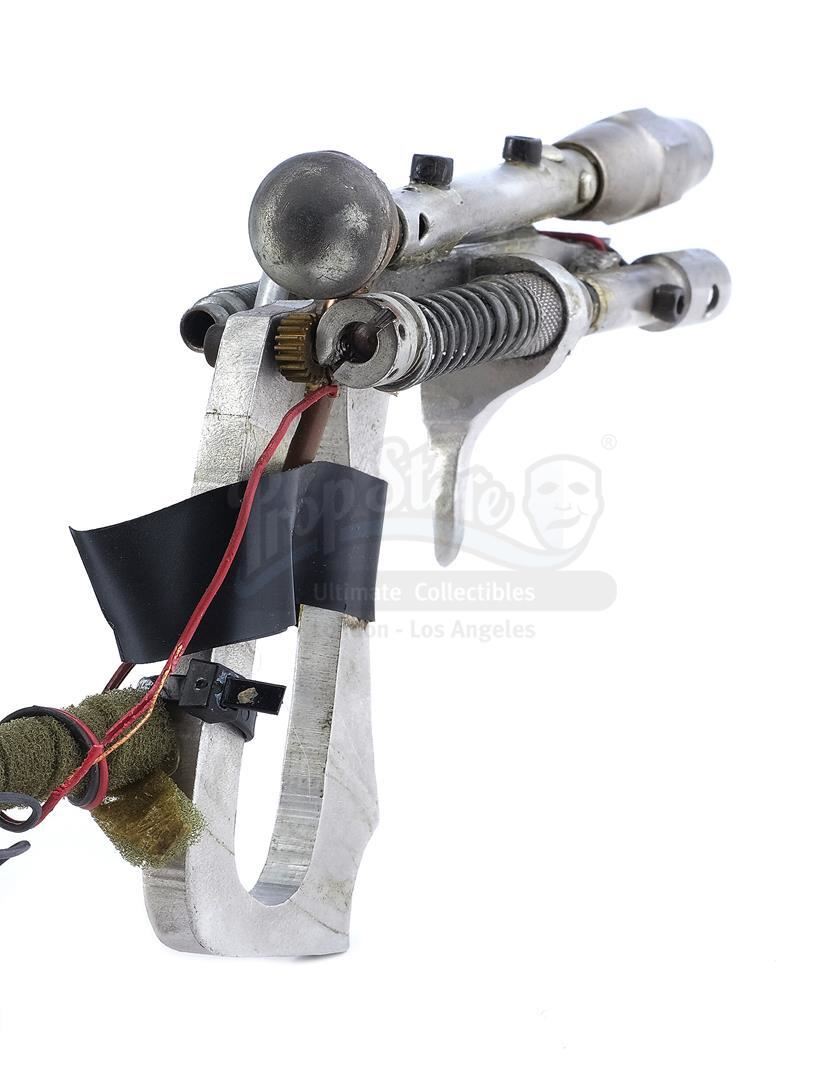 This lot will be auctioned on Thursday, July 1st. The auction will begin at 9:00am PDT and lots are sold sequentially via live auctioneer; tune in to the live streaming broadcast on auction day to follow the pace. Note other lots in the auction may close on June 29th or June 30th. Shep Ramsey's (Hulk Hogan) freeze guns and crystal from Burt Kennedy's sci-fi comedy Suburban Commando. Intergalactic warrior Ramsey crashed on Earth where his freeze guns were stolen, then located his ship's energy crystals in his friend's office. This lot consists of a pair of metal gun-like devices with spring-loaded triggers. One is connected to wires and a section of rubber hose. Also included is a pyramid-shaped plastic crystal. All show wear from age and use, including missing elements on the guns and discoloration on the crystal, but remain in good overall condition. Dimensions: 14" x 4" x 2" (35.5 cm x 10.25 cm x 5 cm). This lot comes from the collection of renowned special effects artist Tom "Brooklyn" Bellissimo. A letter of authenticity from Bellissimo is included. Estimate: $1,000 - 1,500