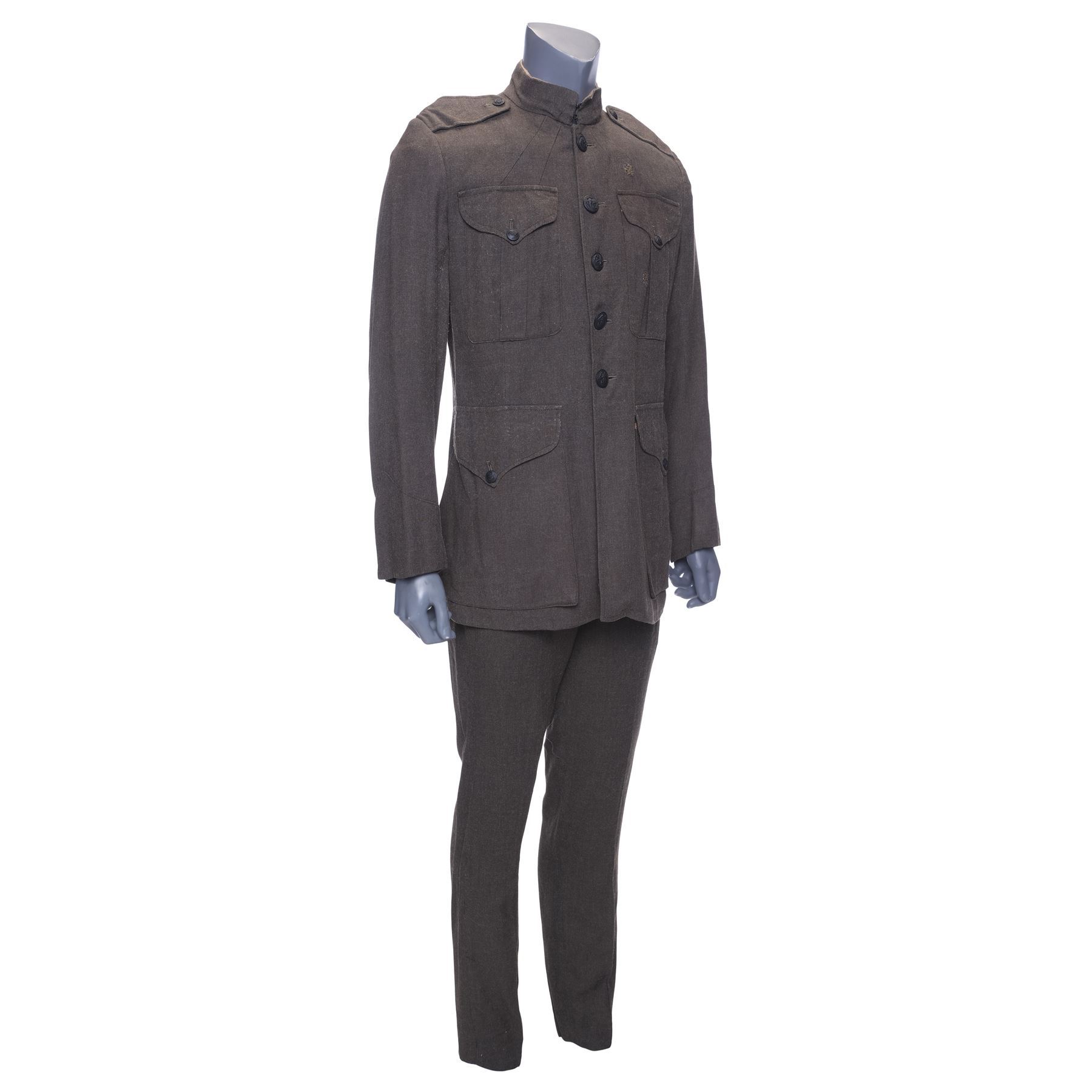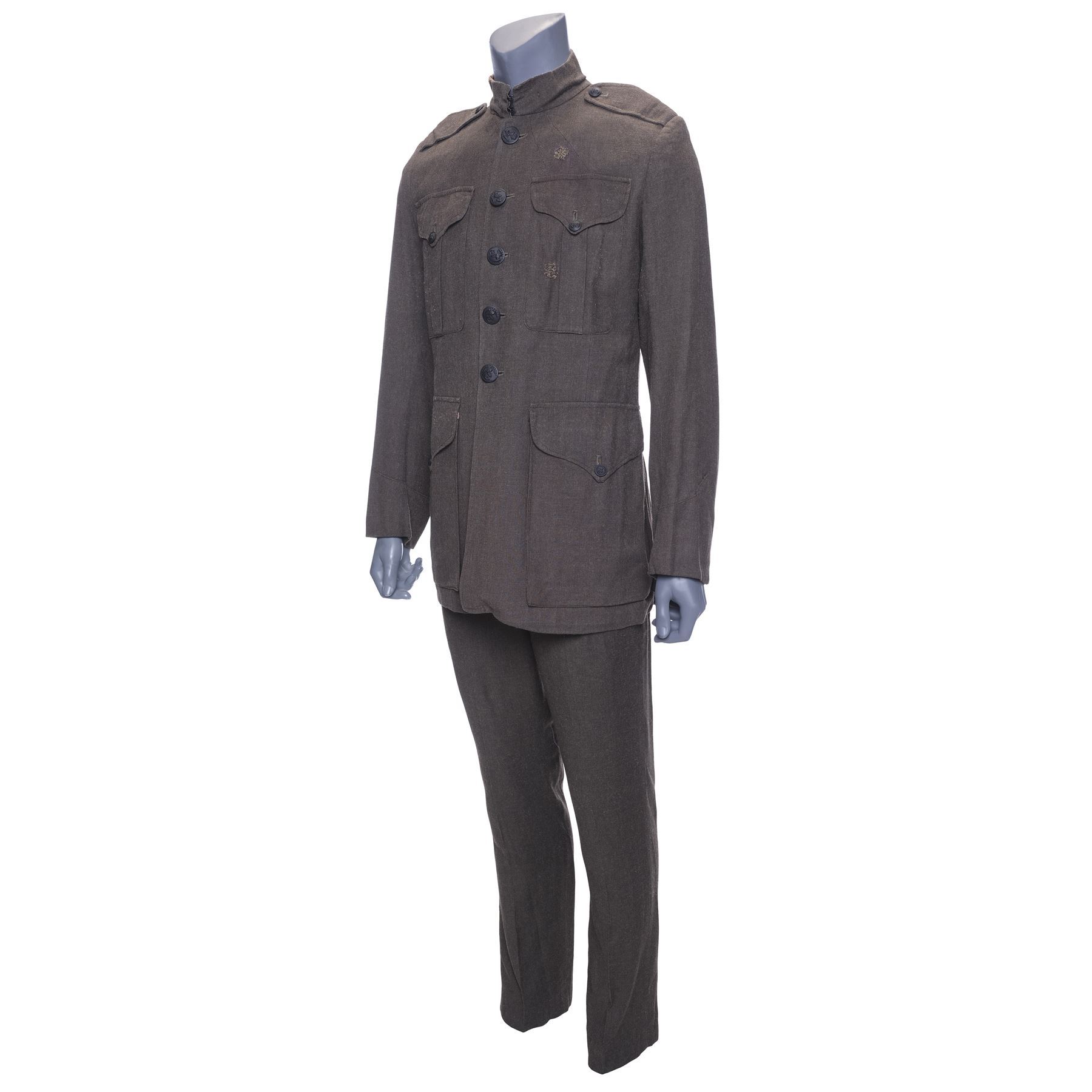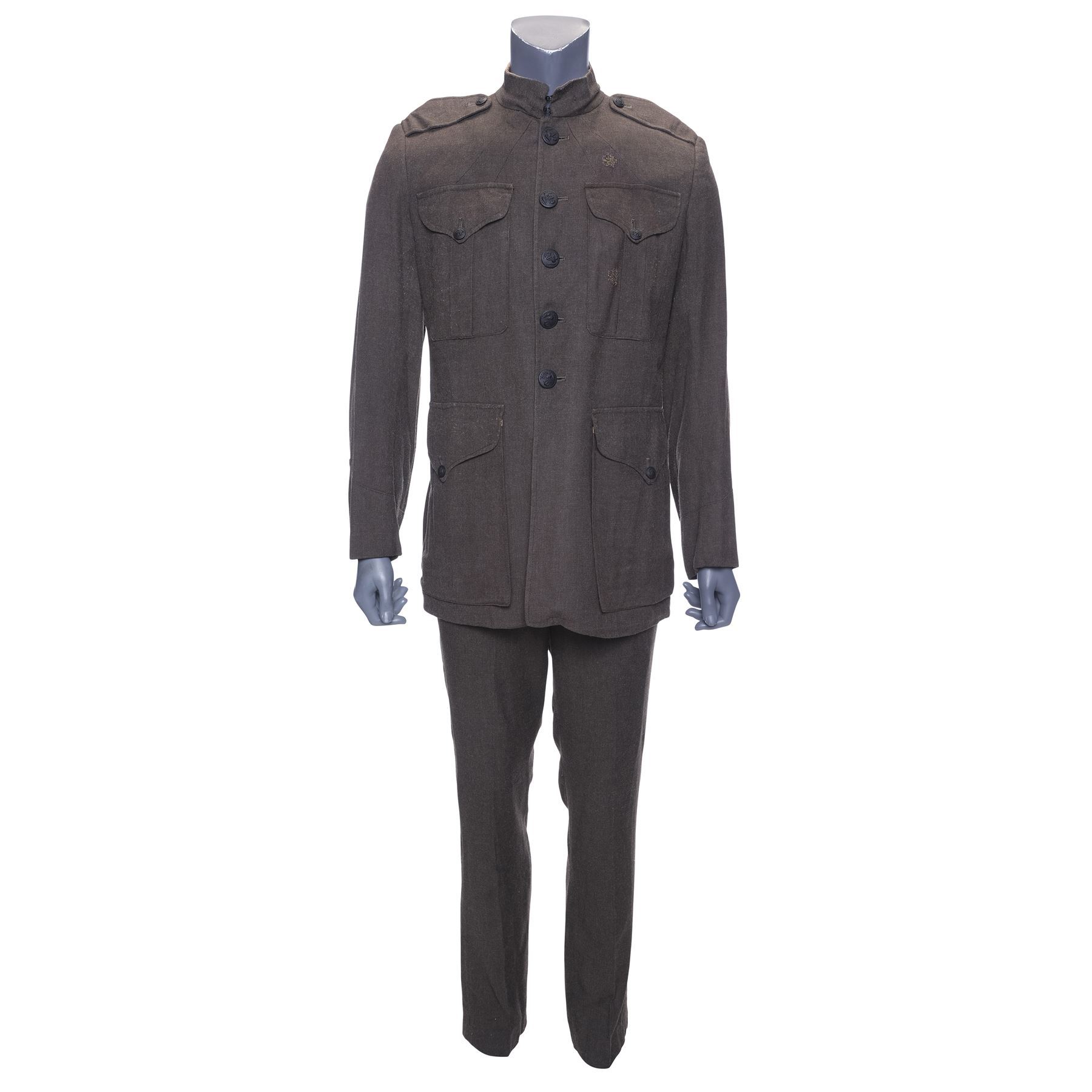 This uniform consists of a dark green polyester jacket labeled "40c 5'10 792" and "Harry Daly Tom Keane" and a pair of matching trousers labeled "32 W 32L 747" and "747." Included is a loose tag from Angels and Bermans marked "1993 32" L." This lot exhibits fraying and loose threads.