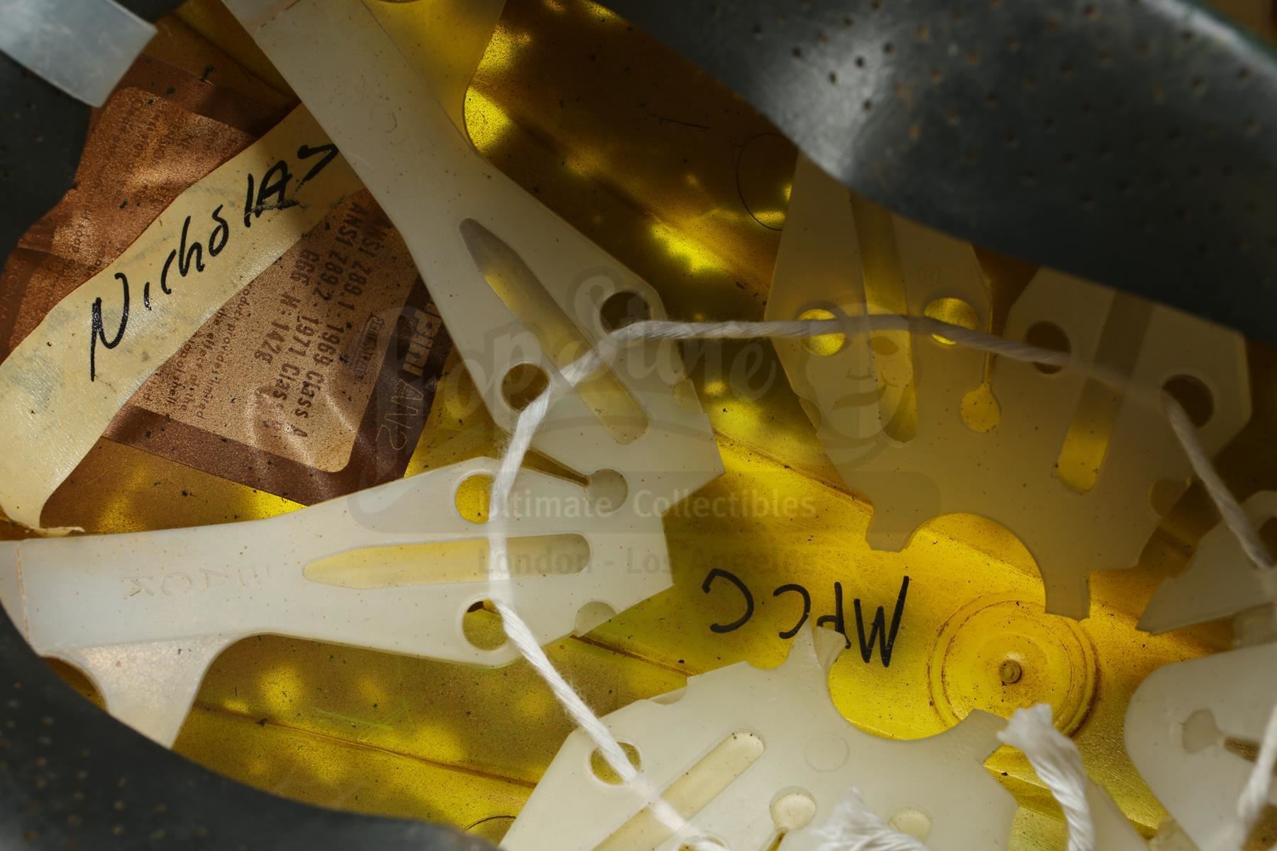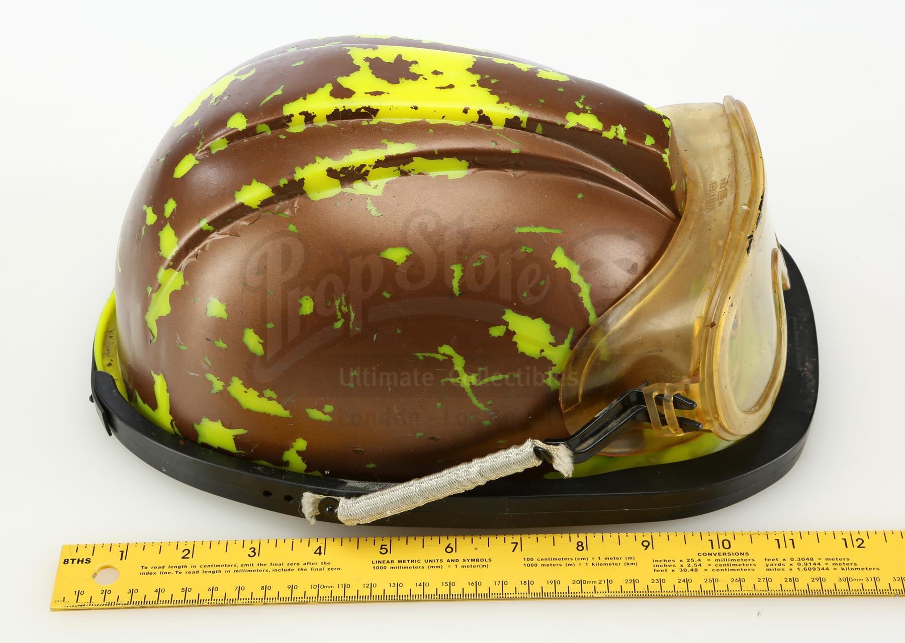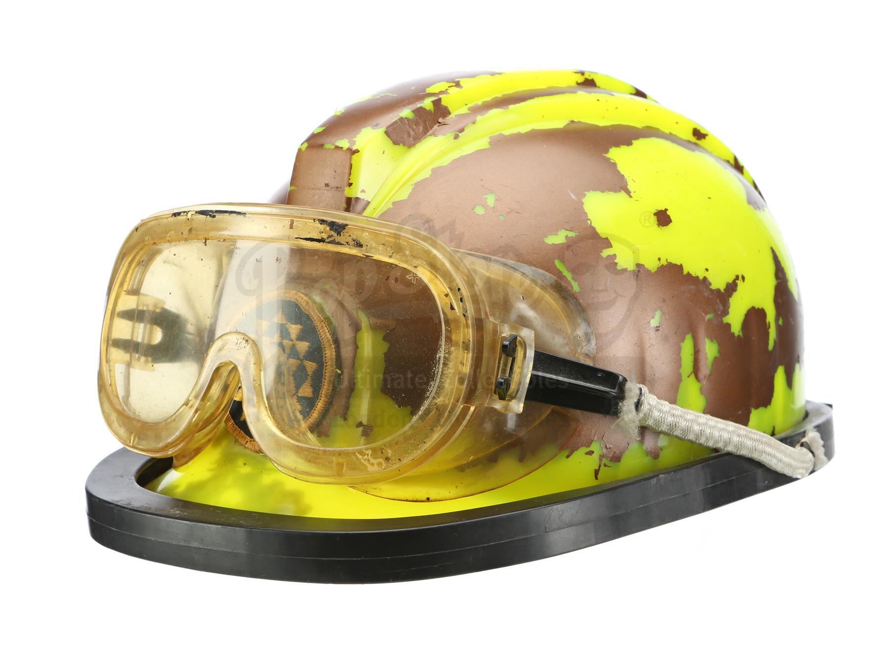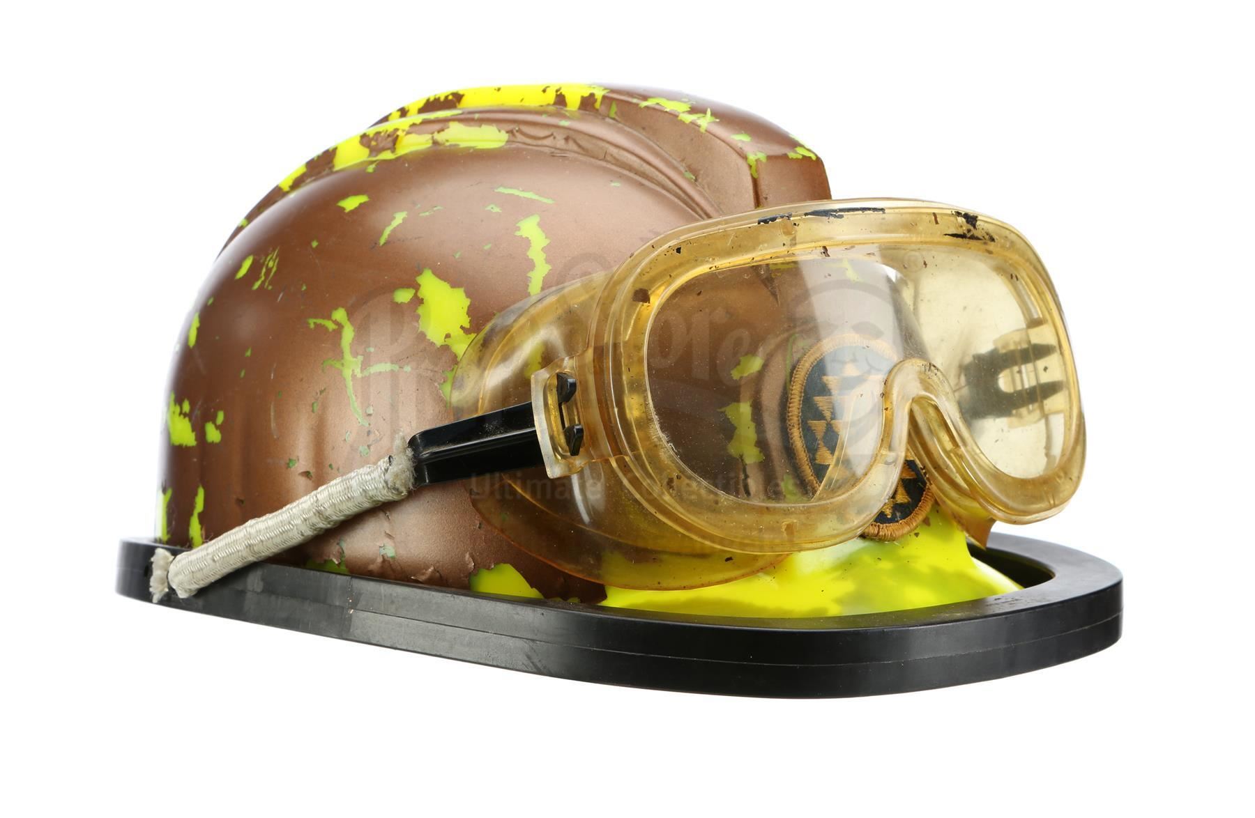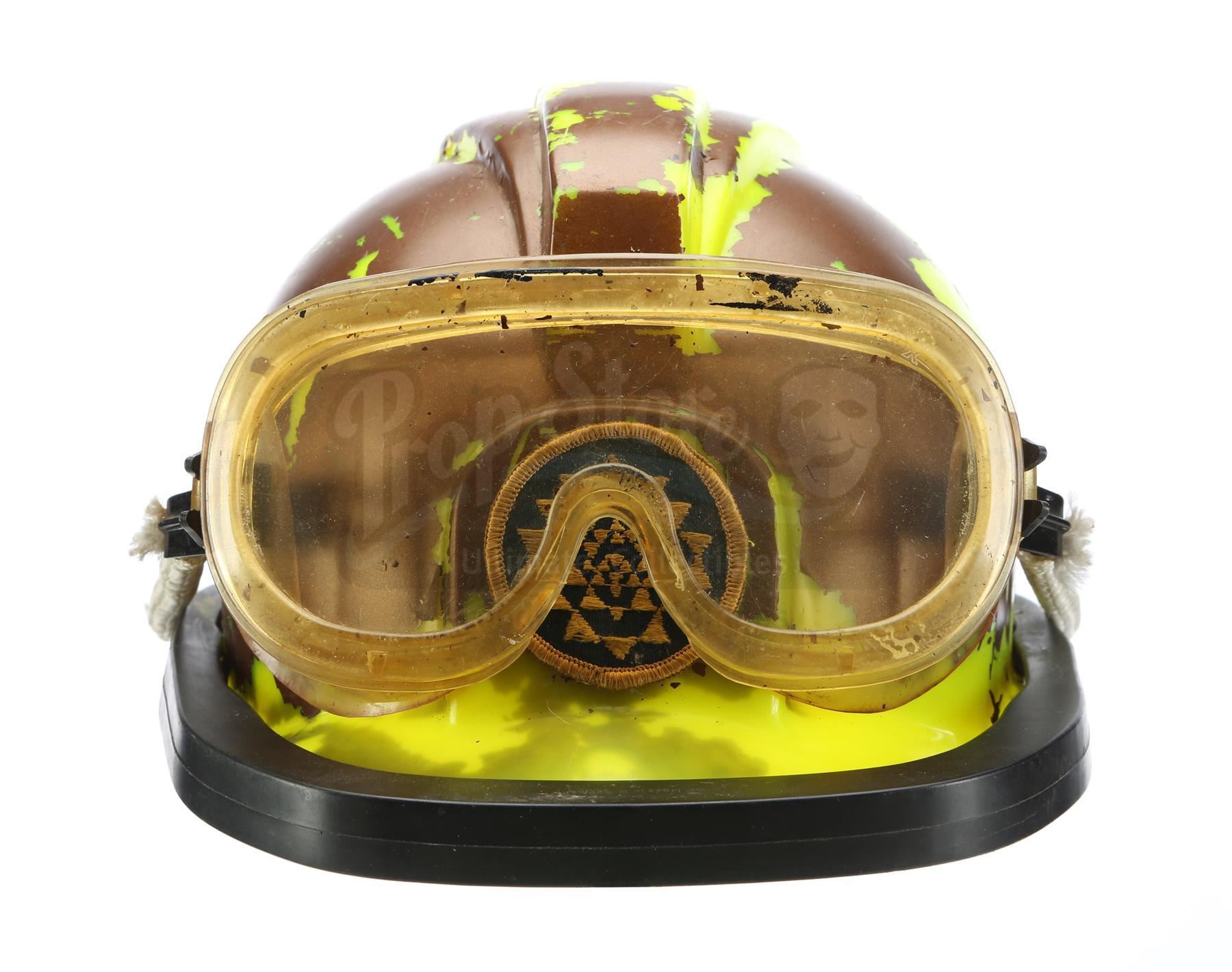 This foam-padded fiberglass Alpini helmet labeled "Nicholas" and "MPCC" originated with the Universal Studios wardrobe collection. It comes with its original bronzetone paint and clear rubber goggles intact, as well as its Galactica insignia emblazoned on the front. The helmet is in good overall condition with scuffs and chipped paint throughout.