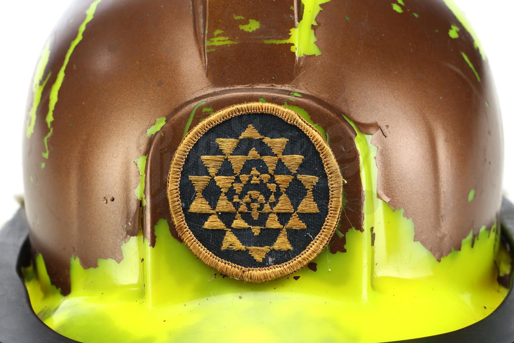 A Viper ground crew helmet from Glen A. Larson's sci-fi television series Battlestar Galactica. Viper technicians wore their standard-issue helmets throughout the series, as well as in the 1979 film spin-off.
