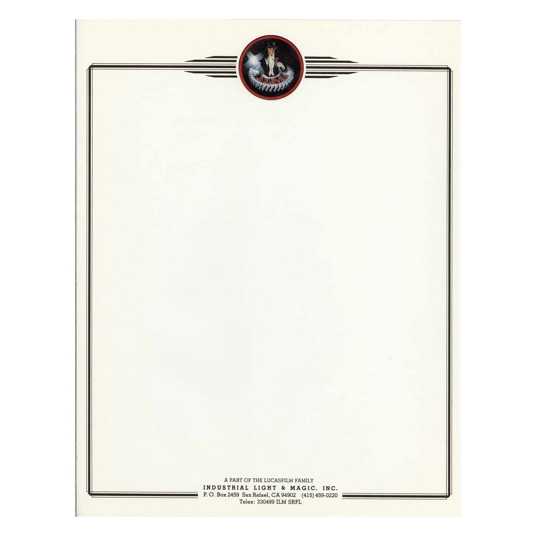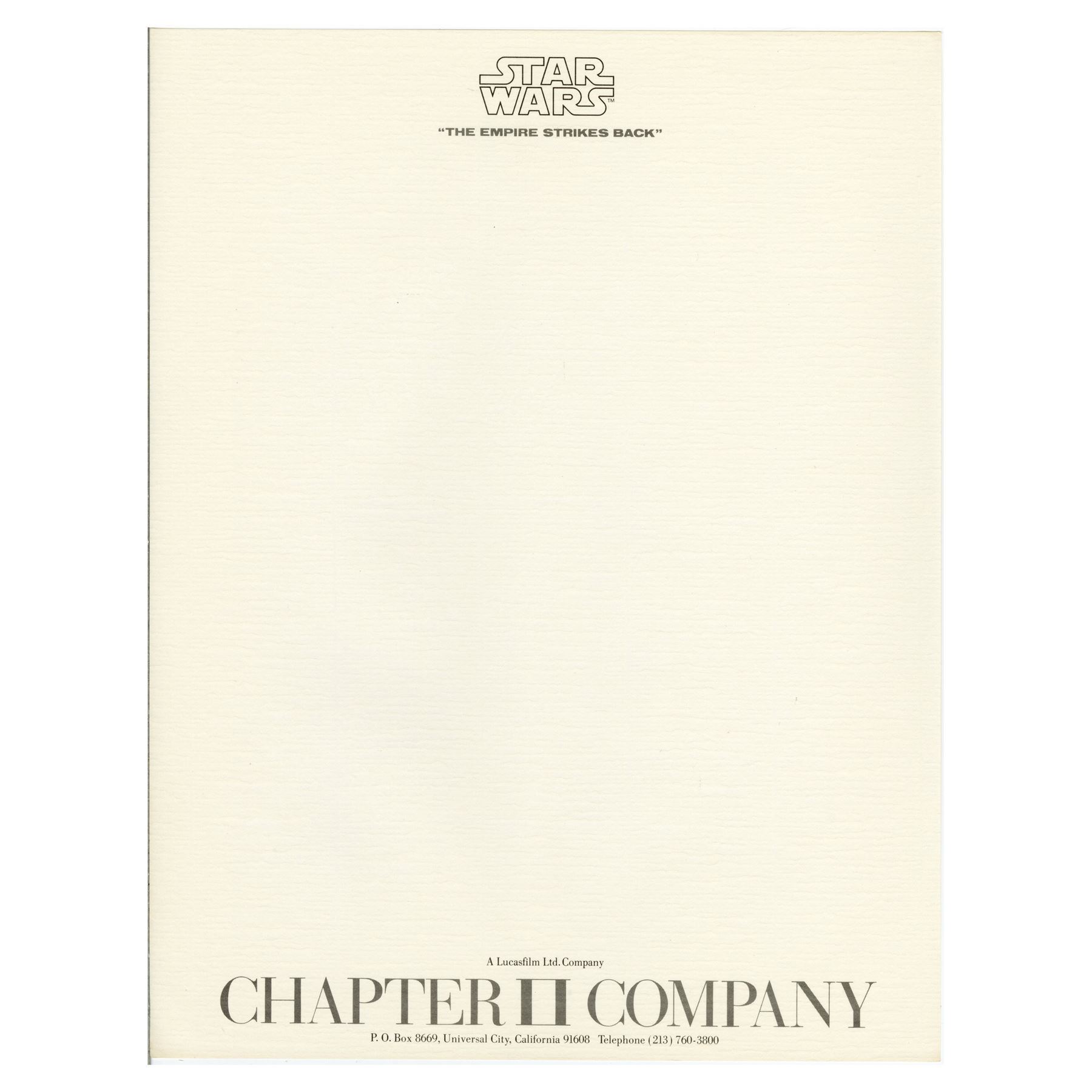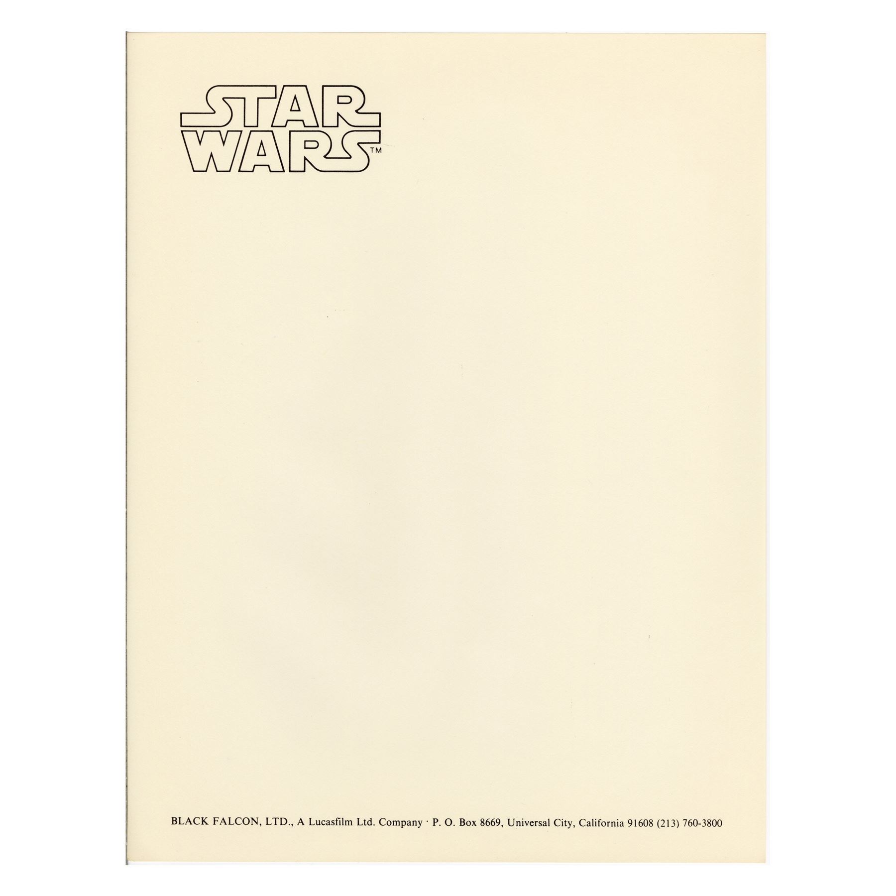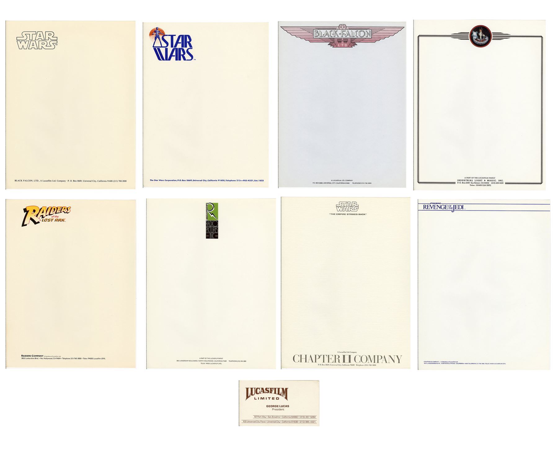 LUCASFILM - George Lucas' Business Card and Subsidiary Letterheads - George Lucas' business card and subsidiary letterheads from Lucasfilm Ltd. This lot consists of George Lucas' Lucasfilm Limited business card on cardstock; one Star Wars Revenge of the Jedi subsidiary; one Star Wars The Empire Strikes Back subsidiary; one Radio Pictures Inc. subsidiary; one Raiders of The Lost Ark subsidiary; one Industrial Light & Magic (ILM) subsidiary; one Black Falcon Ltd. subsidiary; and two Star Wars subsidiaries. This lot exhibits minor discoloration from age. Dimensions: (card) 3.5" x 2" (9 cm x 5 cm); (subsidiary) 8.5" x 11" (21.75 cm x 28 cm)