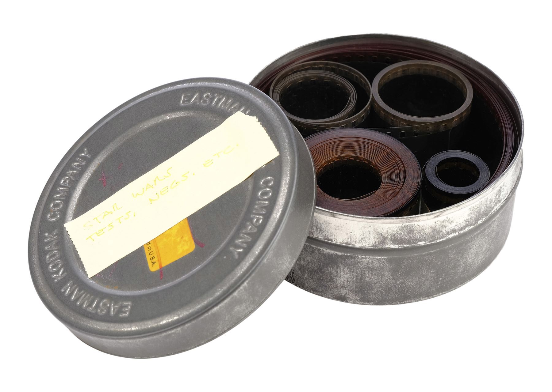 This lot comes from the collection of veteran model maker Dave Jones. It includes clips of the Death Star, Millennium Falcon, Darth Vader's Star Destroyer, and Han Solo (Harrison Ford) and Luke Skywalker (Mark Hamill) in gunner seats, as well as a tin hand-labeled "STAR WARS TESTS, NEGS, ETC." The tin exhibits scuffs and scratches with tape residue and edge wear on film. Dimensions: (tin) 3" x 3" x 1.5" (7.75 cm x 7.75 cm x 3.75 cm)