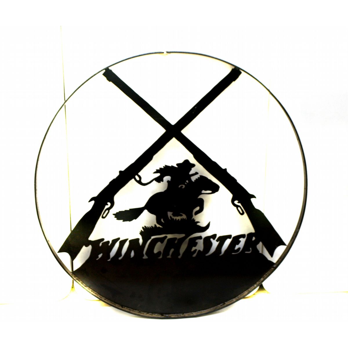 Large 40" wagon wheel black painted iron hanging Winchester sign - features two lever action silhouettes and Winchester Rider logo - heavy item - very good condition - Oversize Shipping - non-ffl - 25VVFKIL116