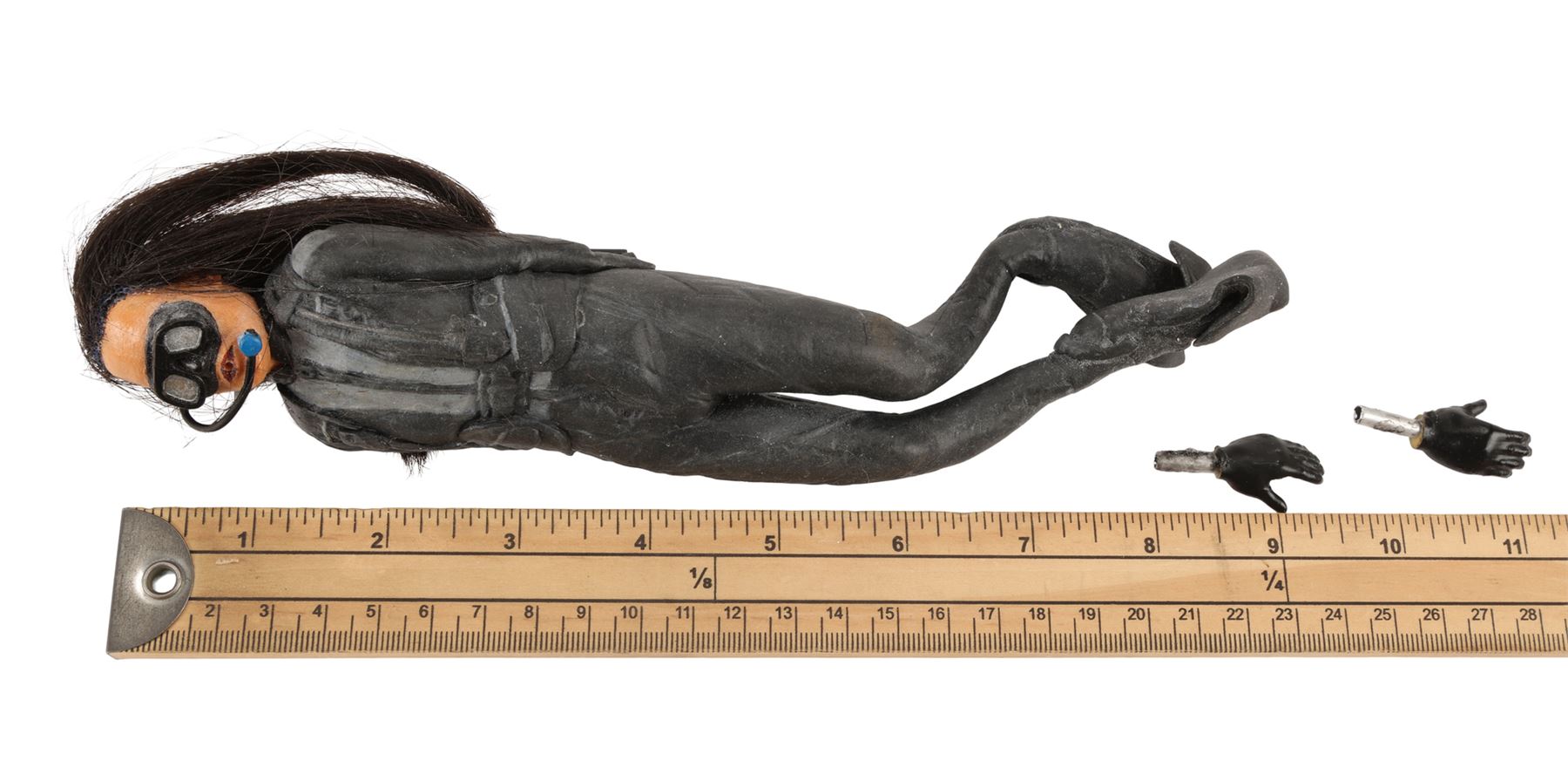 The figure features a resin head with black faux hair and a black silicone scuba-suited body with a solid interior up to the knees and completely flexible calves and flippers. A wood, metal, and plastic scuba breathing tank is affixed to the back, and a pair of separate resin hands attached to metal tubes, which at one point would have fitted into the suit's silicone sleeve, accompany the model. Also included are three printed photographs illustrating the scene the model is for. The model exhibits dust from age and indentations and warping to the silicone from wear and storage. Dimensions: (model) 24 cm x 5 cm x 5 cm (9 1/2" x 2" x 2")