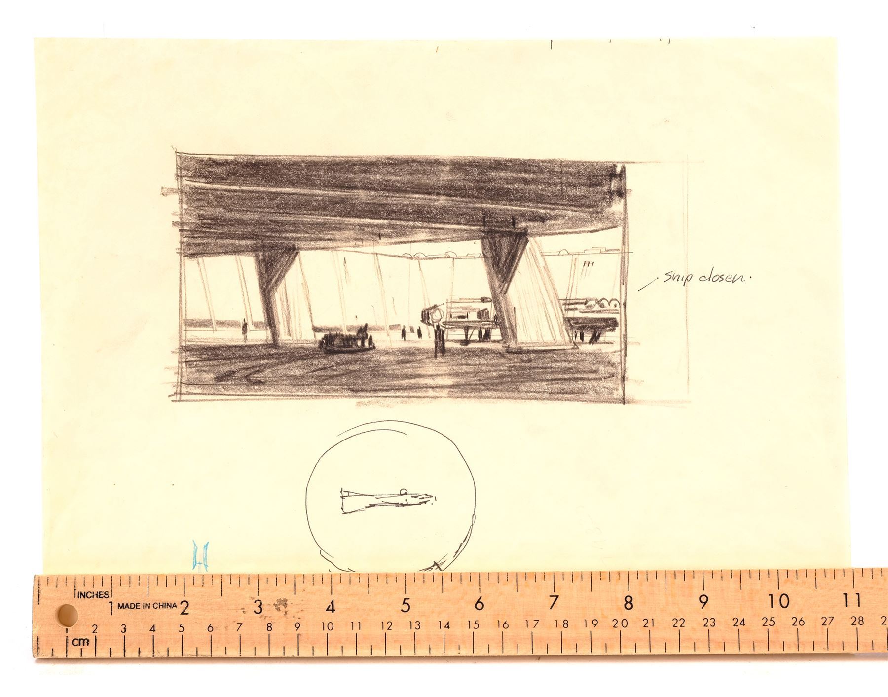 STAR WARS: EPISODE IV - A NEW HOPE (1977) - Hand-Drawn Ralph McQuarrie Mos Eisley Spaceport Docking Area Concept Sketch - A concept sketch of the Mos Eisley spaceport docking area hand-drawn by concept artist Ralph McQuarrie for George Lucas' Star Wars: A New Hope. Han Solo (Harrison Ford) parked the Millennium Falcon, originally called the Pirate Ship in Lucas' early script, in a Mos Eisley spaceport.