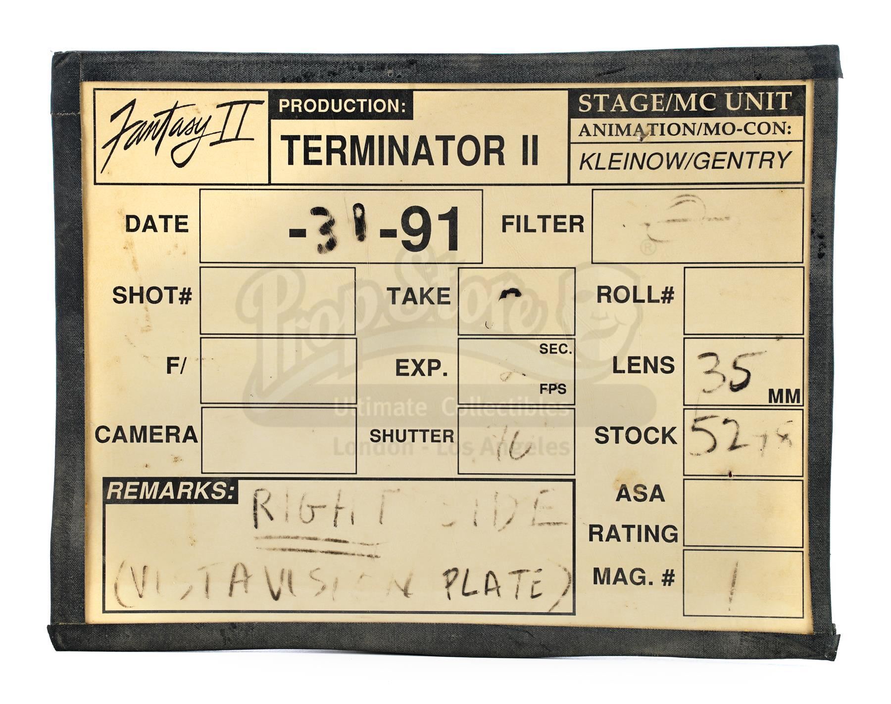 This lot will be auctioned on Thursday, July 1st. The auction will begin at 9:00am PDT and lots are sold sequentially via live auctioneer; tune in to the live streaming broadcast on auction day to follow the pace. Note other lots in the auction may close on June 29th or June 30th. A paper slate from the production of James Cameron's sci-fi action sequel Terminator 2: Judgment Day. Slates were used during filming to keep track of various takes of each shot. It consists of a foam board backing, a printed slate form labeled "Production: Terminator II," a clear plastic sheet with black marker handwriting, and black tape around the edges. It's in good overall condition with some wear from use and age, including discoloration, punctures in the plastic, a bend in the foam, and marker ink fading. Dimensions: 11.75" x 8.75" x 0.5" (30 cm x 22.25 cm x 1.5 cm) Estimate: $1,000 - 1,500