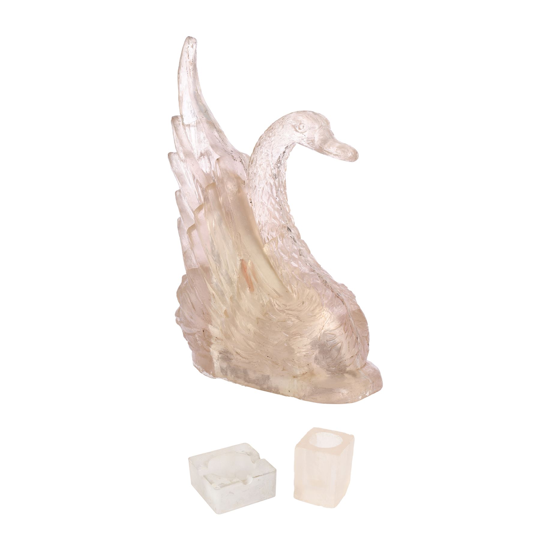 This lot includes a clear resin swan that has plaster and mesh adhered to its hollow interior; a resin drinking glass; and a square glass ashtray. The swan and glass both feature a textured surface to give the appearance they have been sculpted from ice. The swan has chips around the base, peeling of the interior plaster and discolouration from production use, while glue remnants are present on the base of the ashtray.
