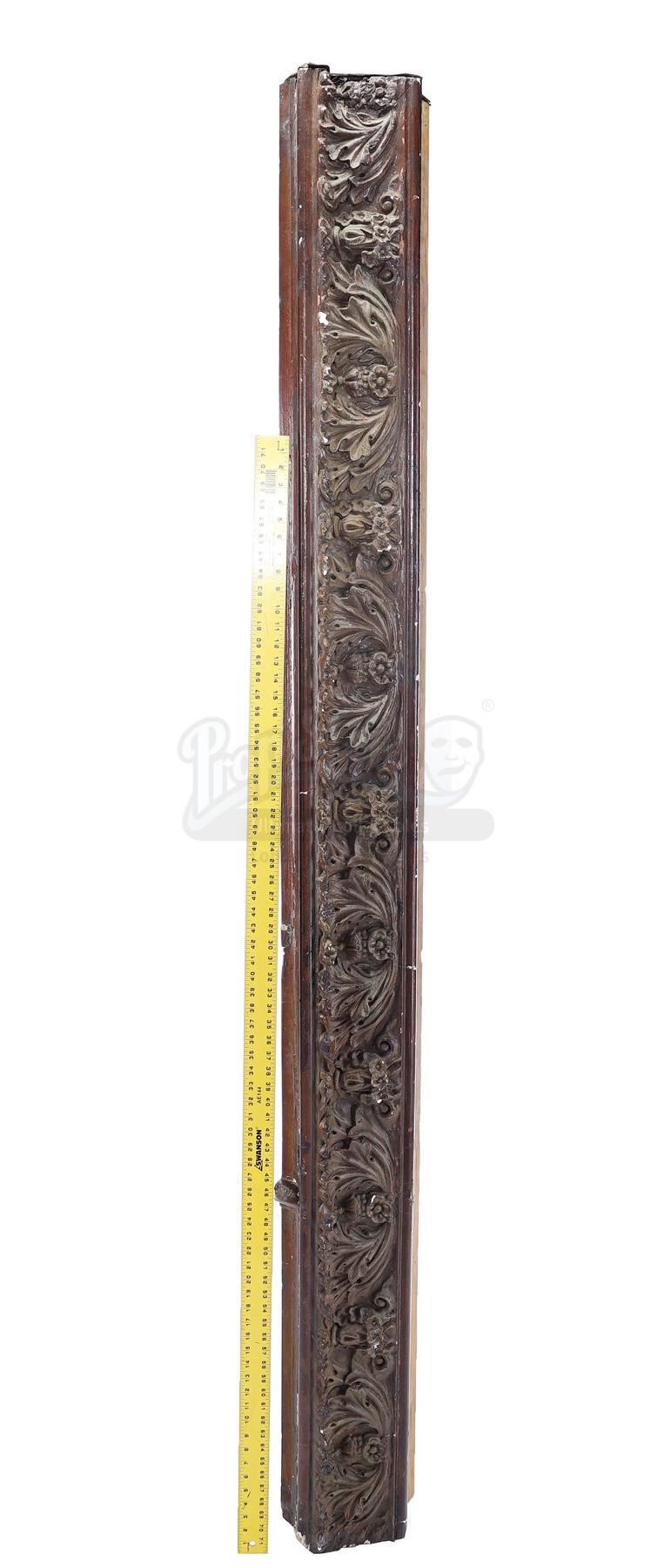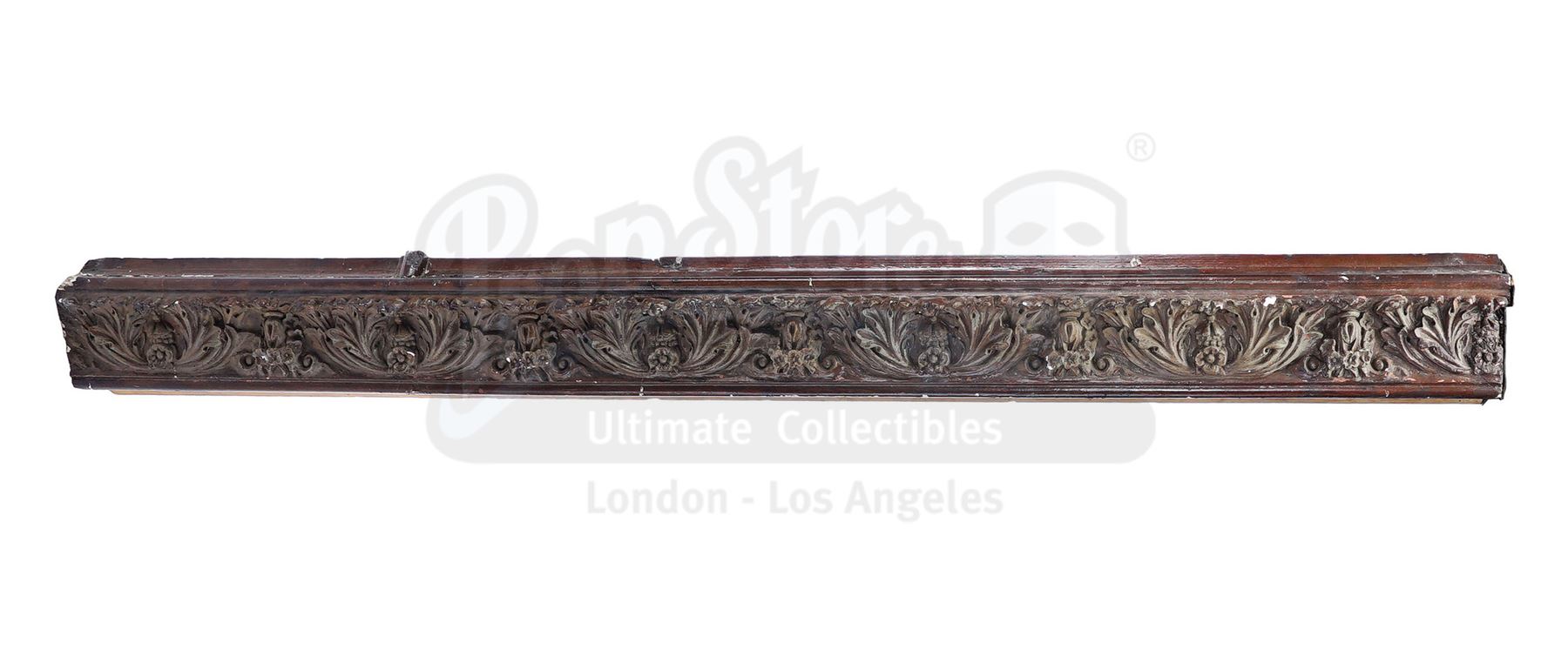 This lot will be auctioned on Thursday, July 1st. The auction will begin at 9:00am PDT and lots are sold sequentially via live auctioneer; tune in to the live streaming broadcast on auction day to follow the pace. Note other lots in the auction may close on June 29th or June 30th. A first-class smoke room crown molding from James Cameron's romantic historical epic Titanic. Members of the financial elite, first class passengers such as Cal Hockley (Billy Zane) smoked cigars and played cards in their private social room aboard the doomed vessel. This section of rectangular wooden molding features carved leaf and floral patterns throughout the display side. It has a pair of metal fasteners on the top and is marked "SMOKING ROOM" on the interior. It exhibits scuffing and paint marks throughout, but remains in good overall condition. Dimensions: 94" x 8.5" x 7.5" (238.75 cm x 21.75 cm x 19 cm) Special shipping required; see notice in the Buyer's Guide. Estimate: $600 - 800