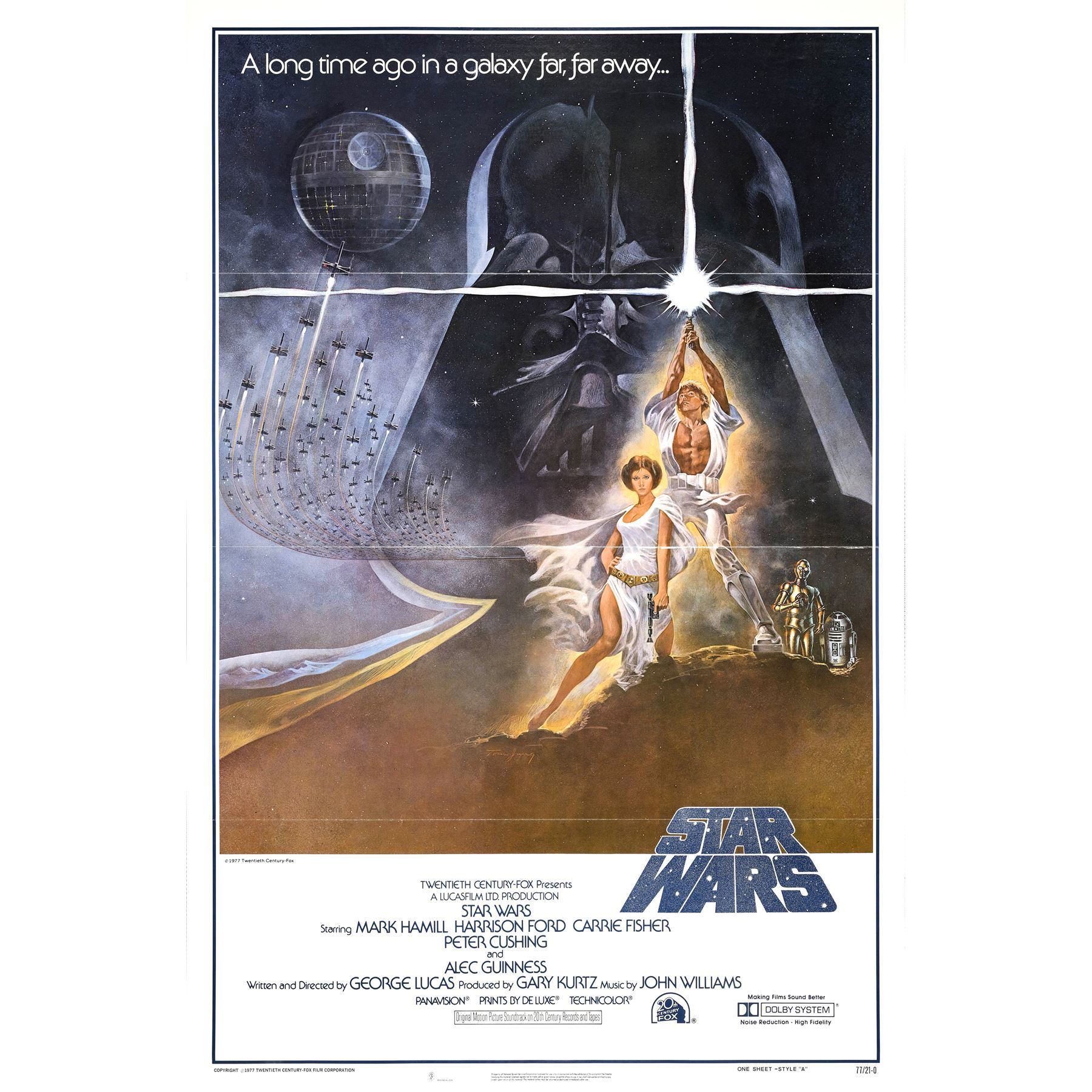 STAR WARS: EPISODE IV - A NEW HOPE (1977) - International Style "A" First Print One-Sheet - An international style "A" first print one-sheet from the promotion of George Lucas' Star Wars: A New Hope. The poster features art by Tom Jung depicting Luke Skywalker (Mark Hamill) raising his lightsaber above Princess Leia (Carrie Fisher) with Darth Vader (David Prowse) and the Death Star looming behind.