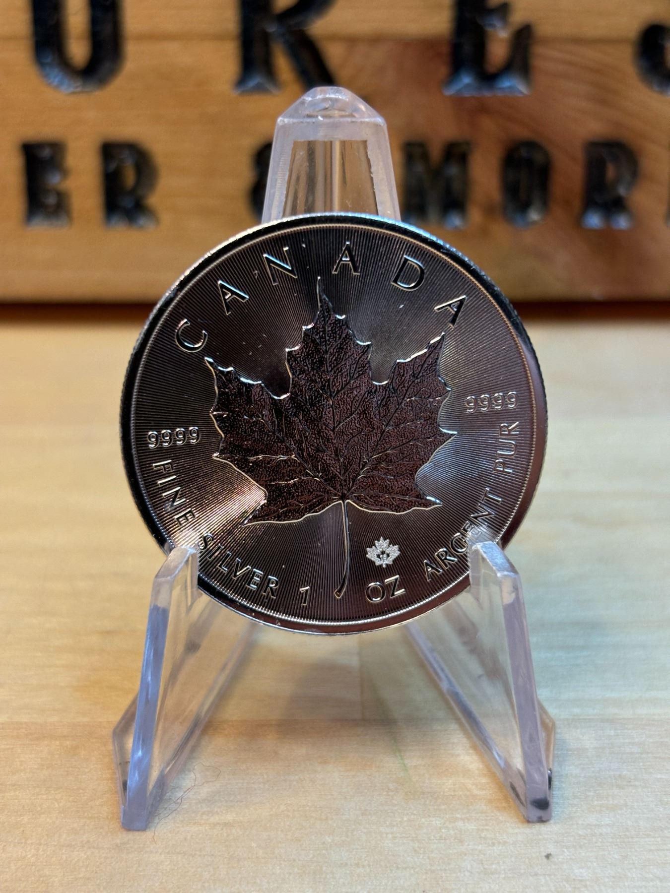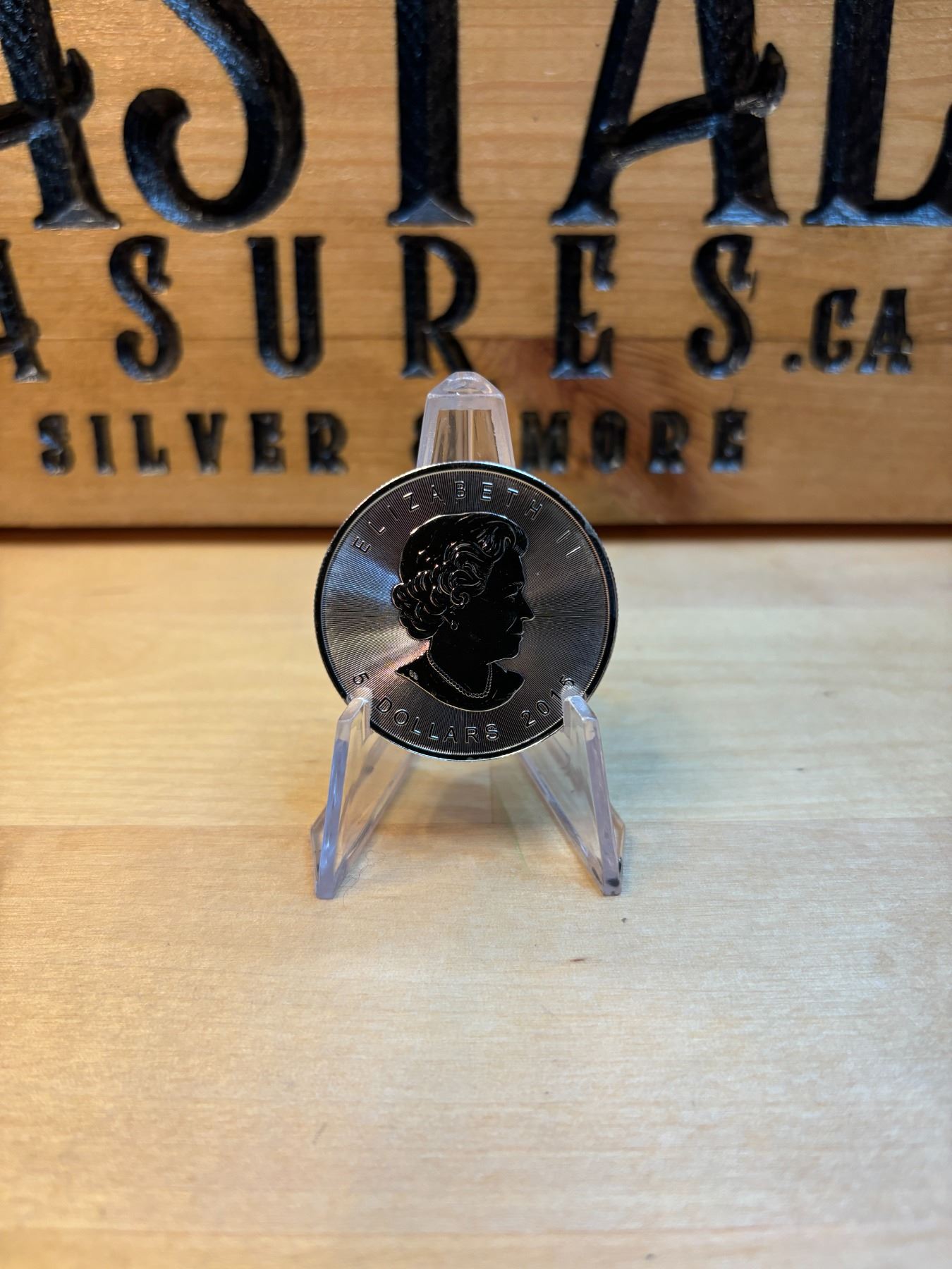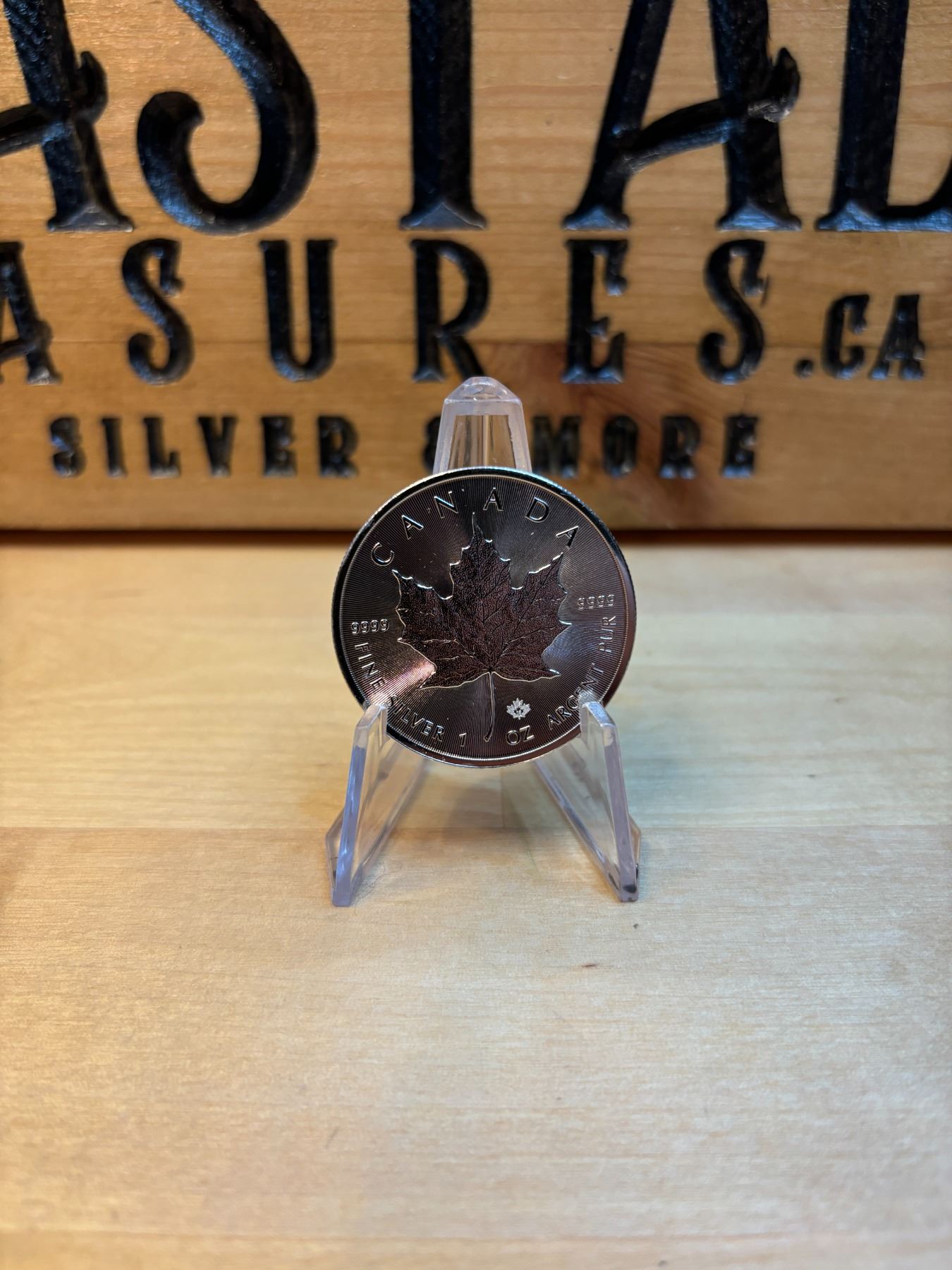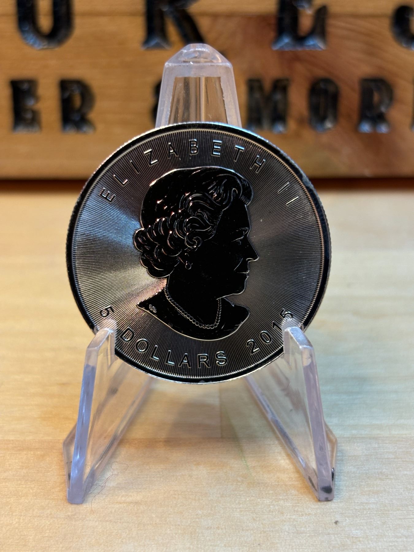 The 1 oz Canadian Maple 2015 Silver coin is a highly regarded bullion coin from the Royal Canadian Mint, containing 99.99% pure silver. The coin features a distinctive maple leaf design on the reverse, symbolizing Canada's national heritage, while the obverse displays an image of Queen Elizabeth II. Weighing 1 ounce (31.1035 grams) and measuring 38 mm in diameter, it is a popular choice among investors and collectors for its purity, design, and the mint's trusted reputation.