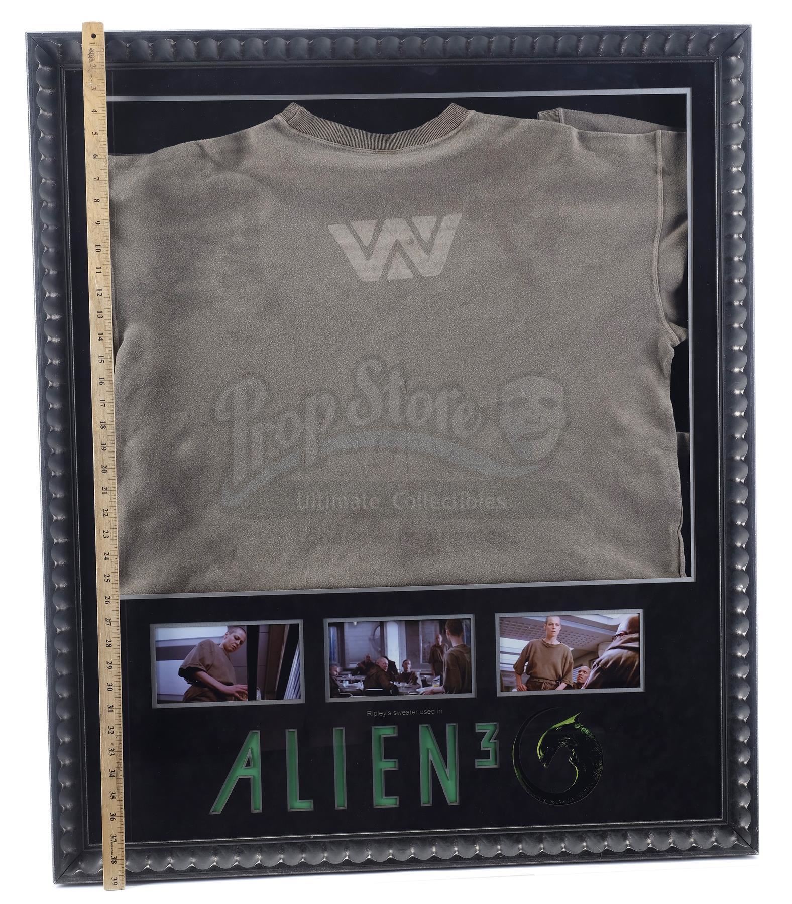 This lot will be auctioned on Tuesday, June 29th. The auction will begin at 9:00am PDT and lots are sold sequentially via live auctioneer; tune in to the live streaming broadcast on auction day to follow the pace. Note other lots in the auction may close on June 30th or July 1st. Ripley's (Sigourney Weaver) sweater from David Fincher's sci-fi horror thriller Alien 3. After her escape pod crashed on a Fury 161, Ripley wore standard prison issue clothing while teaming with a group of convicts-turned-monks as they defended themselves from a new breed of xenomorph. The lot consists of a chartreuse cotton-blend shirt with a white Weyland-Yutani Corporation graphic on the back. It is displayed under plexiglass in a black wood frame with a mat which features the film's title and item description as well as images of Ripley wearing the item. It exhibits minor signs of wear, but remains in good overall condition. Dimensions (displayed): 39.25" x 33.25" x 3.25" (99.75 cm x 84.5 cm x 8.25 cm) Estimate: $2,000 - 3,000