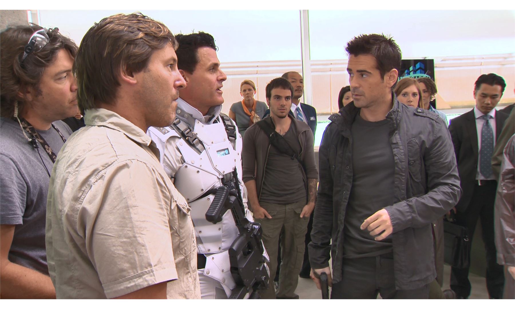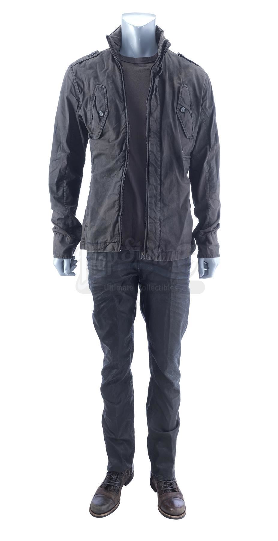 This lot will be auctioned on Thursday, July 1st. The auction will begin at 9:00am PDT and lots are sold sequentially via live auctioneer; tune in to the live streaming broadcast on auction day to follow the pace. Note other lots in the auction may close on June 29th or June 30th. Douglas Quaid's (Colin Farrell) costume from Len Wiseman's sci-fi thriller remake Total Recall. Factory worker Quaid wore his costume while evading authorities after a visit to a memory implant parlor revealed that he might not be who he thought he was. This costume consists of a charcoal gray zip-up jacket labeled "QUAID STAGE 1 HERO" on the interior; a dark green cotton short-sleeve T-shirt; a pair of navy denim jeans; and a pair of brown leather and rubber stunt boots. It exhibits signs of use and wear including production-added distress and scuffing on the boots, but remains in good overall condition. Estimate: $1,500 - 2,500