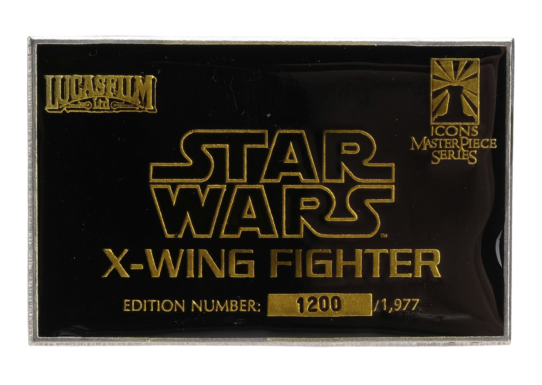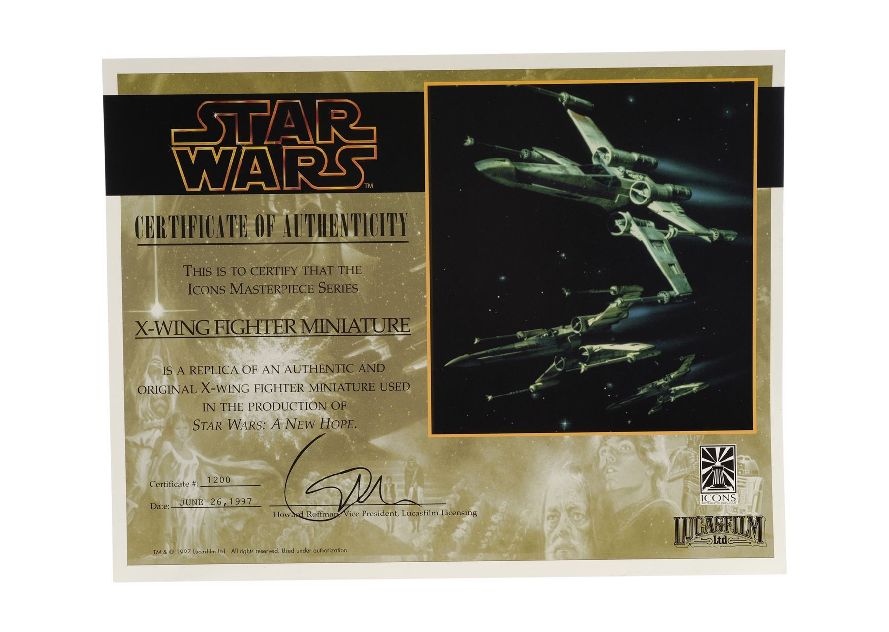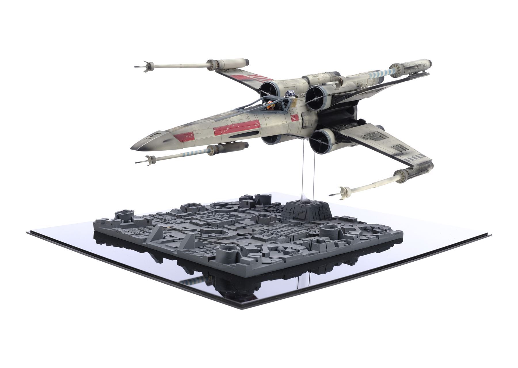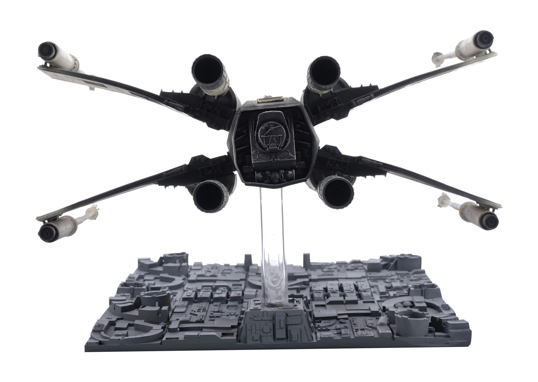 This ornately detailed resin model, one of a 1,977-piece release in 1997, comes from the collection of veteran model maker Dave Jones. It is aged, hand-painted, and mounted with clear plastic pipe to a gray resin base molded to resemble the Death Star's surface and affixed with a plaque engraved "X-wing Fighter." Also included are an ICONS/Lucasfilm Certificate of Authenticity; a booklet, pamphlet, and mail card; four instructional pages; a plaque; a case, and the original box. The model exhibits minor imperfections and grime buildup. Dimensions: 25" x 27.5" x 18" (63.5 cm x 70 cm x 45.75 cm)