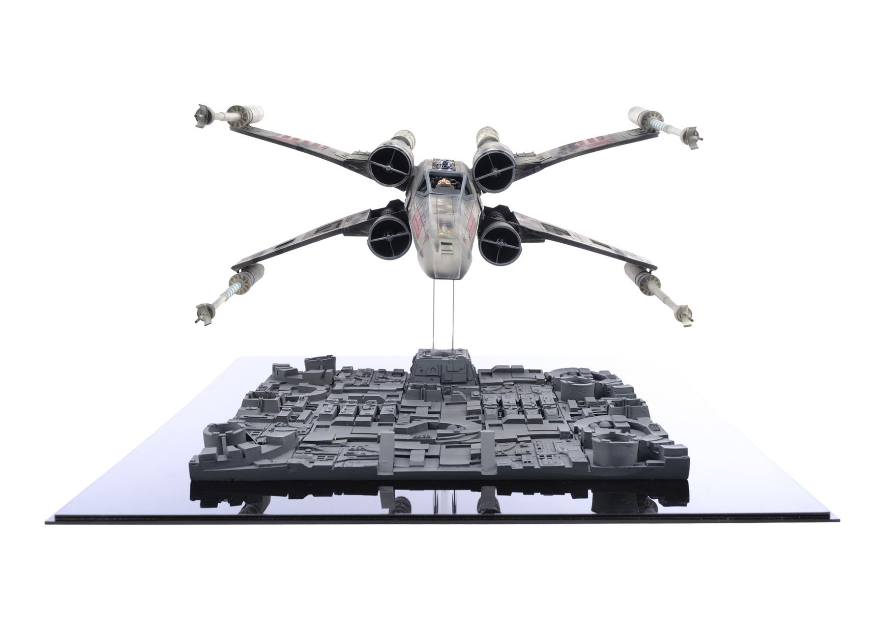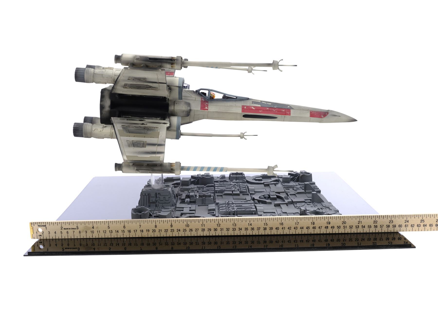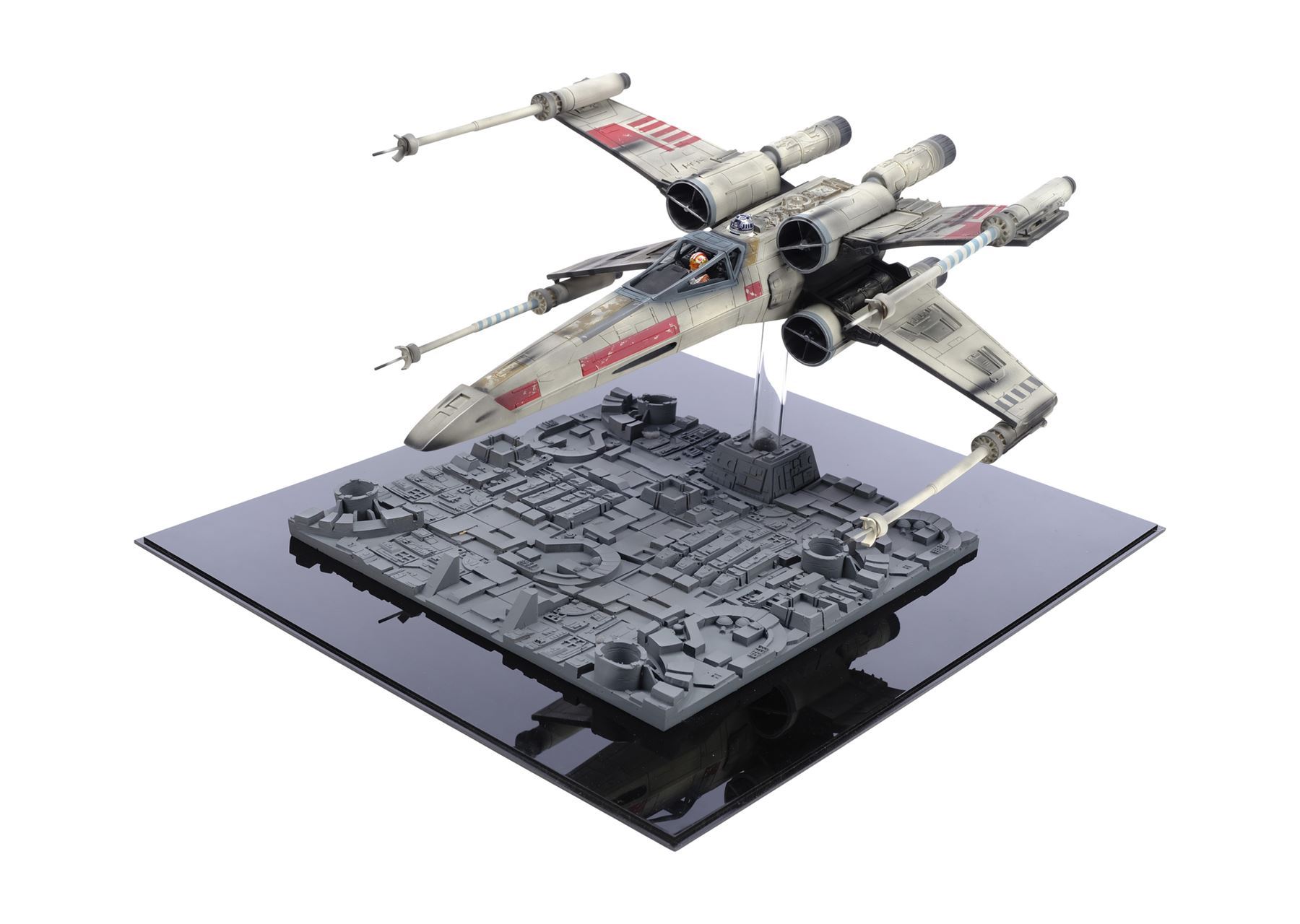 This ornately detailed resin model, one of a 1,977-piece release in 1997, comes from the collection of veteran model maker Dave Jones. It is aged, hand-painted, and mounted with clear plastic pipe to a gray resin base molded to resemble the Death Star's surface and affixed with a plaque engraved "X-wing Fighter." Also included are an ICONS/Lucasfilm Certificate of Authenticity; a booklet, pamphlet, and mail card; four instructional pages; a plaque; a case, and the original box. The model exhibits minor imperfections and grime buildup. Dimensions: 25" x 27.5" x 18" (63.5 cm x 70 cm x 45.75 cm)