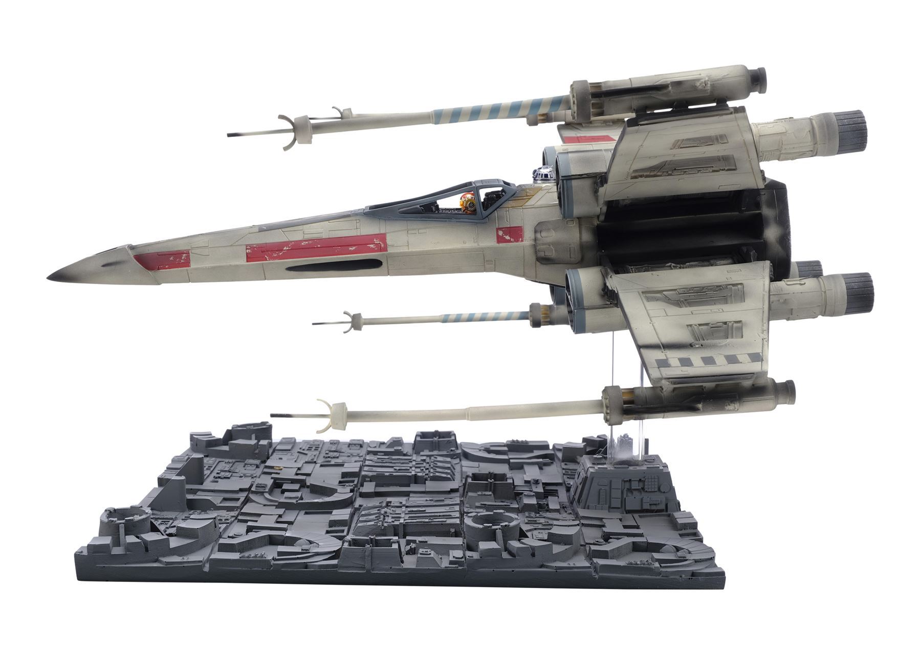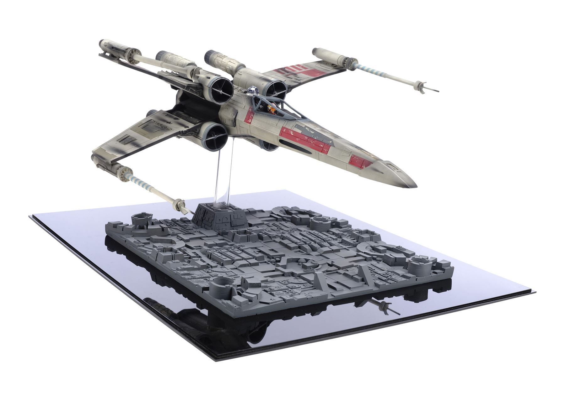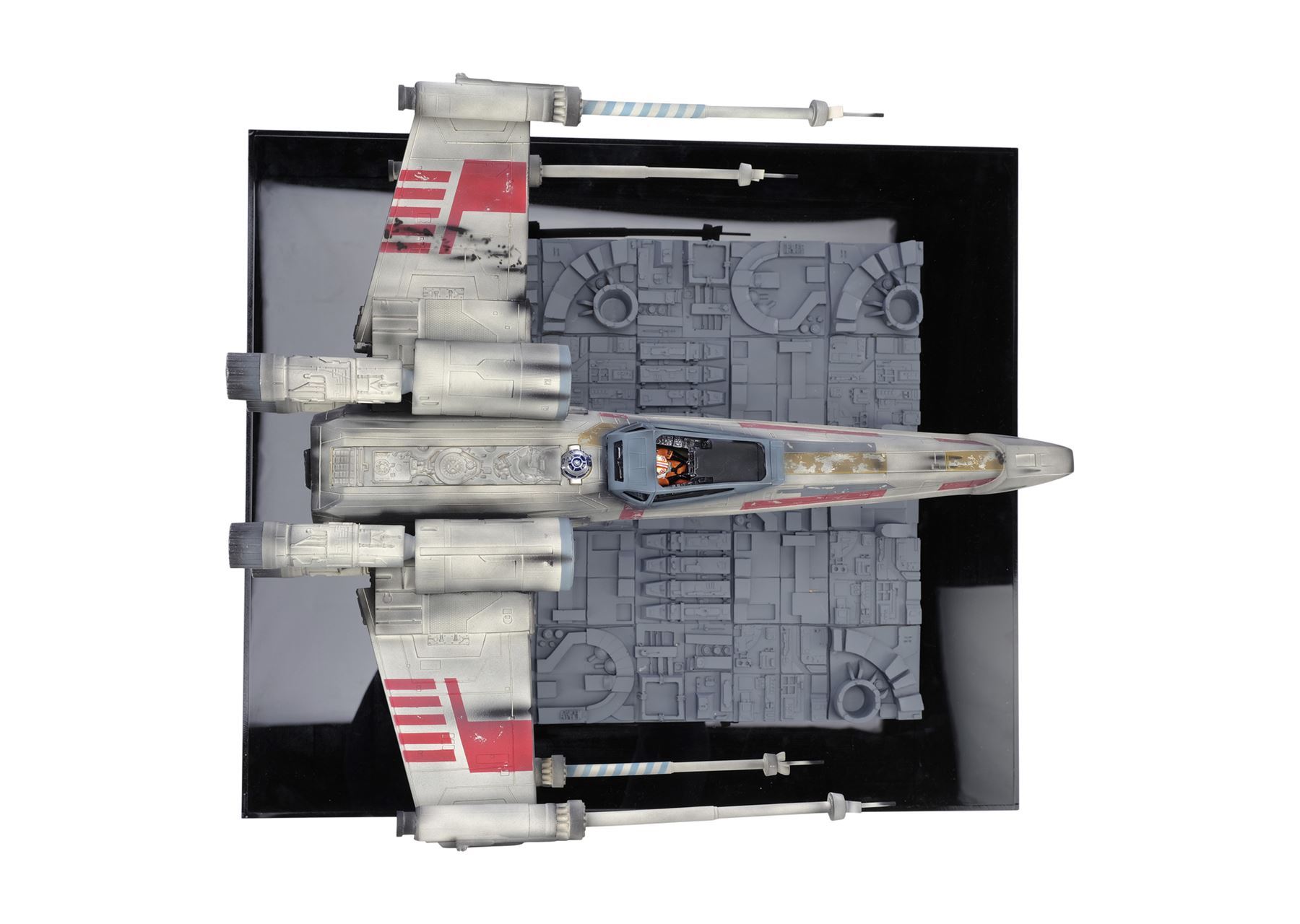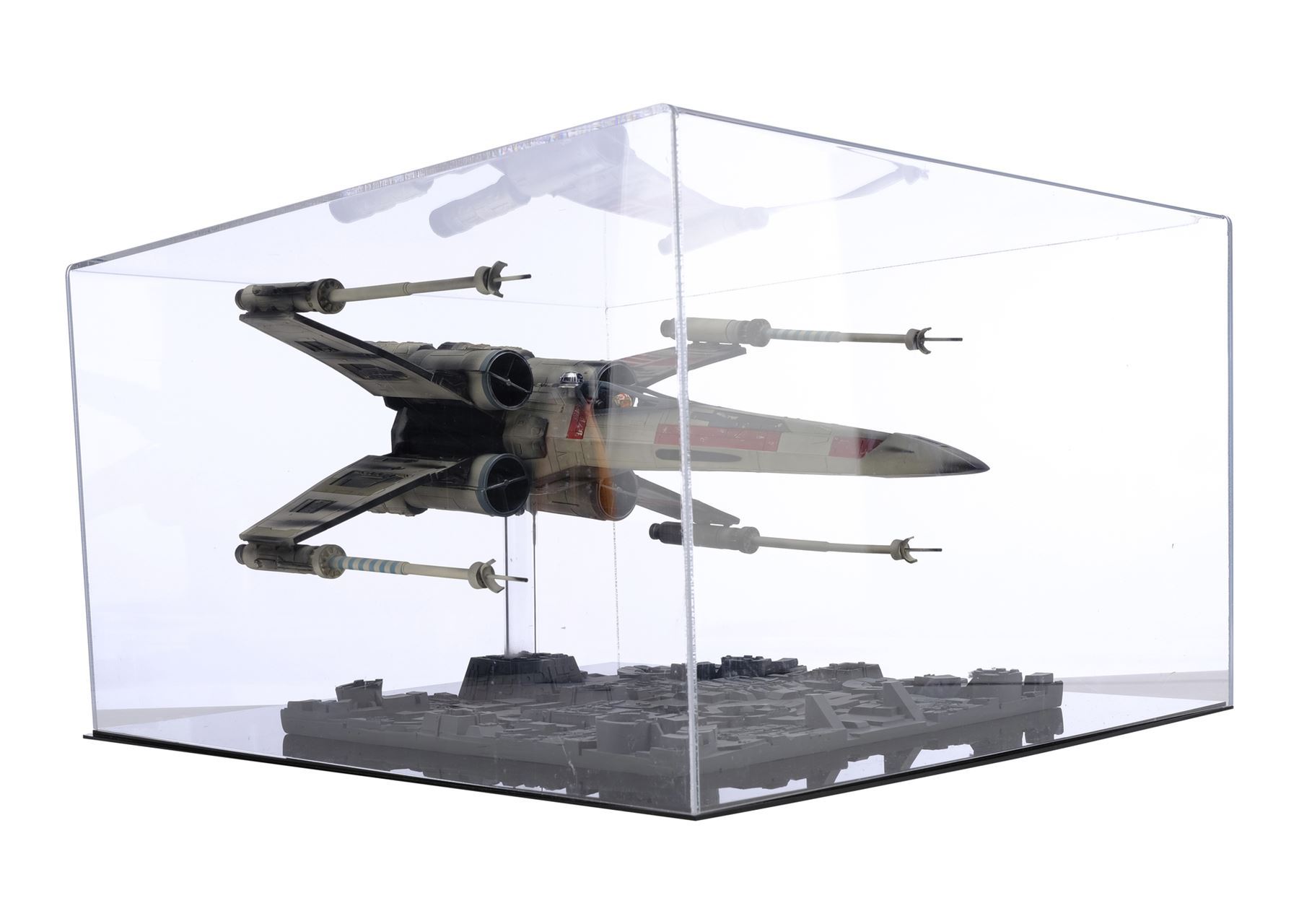 This ornately detailed resin model, one of a 1,977-piece release in 1997, comes from the collection of veteran model maker Dave Jones. It is aged, hand-painted, and mounted with clear plastic pipe to a gray resin base molded to resemble the Death Star's surface and affixed with a plaque engraved "X-wing Fighter." Also included are an ICONS/Lucasfilm Certificate of Authenticity; a booklet, pamphlet, and mail card; four instructional pages; a plaque; a case, and the original box. The model exhibits minor imperfections and grime buildup. Dimensions: 25" x 27.5" x 18" (63.5 cm x 70 cm x 45.75 cm)