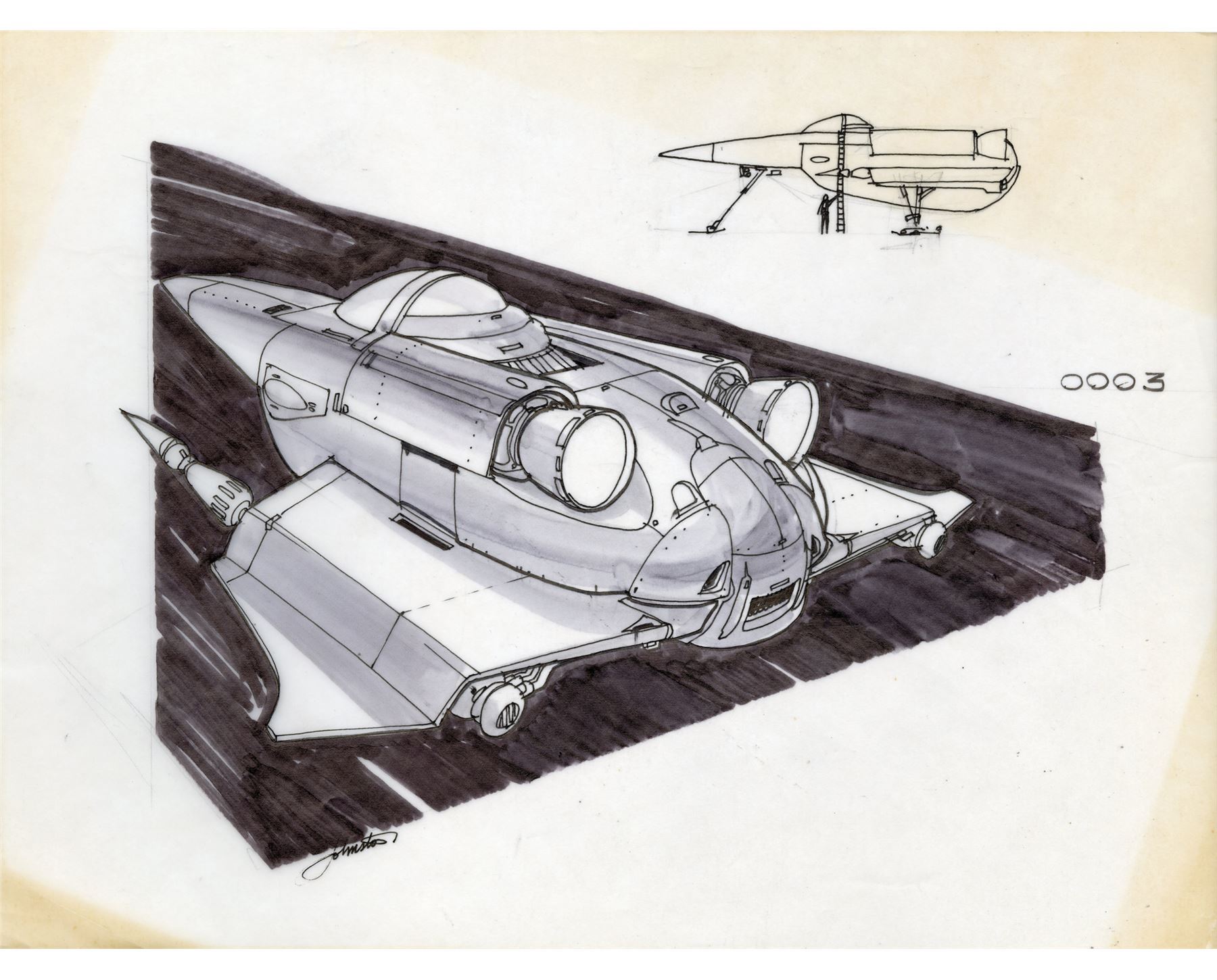 STAR WARS: EPISODE V - THE EMPIRE STRIKES BACK (1980) - Hand-Drawn Joe Johnston Early Snowspeeder Concept Sketch - An early snowspeeder concept sketch hand-drawn by visual effects art director Joe Johnston for the production of Irvin Kershner's Star Wars: The Empire Strikes Back. Rebel pilots flew their snowspeeders throughout the Battle of Hoth, including when Luke Skywalker (Mark Hamill) used his to take down an Imperial AT-AT.