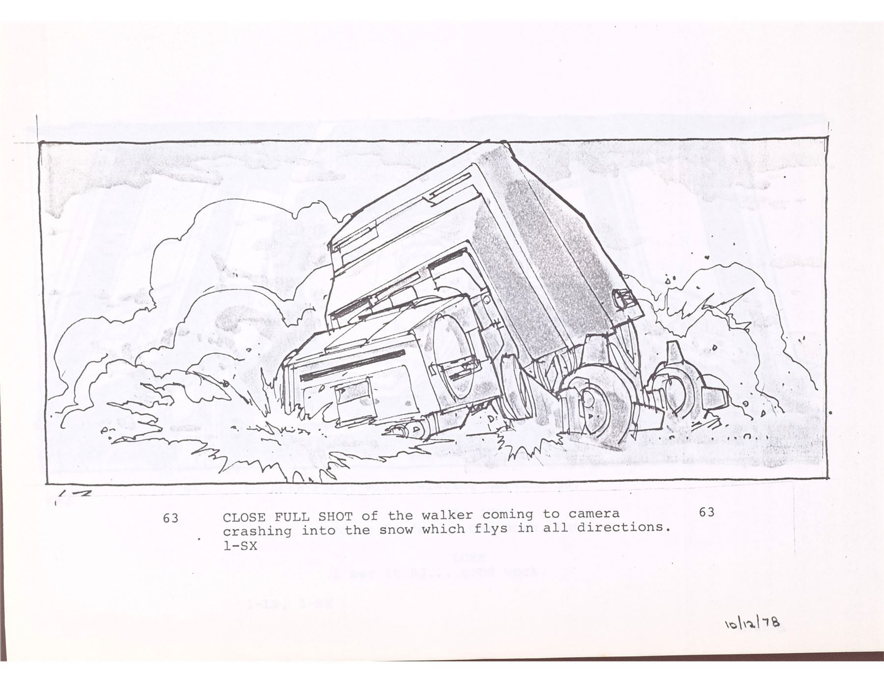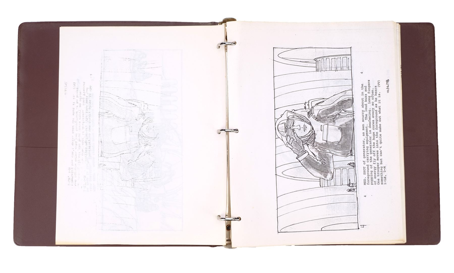 STAR WARS: EPISODE V - THE EMPIRE STRIKES BACK (1980) - Lorne Peterson Collection: Imperial Walker Sequence Storyboard Binder - An Imperial Walker sequence storyboard binder from Irvin Kershner's Star Wars: The Empire Strikes Back. This brown binder marked "Model Shop" on the front and spine and "Lorne Peterson" labeled on the spine comes from the collection of chief model maker Lorne Peterson. It features 136 pages of storyboards printed on white pages with dates, numbers, and notes, and an abbreviation key. This lot exhibits grime on the exterior from age, discoloration, and sticking pages. Dimensions: 10" x 11.5" x 1.5" (28 cm x 29.25 cm x 10.25 cm)