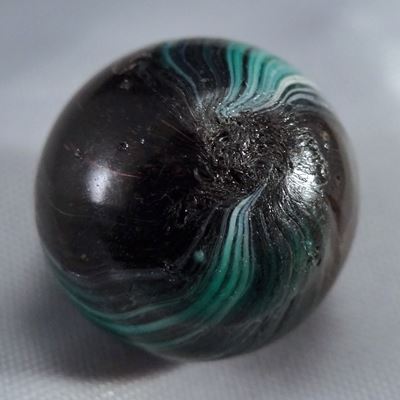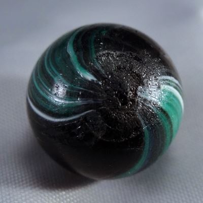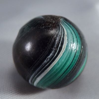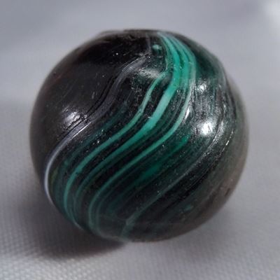 Black base with two bands of stretched green and white covering about forty percent of the surface. Germany, circa 1860-1920. 17/32". Mint (9.8).