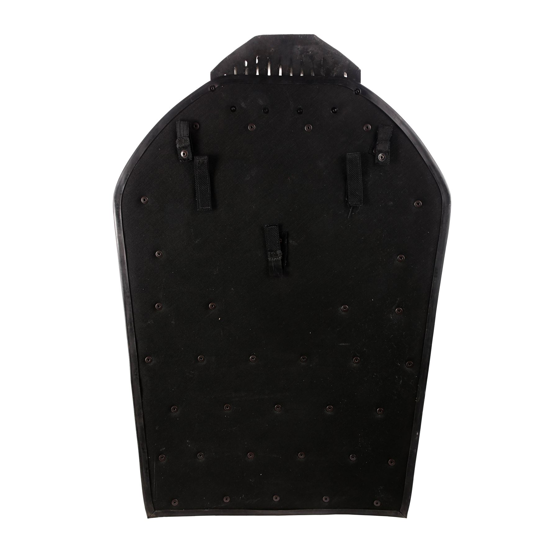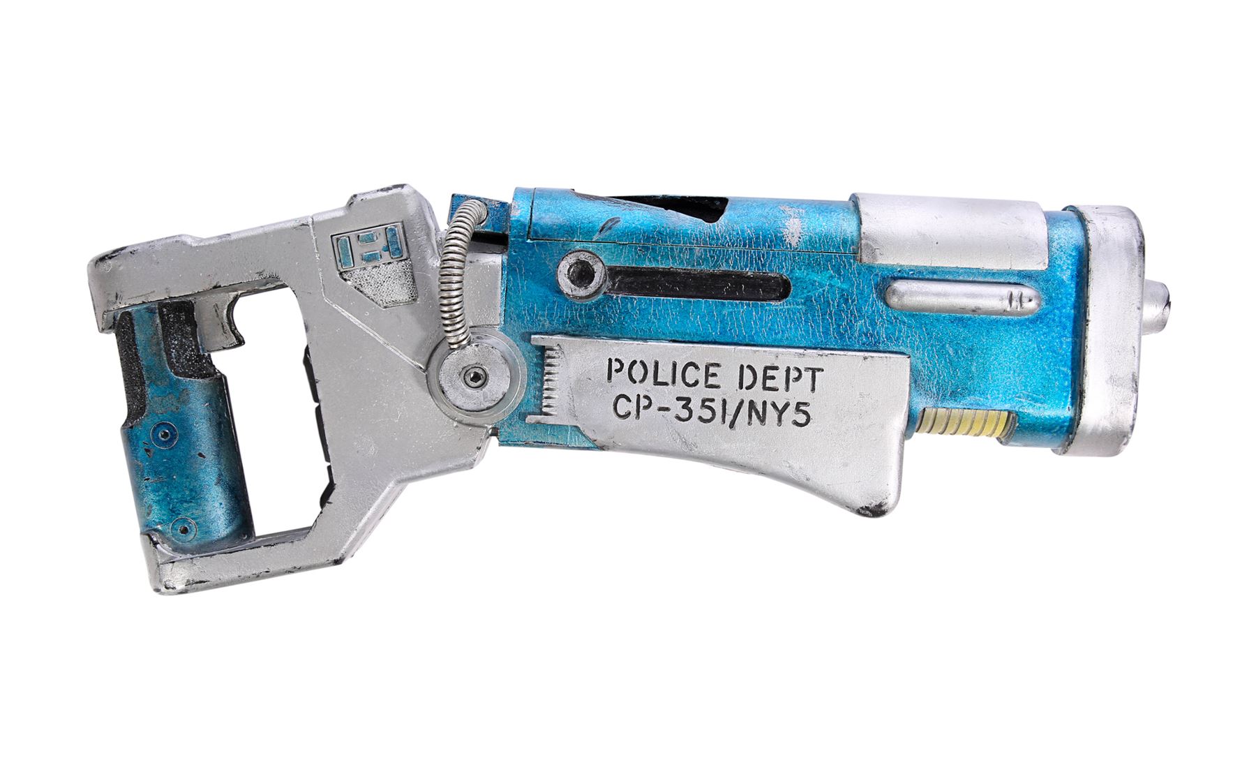 Accompanying the costume is a dense rubber riot shield, a rubber truncheon and a blue-and-faux-silver stunt gun. The shield displays protruding rubber spikes and a yellow "Police" emblem on the front. Engraved text adorns both sides of the gun and a magnet is adhered to the underside, allowing the weapon to be attached to the costume's left shoulder.