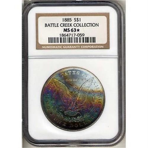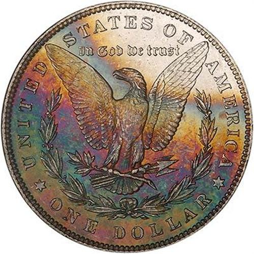 1885 Morgan Dollar. Another with exciting multicolor toning on the reverse. (#7158)<p><i>from The Battle Creek Collection, Part III</i>