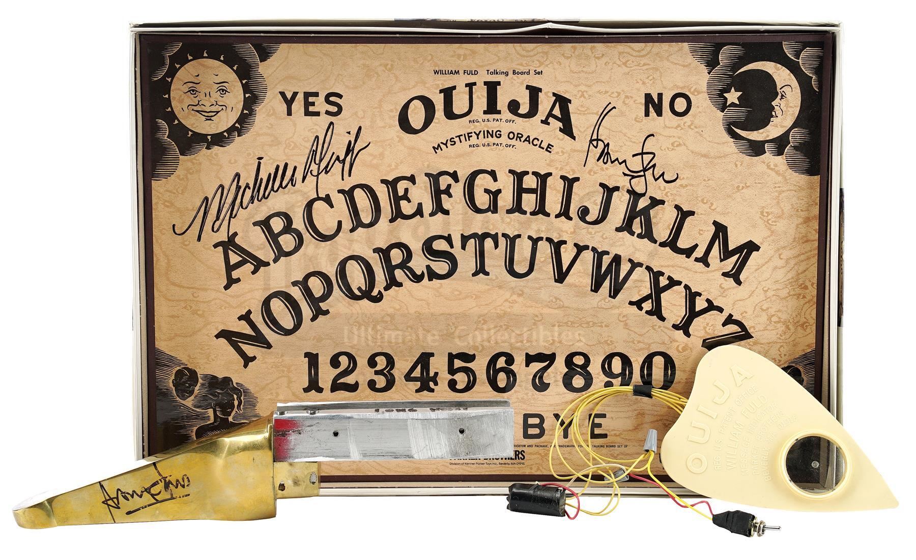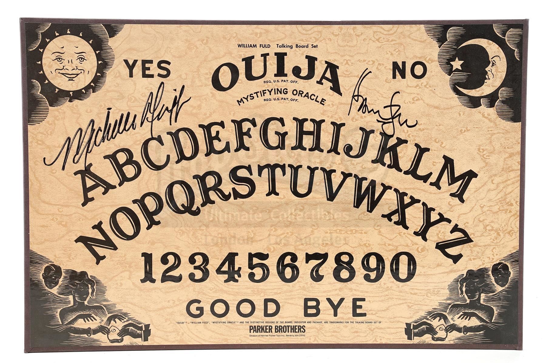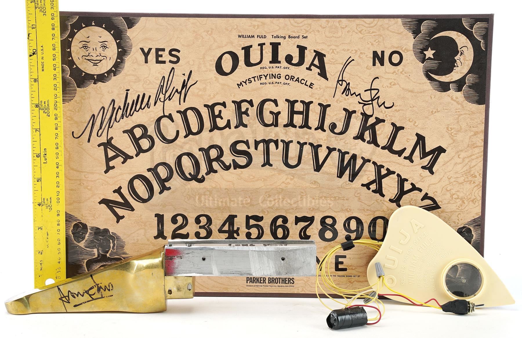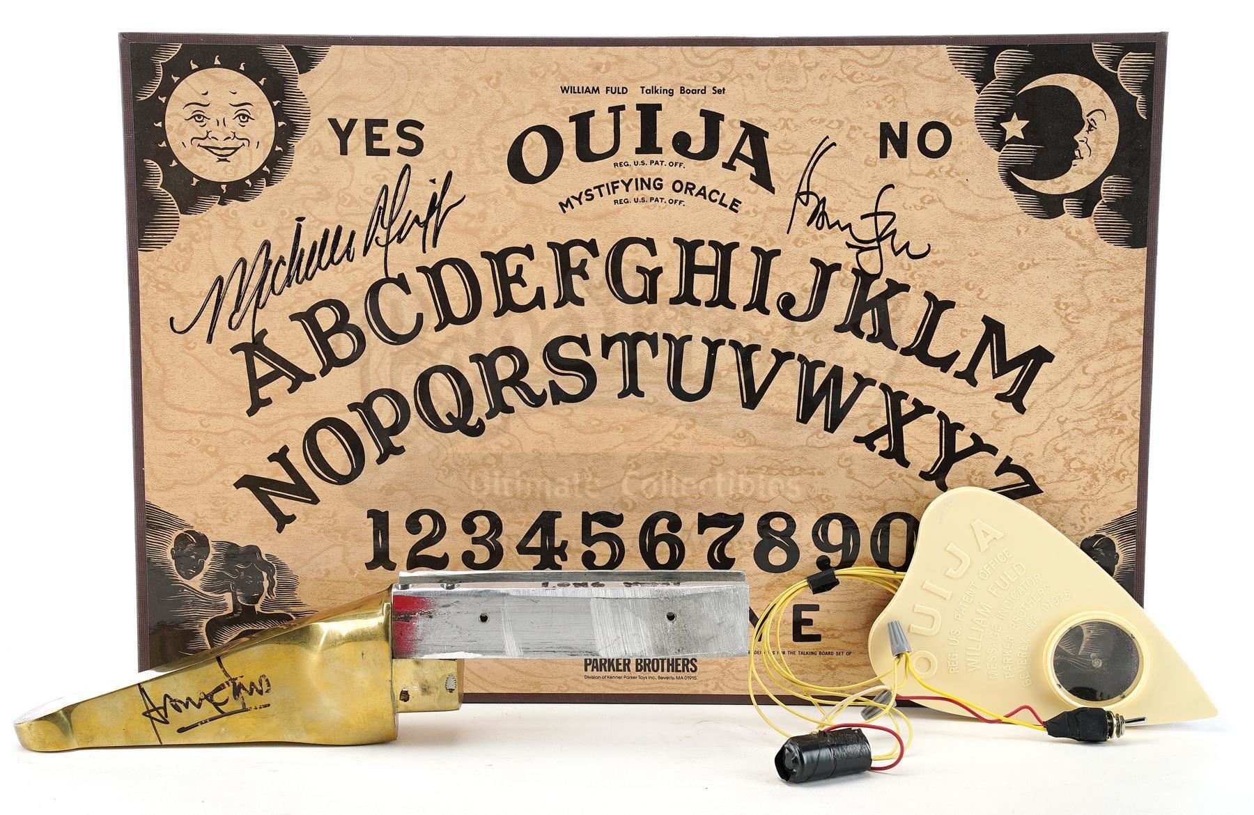 This lot will be auctioned on Thursday, July 1st. The auction will begin at 9:00am PDT and lots are sold sequentially via live auctioneer; tune in to the live streaming broadcast on auction day to follow the pace. Note other lots in the auction may close on June 29th or June 30th. Harrison Ford and Michelle Pfeiffer-signed ouija board with light up planchette and signed mast piece from Robert Zameckis' supernatural thriller What Lies Beneath. Musician Claire (Pfeiffer) used a ouija board to communicate with a ghost, then went sailing. This lot consists of a Ford and Pfeiffer autographed beige and black cardboard ouija board and beige plastic planchette in a cardboard box. The planchette has light bulbs attached to a battery pack and switch via a series of wires. Included is a metal mast piece signed by Ford. It exhibits signs of wear from age and use, but remains in excellent overall condition. Dimensions: 18" x 12" x 4" (45.75 cm x 50.5 cm x 10.25 cm) Contains electronic components; see notice in the Buyer's Guide. This lot comes from the collection of renowned special effects artist Tom "Brooklyn" Bellissimo. A letter of authenticity from Bellissimo is included. Estimate: $2,000 - 3,000