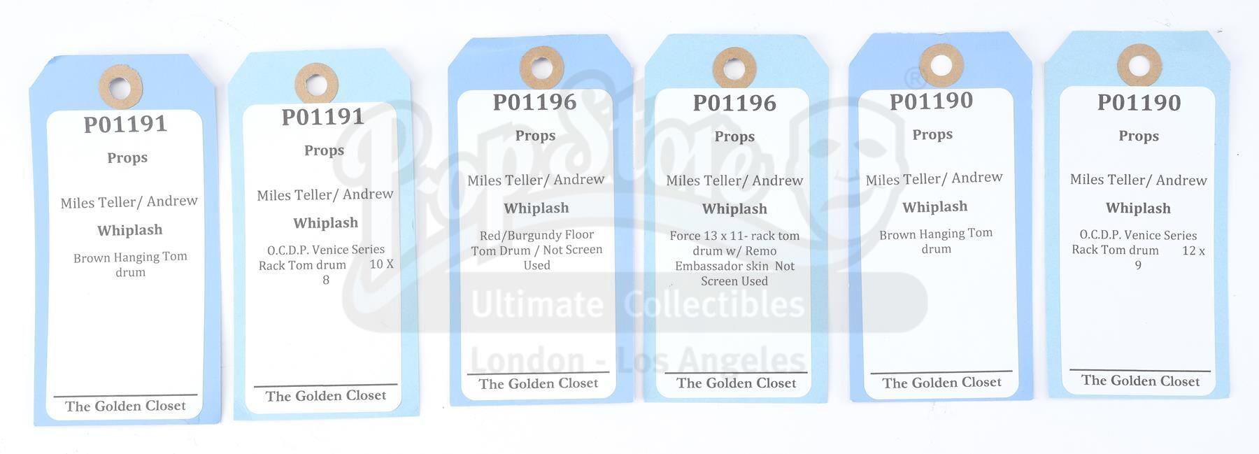 This lot will be auctioned on Thursday, July 1st. The auction will begin at 9:00am PDT and lots are sold sequentially via live auctioneer; tune in to the live streaming broadcast on auction day to follow the pace. Note other lots in the auction may close on June 29th or June 30th. Andrew Neiman's (Miles Teller) drum set from Damien Chazelle's jazz-based drama Whiplash. Neiman played drums throughout the film under the tutelage of his abusive jazz instructor, Fletcher (J.K. Simmons.) This set includes one small and one large brown steel drums with Evans Level 360 G2 drum heads as well as one red steel drum from Neiman's personal set with Remo Weatherking Coated Ambassador drum heads. It exhibits extensive drum marks, dings, and dents throughout from production, and remains in good overall condition. Dimensions (largest): 13" x 13" x 10" (33 cm x 33 cm x 25.5 cm); (smallest): 10" x 10" x 7" (25.5 cm x 25.5 cm x 18 cm) Estimate: $2,000 - 3,000