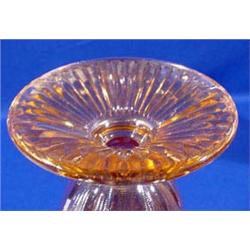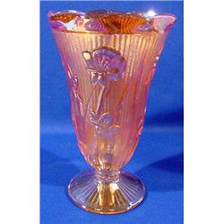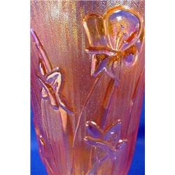 Two (2) Iris and Herring Bone vases; probably Jeanette pattern; marigold; Carnival glass; 9" high. Est. $40 - $60.