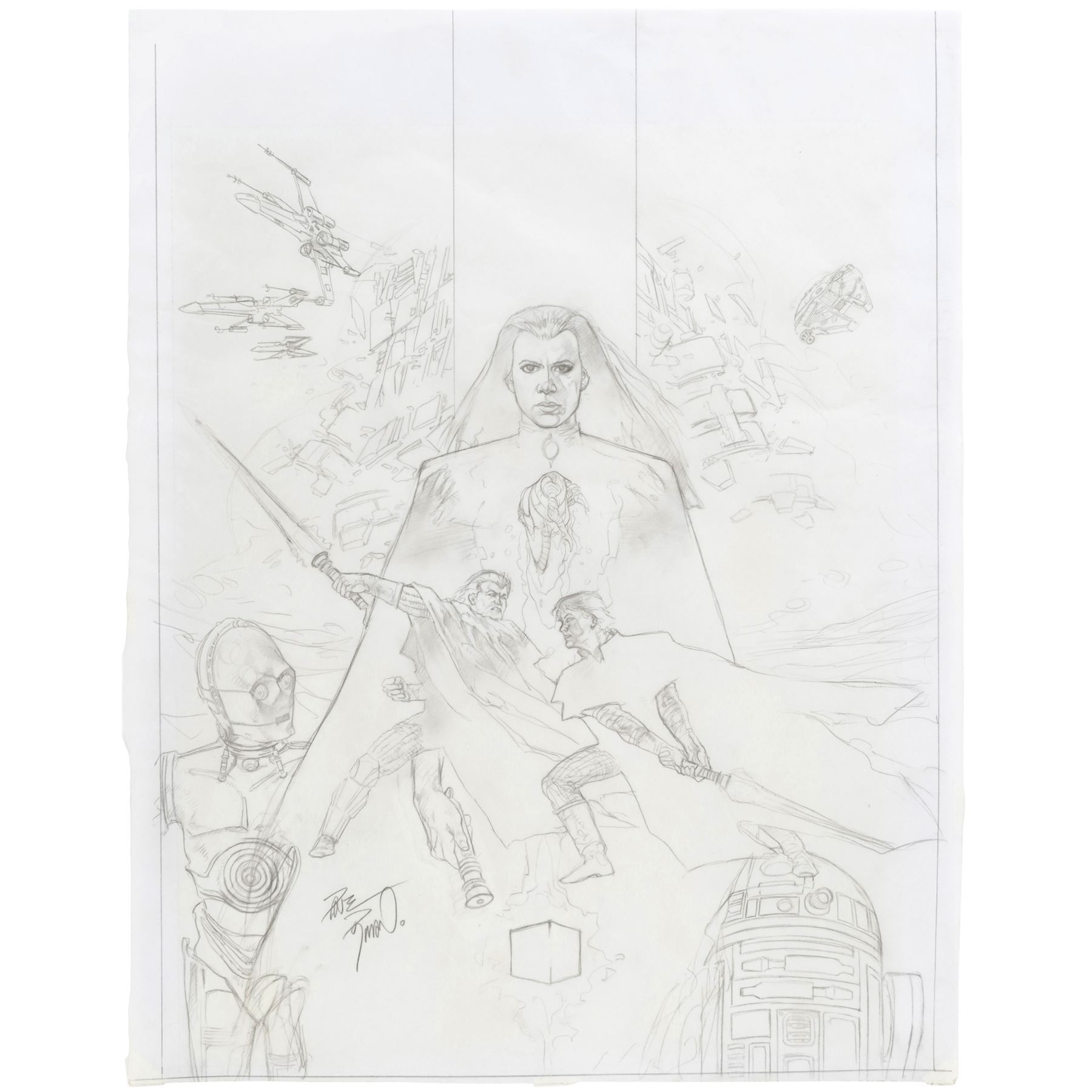 This sketch depicting Luke Skywalker, Emperor Palpatine, and a lightsaber-wielding Leia Organa comes from the personal collection of William Plumb. It is rendered and signed by Dorman in graphite on paper. Also included is a copy of the Dark Empire No. 6 cover. The lot exhibits eraser marks and edge wear throughout. Dimensions: (largest) 26" x 21" (66 cm x 53.5 cm)