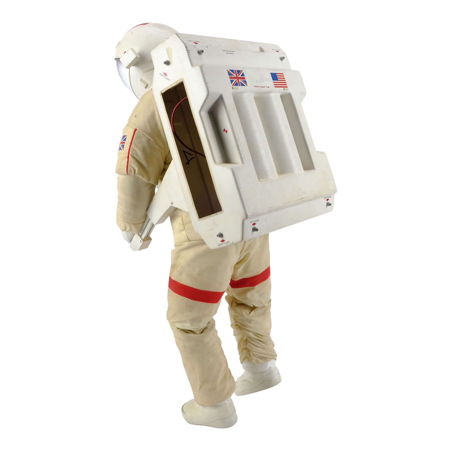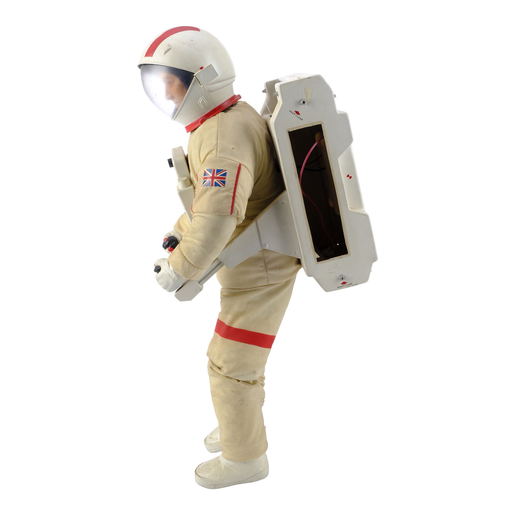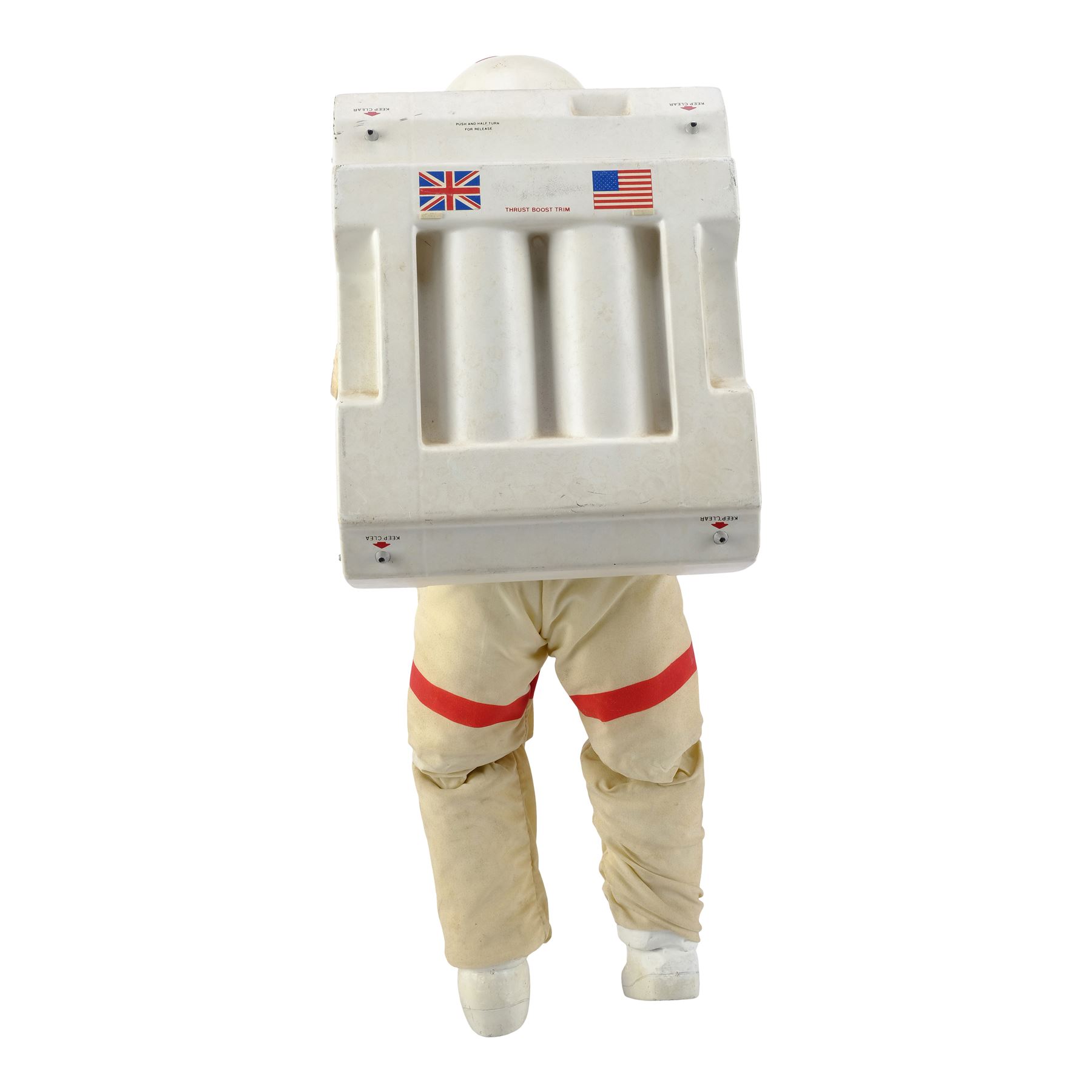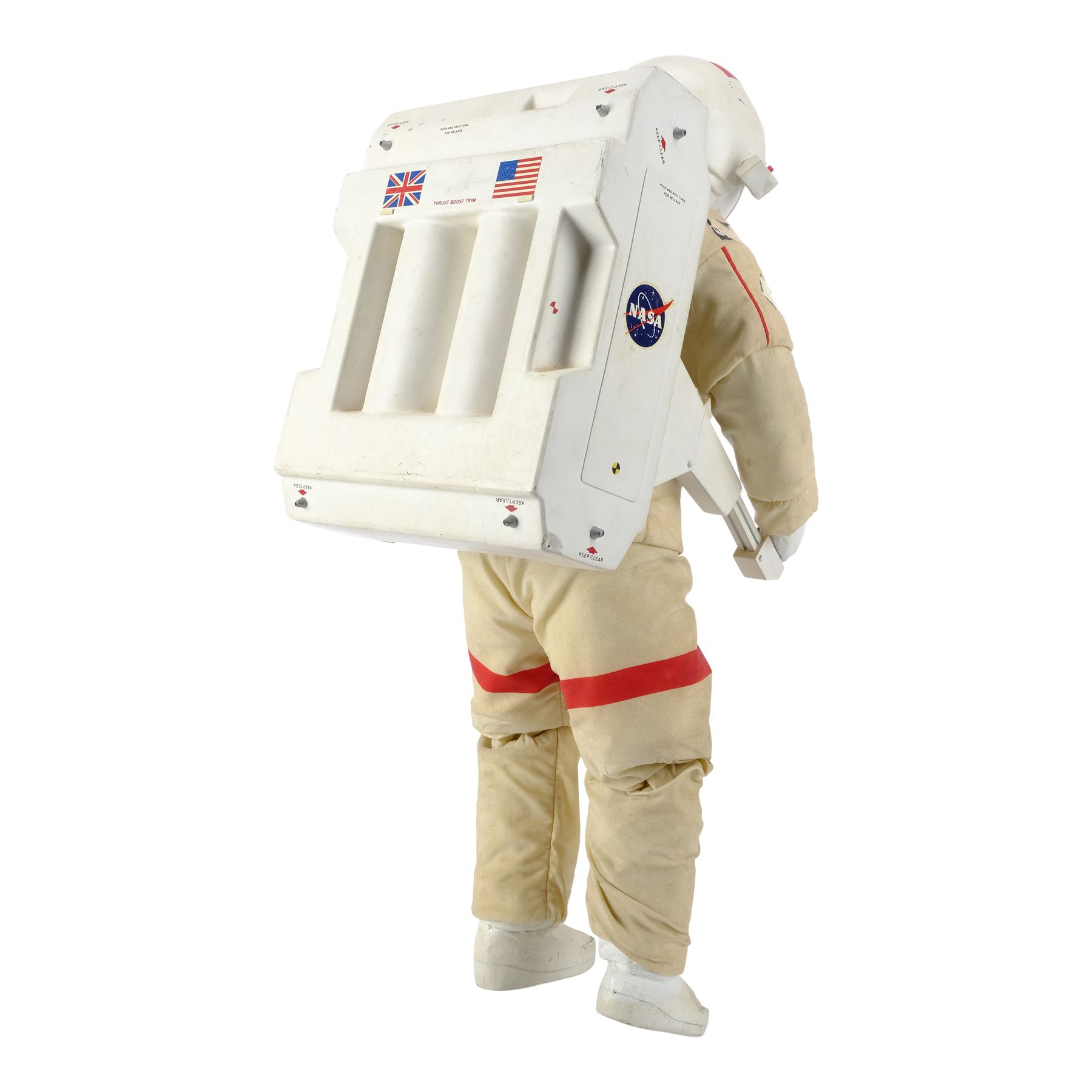 The body is made of plaster and dressed in a baggy Spandex spacesuit that is decorated with flag and emblem stickers at the shoulders. Attached to the chest via tape is a life-support-system box which is made of vacuum-formed plastic. The puppet is outfitted with a NASA Manned Manoeuvering Unit, which is made of vacuum-formed plastic and decorated with both US and UK flag stickers. The puppet previously had wires attached to suspend the piece and make the legs kick; however, these wires have since been cut. The prop exhibits some wear due to production use and age, including torn stickers and a missing compartment door on the Manned Manoeuvering Unit. Dimensions: 20.5 cm x 20.5 cm x 48.5 cm (8" x 8" x 19")