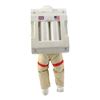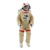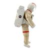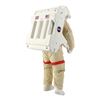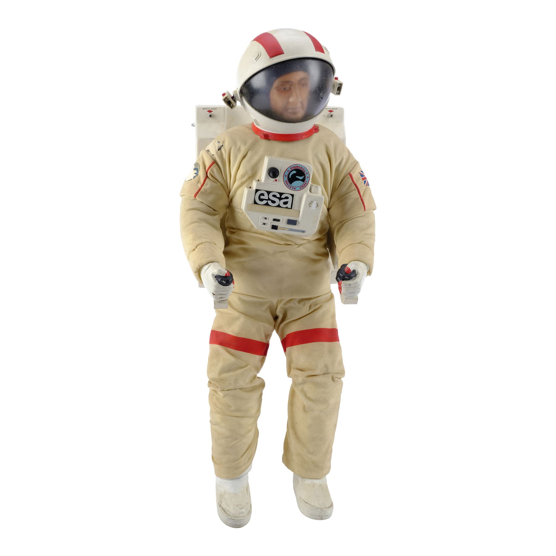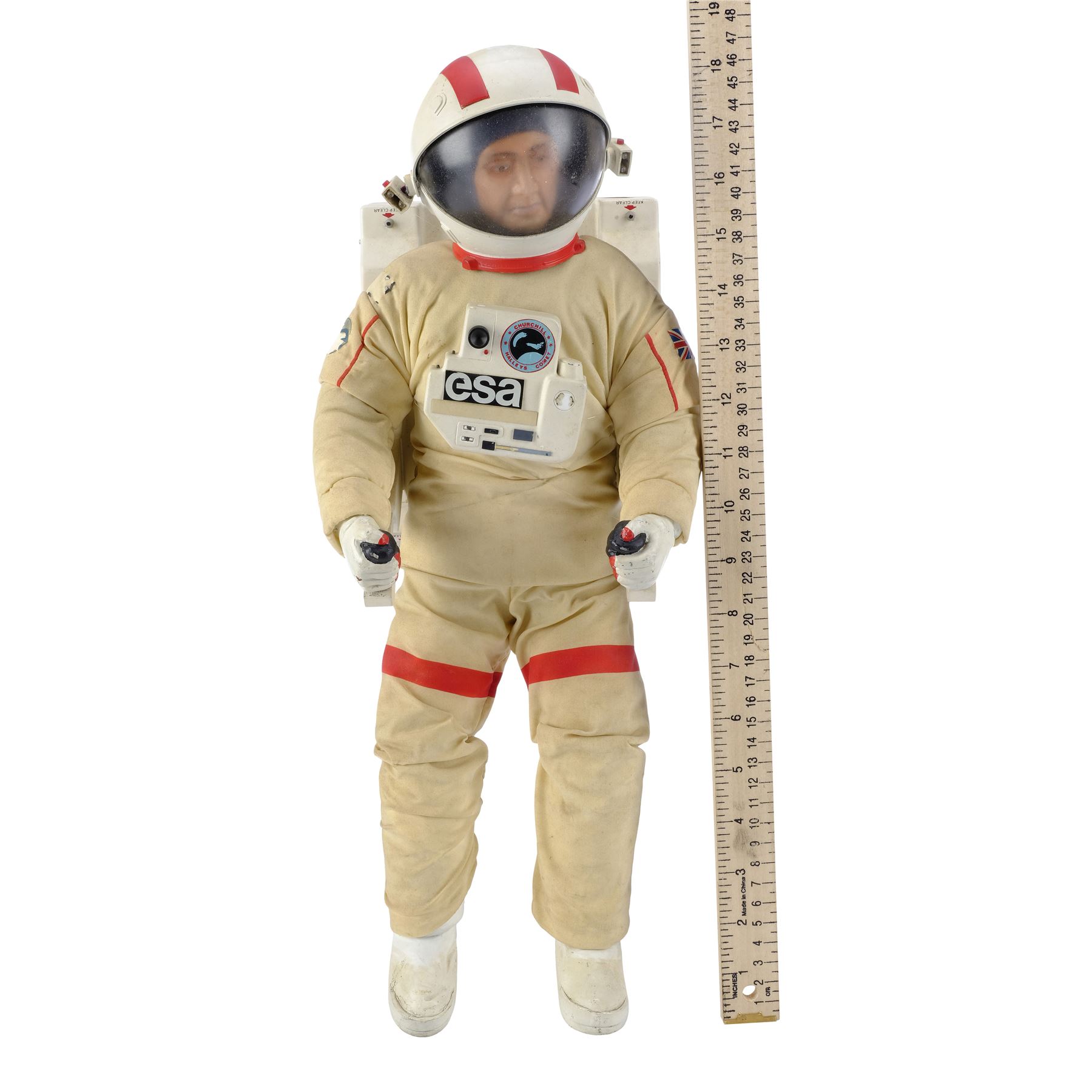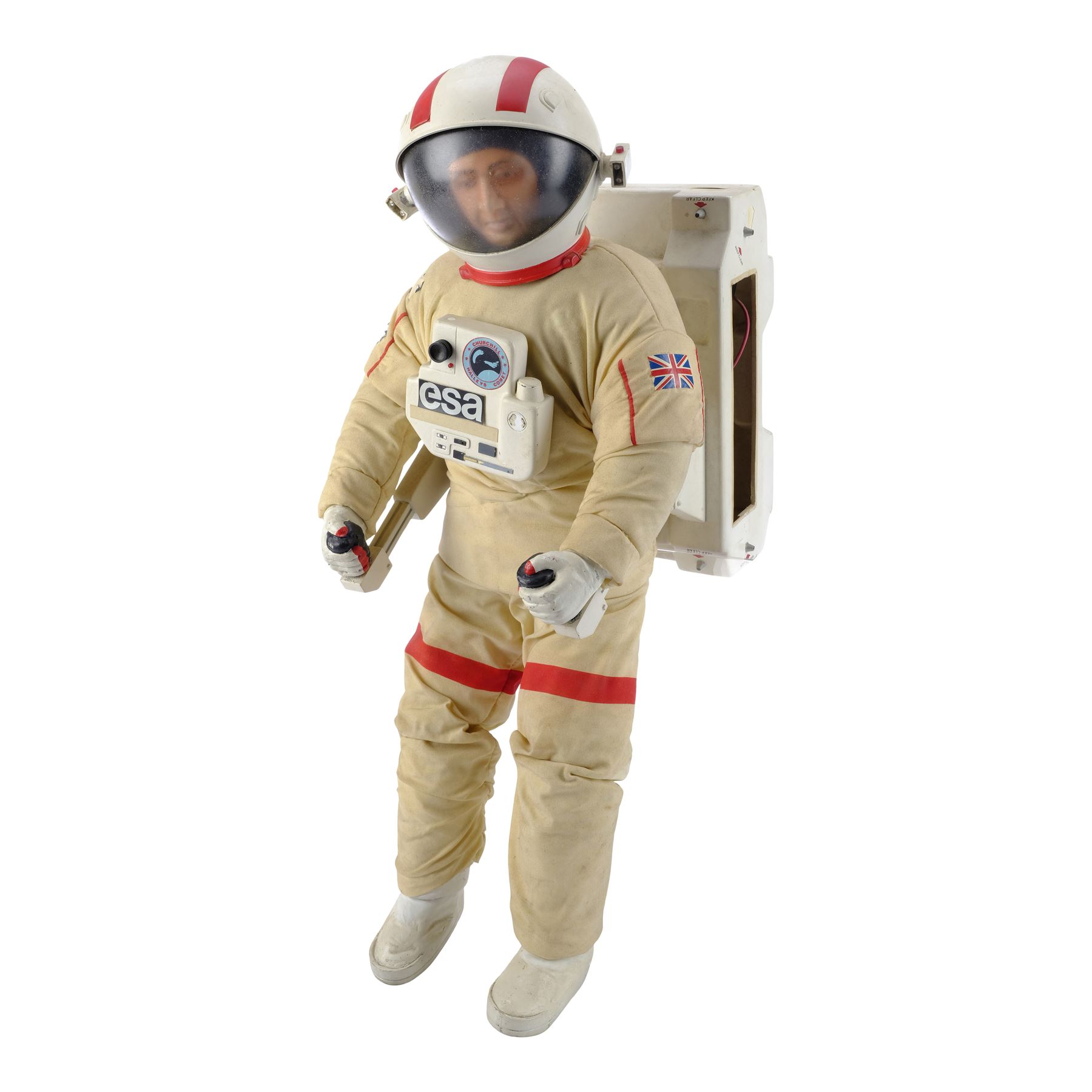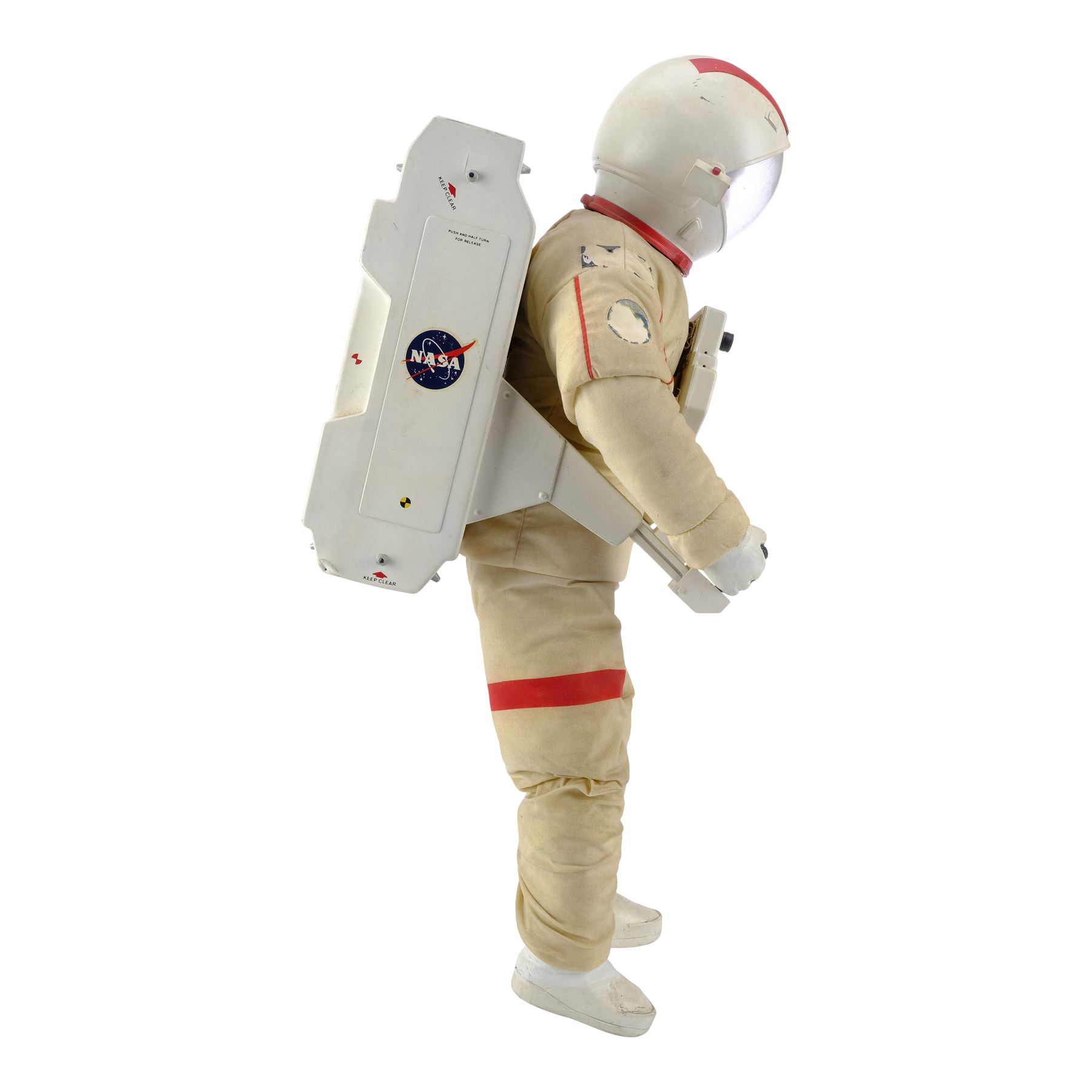 The body is made of plaster and dressed in a baggy Spandex spacesuit that is decorated with flag and emblem stickers at the shoulders. Attached to the chest via tape is a life-support-system box which is made of vacuum-formed plastic. The puppet is outfitted with a NASA Manned Manoeuvering Unit, which is made of vacuum-formed plastic and decorated with both US and UK flag stickers. The puppet previously had wires attached to suspend the piece and make the legs kick; however, these wires have since been cut. The prop exhibits some wear due to production use and age, including torn stickers and a missing compartment door on the Manned Manoeuvering Unit. Dimensions: 20.5 cm x 20.5 cm x 48.5 cm (8" x 8" x 19")