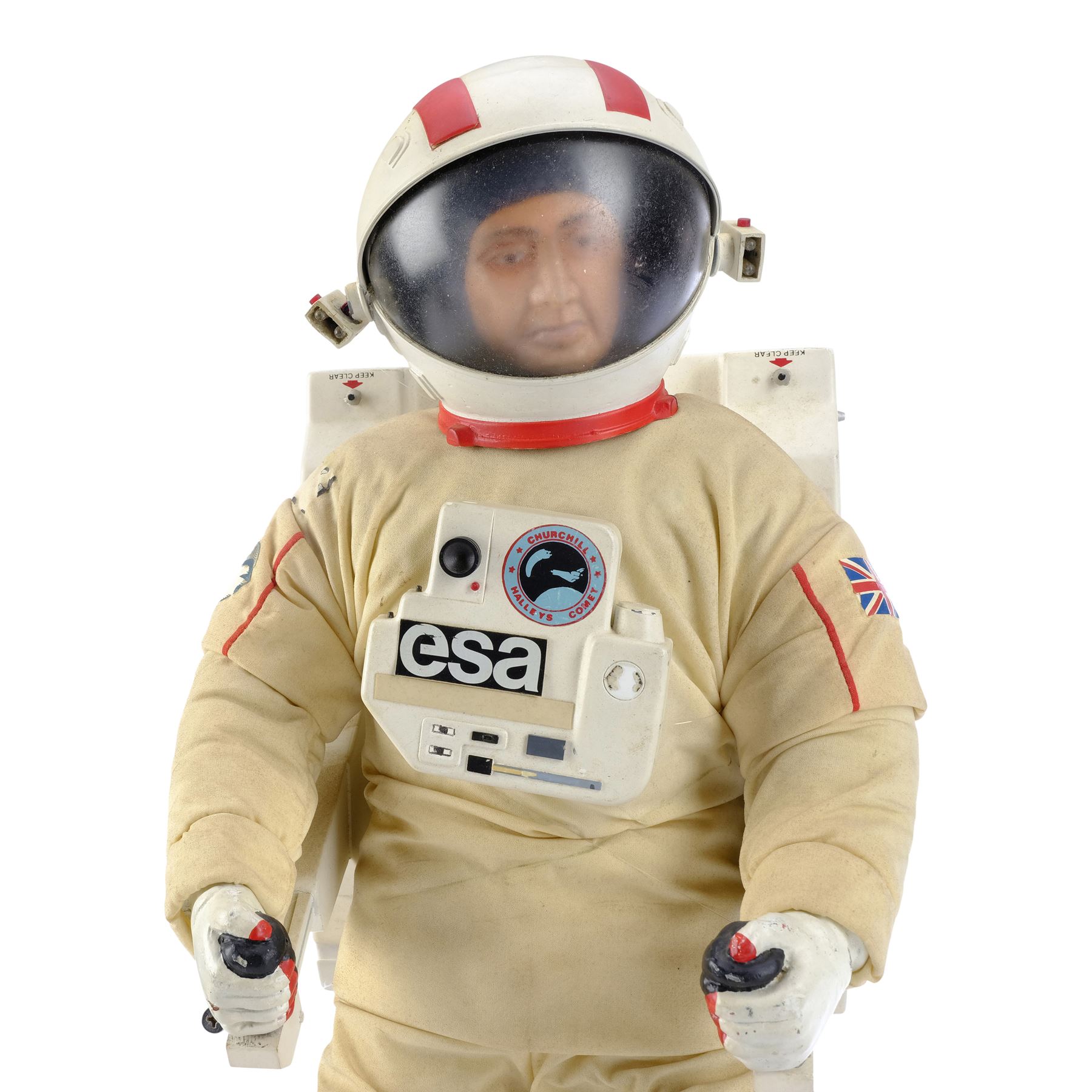 A Roger Derebridge (Nicholas Ball) miniature puppet with a Manned Manoeuvering Unit from Tobe Hooper's Lifeforce. British astronaut Derebridge donned a spacesuit when he ventured into an alien spaceship. Puppets were created for the model-miniature shots inside the spaceship.