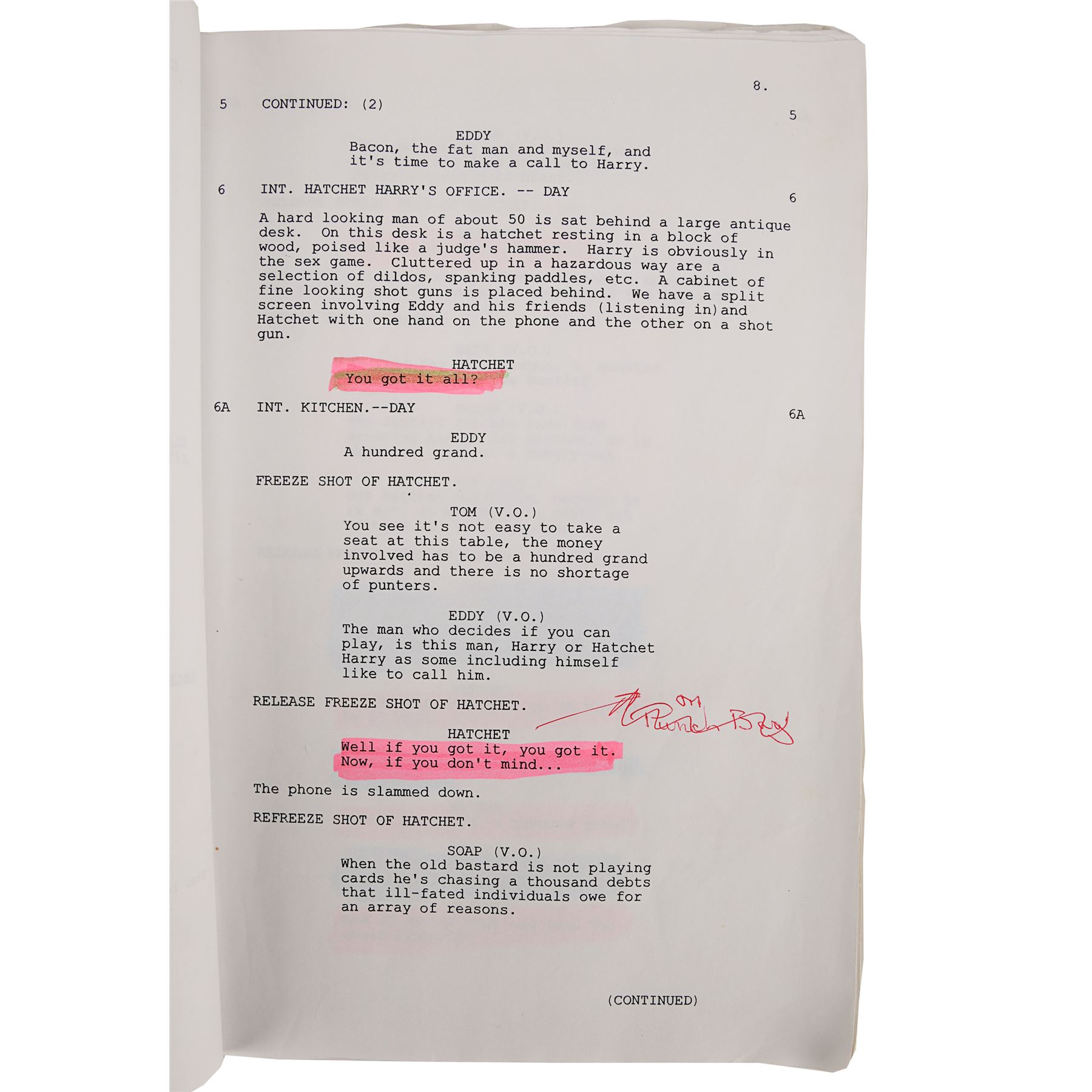 An annotated shooting script signed by P.H. Moriarty from the production of Guy Ritchie's crime film Lock, Stock and Two Smoking Barrels. Moriarty played murderous gangster "Hatchet" Harry Lonsdale, whom the protagonists owe money. This lot comes from P. H. Moriaty's personal collection.