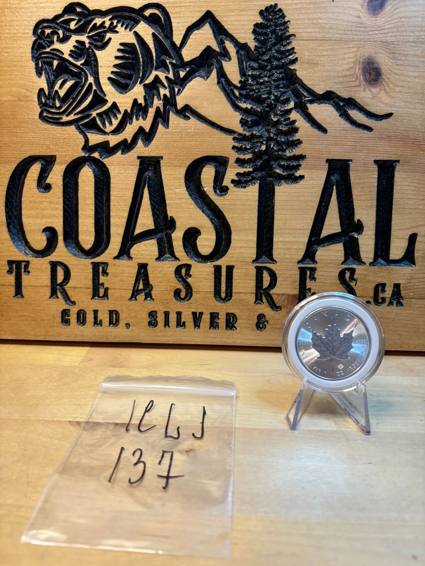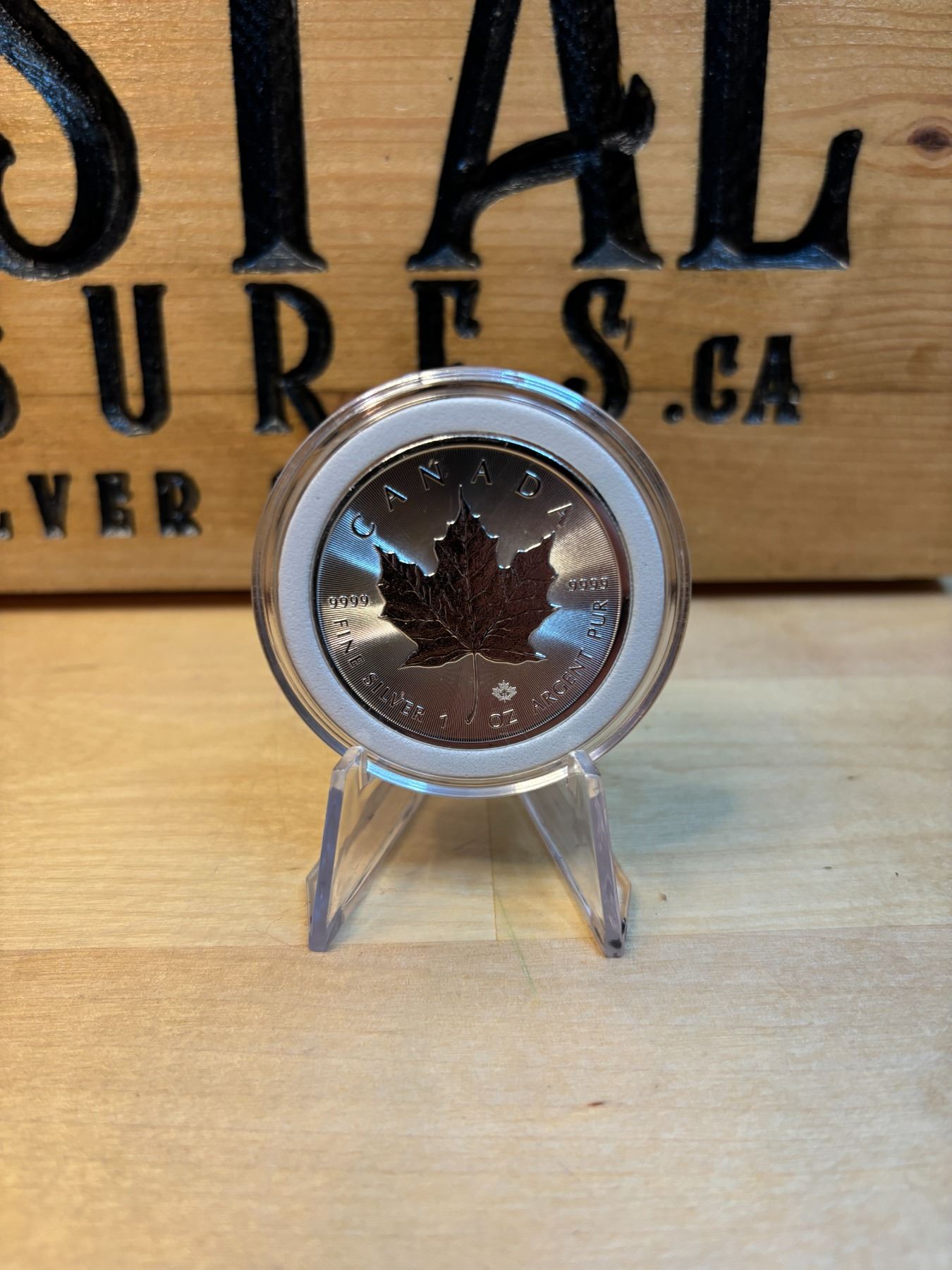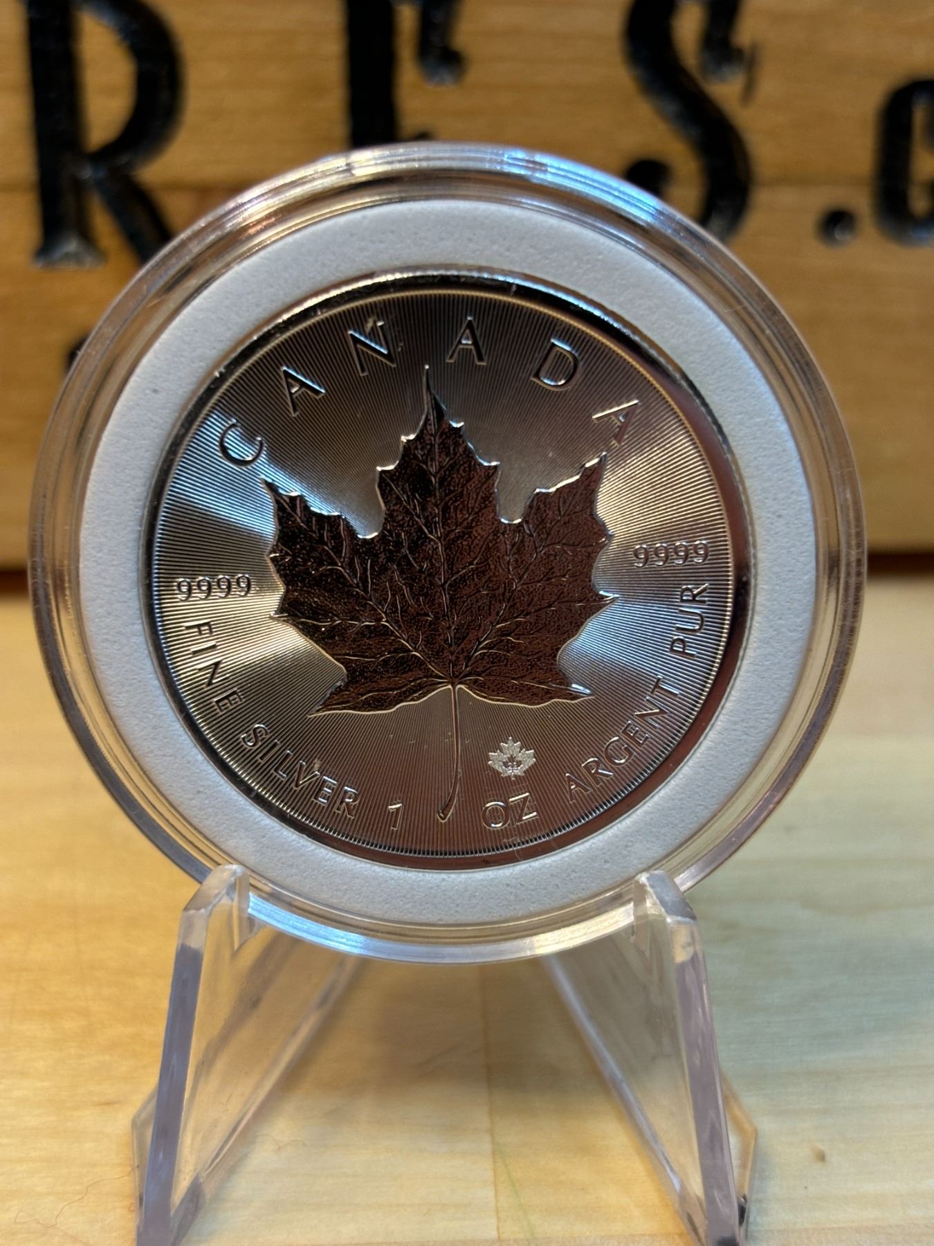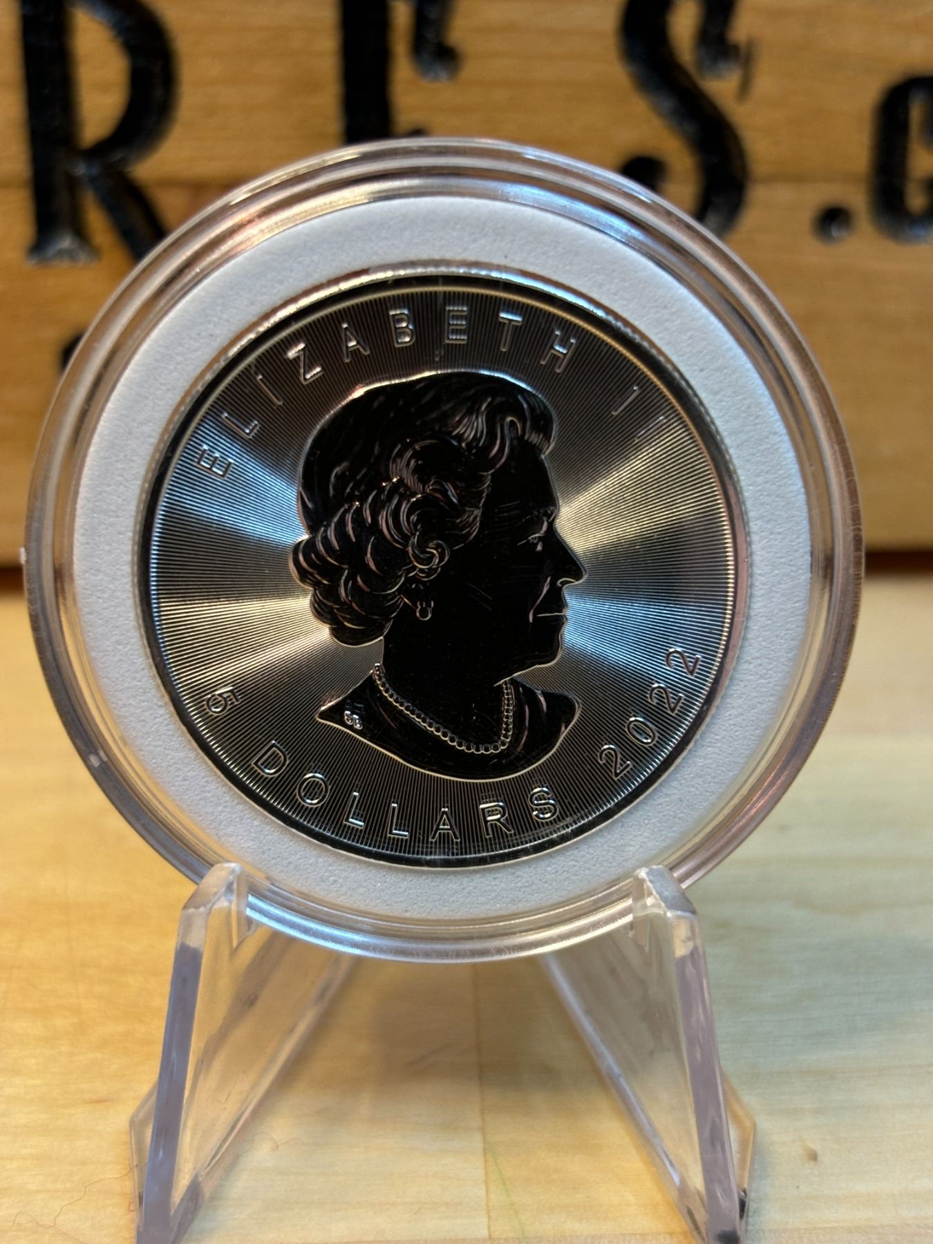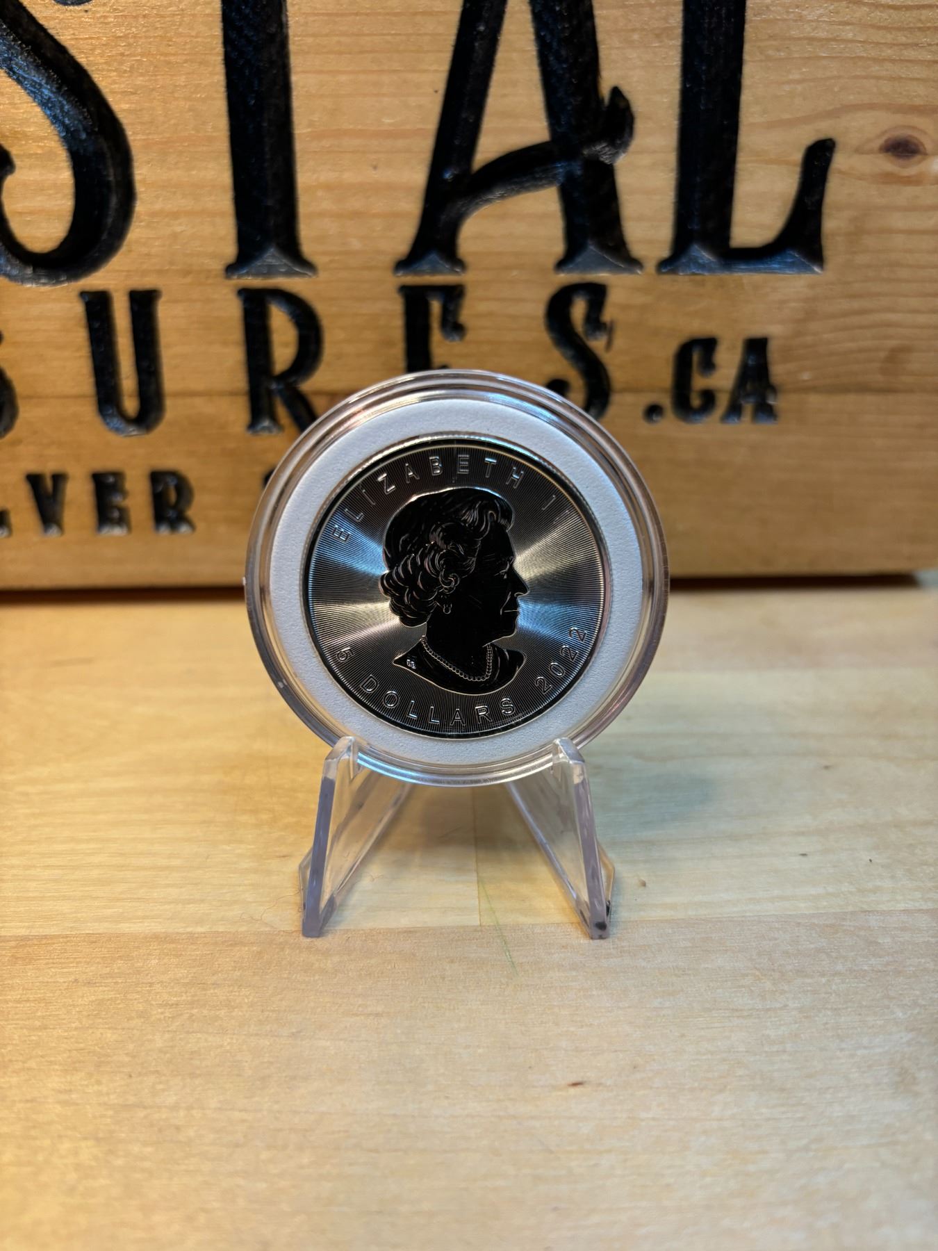 The 2022 1 oz Canadian Silver Maple Leaf is a .9999 fine silver coin minted by the Royal Canadian Mint. It features the iconic maple leaf on the reverse, with enhanced security features such as micro-engraved radial lines. The obverse showcases the new effigy of King Charles III, following the passing of Queen Elizabeth II, along with a face value of 5 Canadian dollars. Known for its high purity and craftsmanship, this coin is a favorite among collectors and investors.